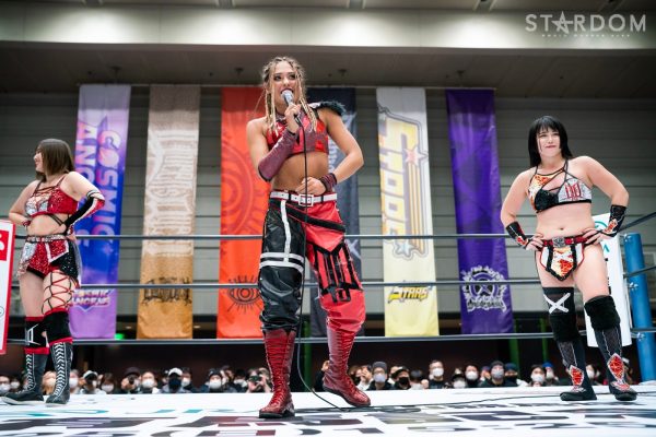 「テクラ~、自分の得意技で負けた屈辱は、どうですかあ(笑)。テクラ、SWAのベルトを落としてジュリアが戻ってきてからユーはジュリアの妹分? 私から見たらただのジュリアのオマケにしか見えないけど。オマエはスターダムになにをしに来たのかな? 前の団体とジュリアと同じ立ち位置のままでいいんだったらいいと思うけど、どうなの? 今日は感じたところはまだオマケ程度ってことで、次、NEW BLOODBでもあるからさ。NEW BLOODではKARMAと遊んでもらえたらいいんじゃないかなって。それでも物足りなければ私がまだまだお相手してあげますよ、オマケのちっちゃな蜘蛛さん」