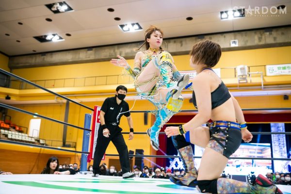 水森が「よろしくお願いします!」と握手を求め、朱里も負けじと大声で応じてゴング。手四つから水森が押し倒し足を取りにいく。朱里はヘッドシザーズも水森が反転。朱里が腕十字を狙うと水森がエスケープ。朱里のラリアットをかわして水森がジャンピングショルダータックル。ボディープレスは朱里が足を出して阻止。朱里のスリーパーを水森が脱出。しかし朱里はロープに追い込み臀部にキック。サッカーボールキックも連発で放ち、2カウント。朱里が串刺しニーアタック、水森が返すと朱里が押さえ込みの連続。水森がエルボーで向かっていくと朱里が受けて立つ。朱里のラリアットを水森がブロックしショルダースルー、ダイビングショルダータックル。朱里が返すと、水森がボディープレス。水森はカンパーナ狙いも朱里が切り返し腕十字から腕固め。さらにミドルキックからニーアタック、スタンディングギロチンを投下する。返した水森がカウンターでドロップキック、ラリアット。朱里が返すと水森はコーナーに叩きつけ突進、かわした朱里がバッククラッカー。水森がミドルキックをブロックしてラリアット連打。朱里が返すと、水森はダイビングボディープレス。返された水森がボディープレス、朱里がかわしてニーアタックから腕固め。水森がエスケープすると至近距離からラリアット。朱里がカウンターのハイキックも水森が返す。朱里はバズソーキックからカバーすると3カウントが入った。