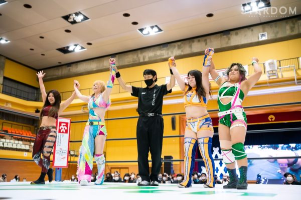 前日に対戦したばかりの壮麗と上谷が歩を進めて睨み合い。すると、MIRAIが壮麗を制して詩美と対峙し試合がスタート、腕の取り合いからMIRAIがヘッドロック。グラウンドに移行しカバーすると詩美が返す。上谷と壮麗がリングインしエルボーを打ち合う。壮麗がショルダータックルで上谷を吹っ飛ばすが詩美が乱入しダブルで壮麗を叩きつける。上谷がカバーするが2カウント。上谷がボディースラムを狙うが壮麗が切り返して反対に叩きつける。壮麗はMIRAIを呼び込みダブルで逆水平を連打。壮麗が逆エビ固めにいくが、上谷がエスケープ。MIRAIが上谷にショルダータックル、チンロック。MIRAIと上谷がエルボーの応酬。上谷がカウンターでドロップキック。詩美が壮麗にドロップキック、MIRAIを担いでバックフリップ。MIRAIがコーナーに上がった詩美をデッドリードライブで落とす。しかしMIRAIがエルボーアタック。壮麗がダブルチョップからアルゼンチン狙い。詩美がかわしてショルダータックルをぶつけ合う。壮麗が打ち勝つが詩美もやり返す。詩美がバックを取ると壮麗が切り返してラリアット。MIRAIが上谷をかいくぐるがドロップキックを食らう。上谷が串刺しニーアタックからドロップキック。10分経過。上谷の突進にMIRAIがエルボーアタック。MIRAIは串刺しラリアットも詩美が乱入し上谷と合体。MIRAIが返すと、上谷がスタークラッシャーの構え。MIRAIが切り返しアームロックへ。MIRAIと壮麗がクローズラインにいくが詩美がかわし上谷がスワンダイブ。MIRAIと壮麗がキャッチし詩美に投げつける。MIRAIは上谷へミサイルキック。MIRAIが上谷にバックドロップ狙い、壮麗が加わろうとするが上谷がまとめてフランケンシュタイナー。さらに場外へスワンダイブ式プランチャで飛ぶ。残り2分。詩美と上谷がミサイルキックでMIRAIを挟み撃ち。上谷がスタークラッシャーを狙うがMIRAIが切り返してラリアット。残り1分。MIRAIがラリアット連打も上谷が返す。詩美が壮麗にドロップキックもショルダータックルを食らう。MIRAIが上谷を担ぎ上げるが丸め込まれる。MIRAIが上谷を担ぎ上げて後方に投げつけるもタイムアップのゴングとなった。