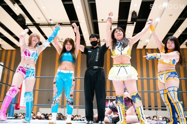 月山が天咲を指名し試合開始。天咲のドロップキックを月山がかわしヘッドロック。天咲がヘッドロックに切り返すと月山がロープに振ろうとするが、天咲が締め続ける。月山のエルボーに天咲も対抗。月山がエプロンに出てフェイントをかけるとコズエンがトリオで合体、ドロップキックで挟み撃ちにしてみせる。月山がボディースラムから突進すると詩美と上谷が乱入しドロップキック。詩美が月山に串刺しエルボー、ドロップキック。月山が返すと、詩美はボディースラムを連発。月山がエルボーで向かっていくと詩美が仁王立ちで受けて立つ。詩美が一発で倒しカバー。月山が返すと、詩美の突進にクロスボディー。白川が詩美に串刺しエルボー、ドロップキック。詩美を引き起こすと天咲が乱入もまとめてネックブリーカーを食らう。詩美が返すとコーナーに振られた白川が控えの上谷にエルボー。上谷が白川の顔面を何度も蹴飛ばす。白川が張り手も上谷が二段蹴り、ニールキック。白川が返すと、上谷のヒザへドロップキック、足4の字固め。しかしQQがカットする。上谷がスピンキックも白川がローリングエルボー。上谷の二段蹴りで両者ダウン状態。立ち上がるとエルボー乱打、髪をつかみ合う。白川は打撃の連打も上谷が押し倒す。なつぽいが天咲に突進すると詩美が援護して天咲がドロップキック。上谷が場外へスワンダイブ式プランチャ。QQが3人でなつぽいにドロップキック。天咲がカバーもなつぽいが返す。天咲がネックブリーカードロップもコズエンがカット。天咲はなつぽいを引き起こし天聖狙い。なつぽいが切り返すと月山がコンプリートショットで援護し、なつぽいがドロップキック。10分経過。なつぽいがコーナーに上がると上谷がカットも白川に落とされる。月山が天咲にミサイルキック、なつぽいがバックを取るが天咲が天橋立。コズエンがトリオで天咲にカカト落とし。なつぽいがフェアリアルギフトを投下すると天咲が返せず3カウントが入った。試合後は上谷と白川が張り手を打ち合い乱闘に。