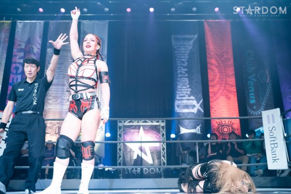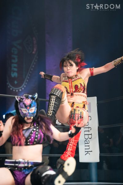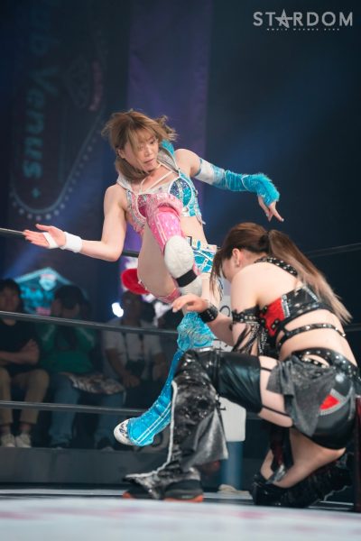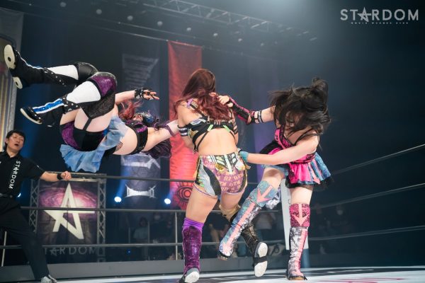 MIRAI&壮麗亜美組を破りゴッデス・オブ・スターダム王座を奪取したクラブビーナスの白川未奈&マライア・メイ組が月山和香を加え、ドンナ・デル・モンドのジュリア&舞華&桜井まい組と対戦。ジュリア&桜井はテクラを加えてアーティスト・オブ・スターダム王座を保持しており、ゴッデスvsアーティストの図式にもなった。翌日の横浜武道館では朱里&壮麗亜美組とのタッグマッチを急きょタイトル戦にした白川&マライアにとっては勢いを持続、加速させたい闘いだが…。