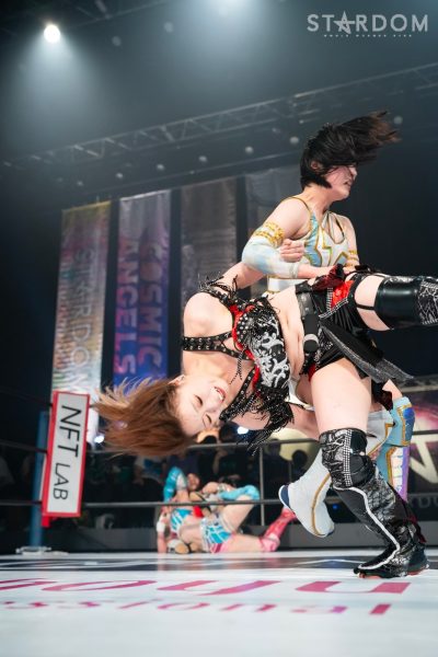 中野たむ&なつぽいのメルティアにコズミックエンジェルズ見習いの水森由菜が合流、コズエン入りを懸けた闘い&ダイエットの真っただ中で水森が中野&なつぽいをどうサポートし勝利につなげるか、この試合でポイントを稼いでおきたいところだろう。とはいえ、相手はMIRAI&壮麗亜美の前ゴッデス・オブ・スターダム王者組だけに苦戦も予想される。とくにMIRAIは翌日の横浜武道館で中野のワンダー・オブ・スターダム王座に挑戦。シンデレラ・トーナメント2連覇に実績をひっさげての白いベルト挑戦とあって、この試合でどこまで中野を焦らせられるかがカギとなる。ゴッズアイの2人と組むのは新人のHANAKO。高橋奈七永からパッションを注入されてから最初の試合とあって、より大きなスケールでの闘いが期待される。