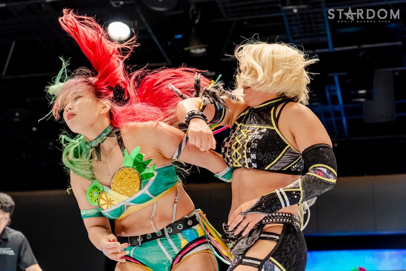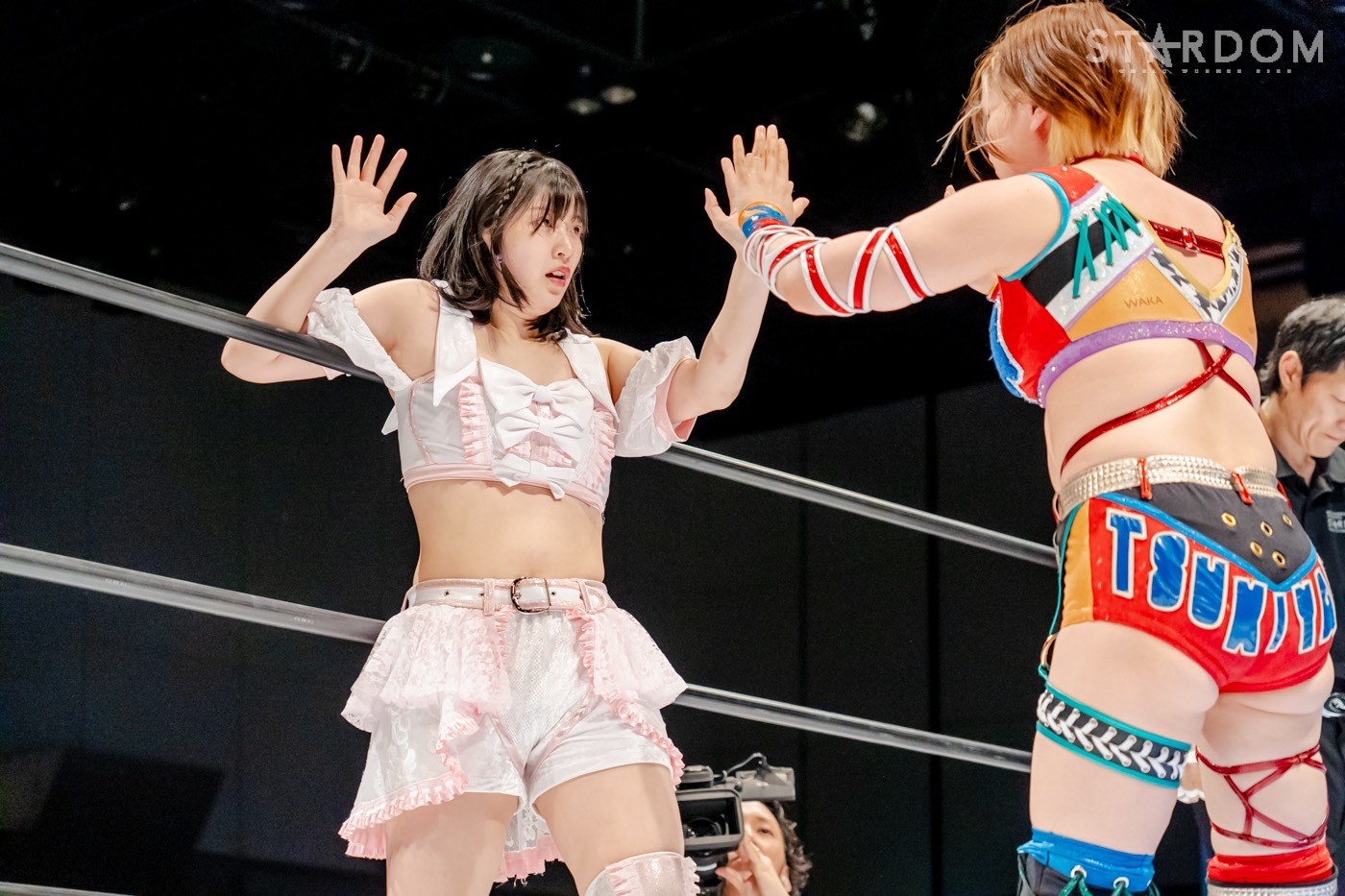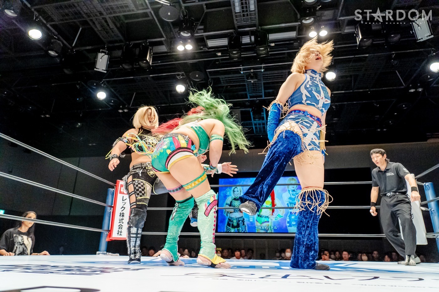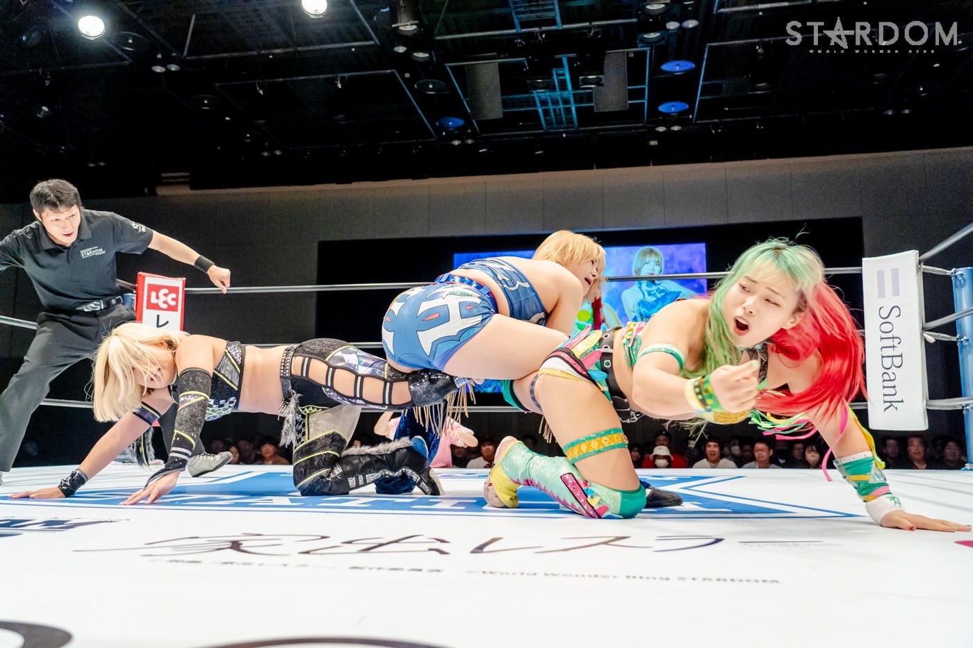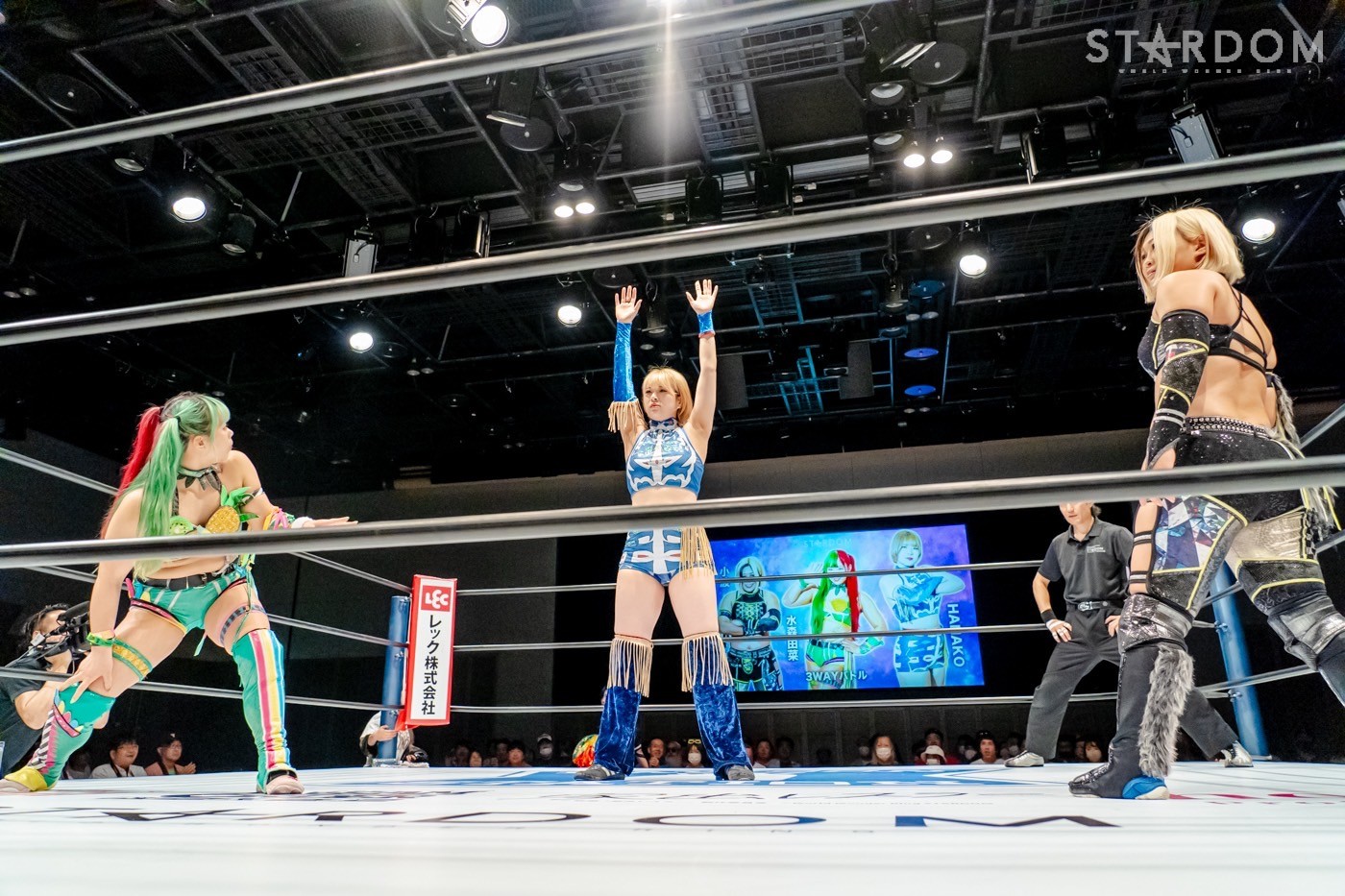 小波、水森由菜、HANAKOが一度に闘う3WAYマッチ。前日の熊本大会は水森にとってスターダムで2度目の凱旋だった。同大会ではコズミックエンジェルズの安納サオリとのシングル初対決でメンバー全員とのシングルを経験。小波、HANAKOと対戦する今大会は、水森新章のスタートとなりそうだ。