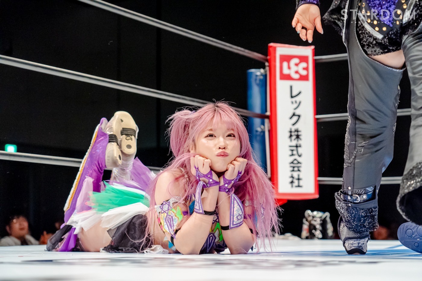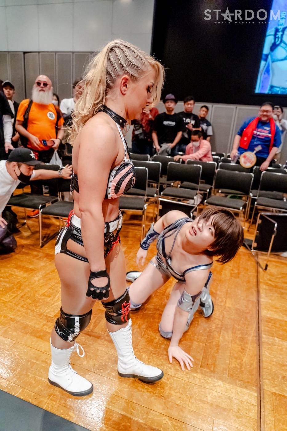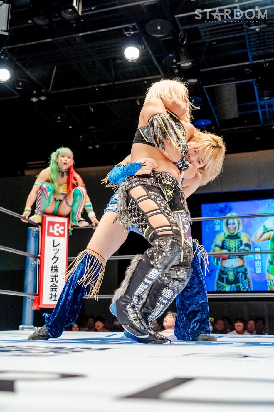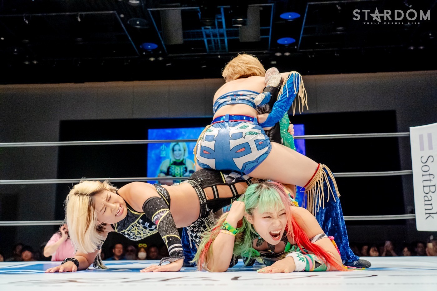 小波、水森由菜、HANAKOが一度に闘う3WAYマッチ。前日の熊本大会は水森にとってスターダムで2度目の凱旋だった。同大会ではコズミックエンジェルズの安納サオリとのシングル初対決でメンバー全員とのシングルを経験。小波、HANAKOと対戦する今大会は、水森新章のスタートとなりそうだ。