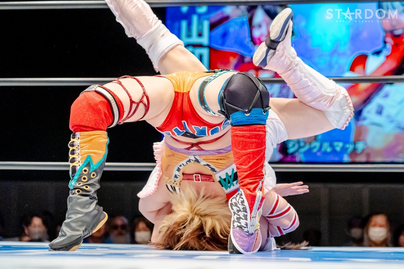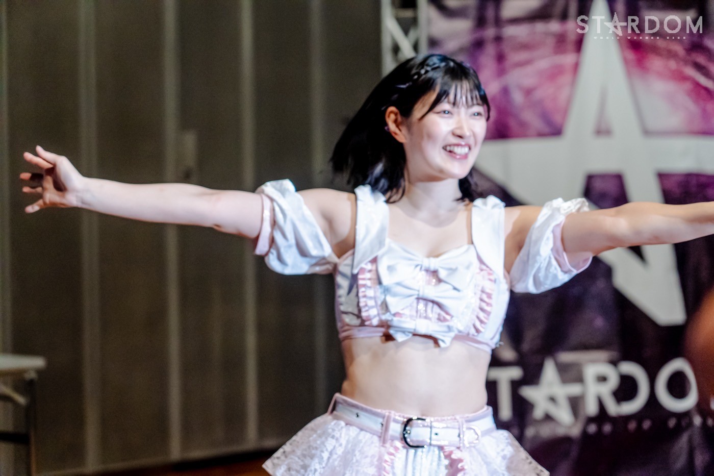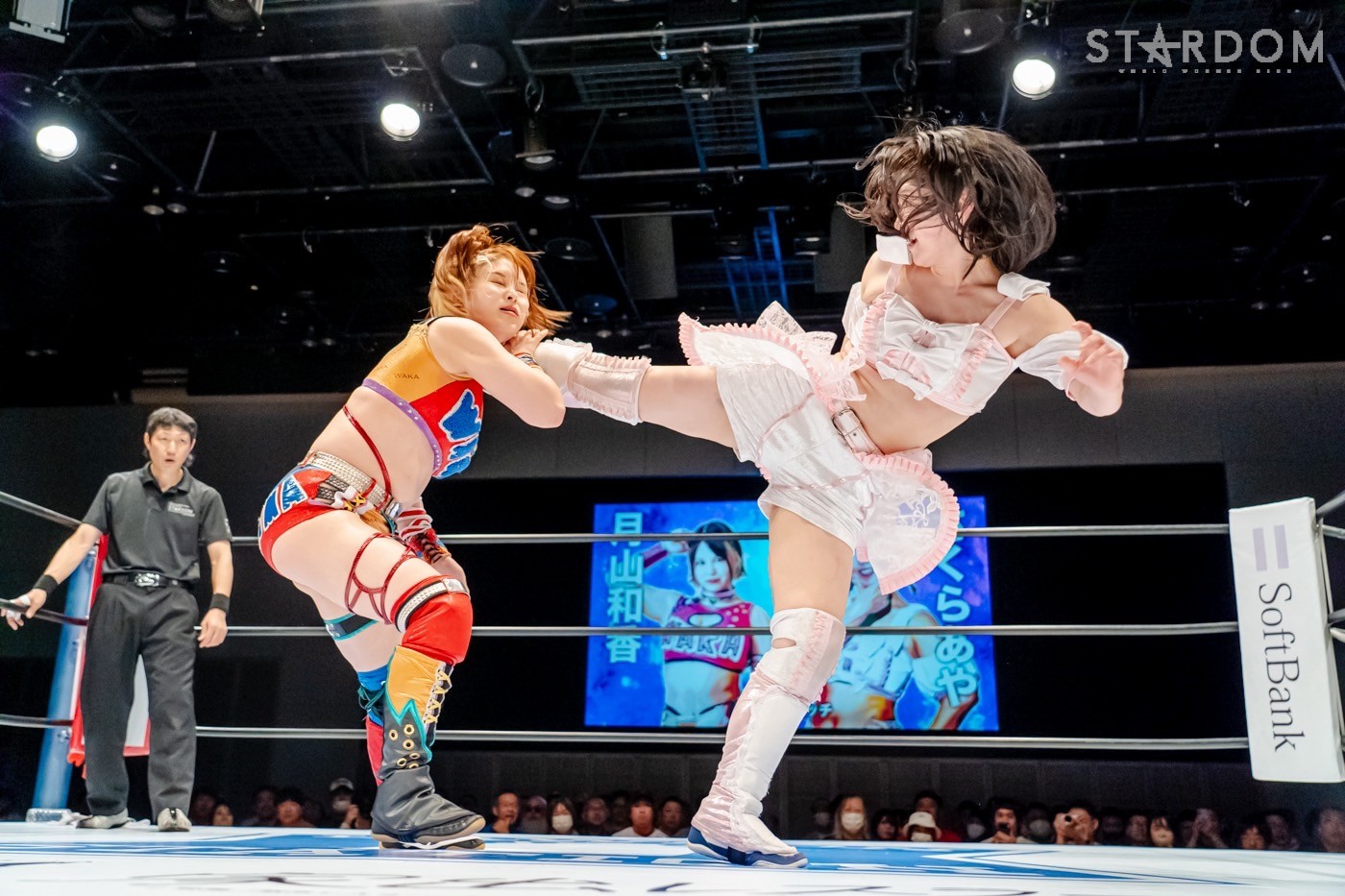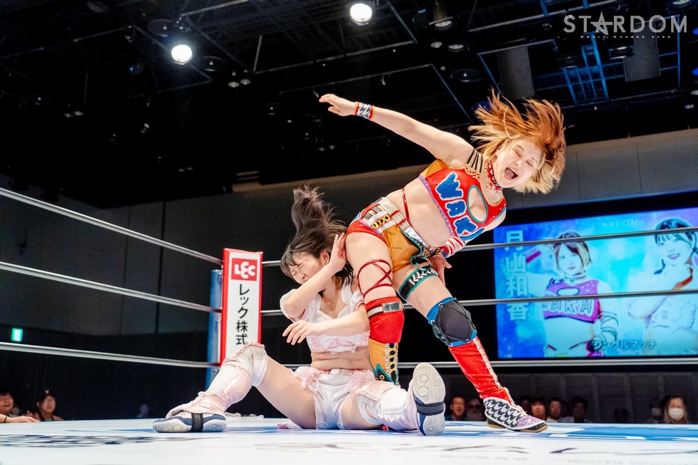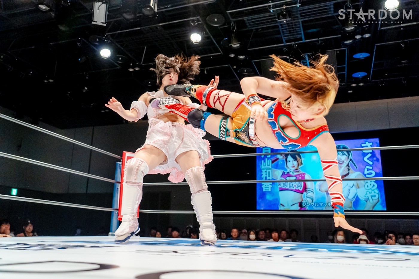 小波、水森由菜、HANAKOが一度に闘う3WAYマッチ。前日の熊本大会は水森にとってスターダムで2度目の凱旋だった。同大会ではコズミックエンジェルズの安納サオリとのシングル初対決でメンバー全員とのシングルを経験。小波、HANAKOと対戦する今大会は、水森新章のスタートとなりそうだ。