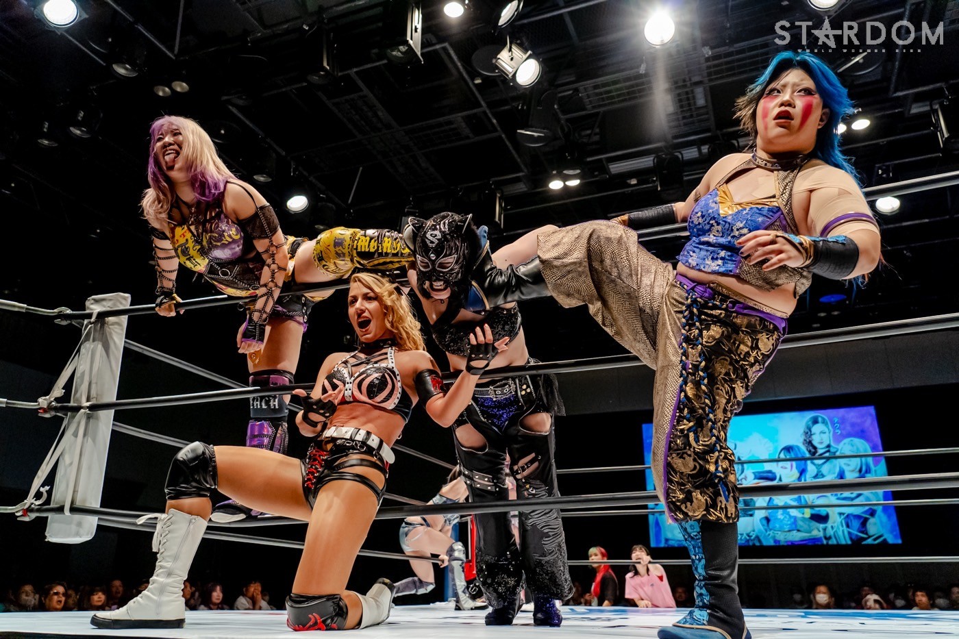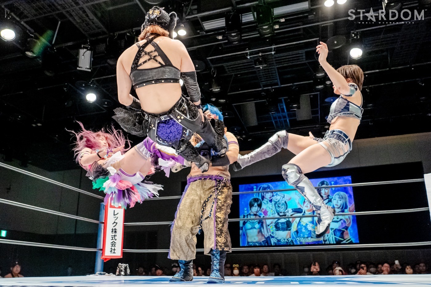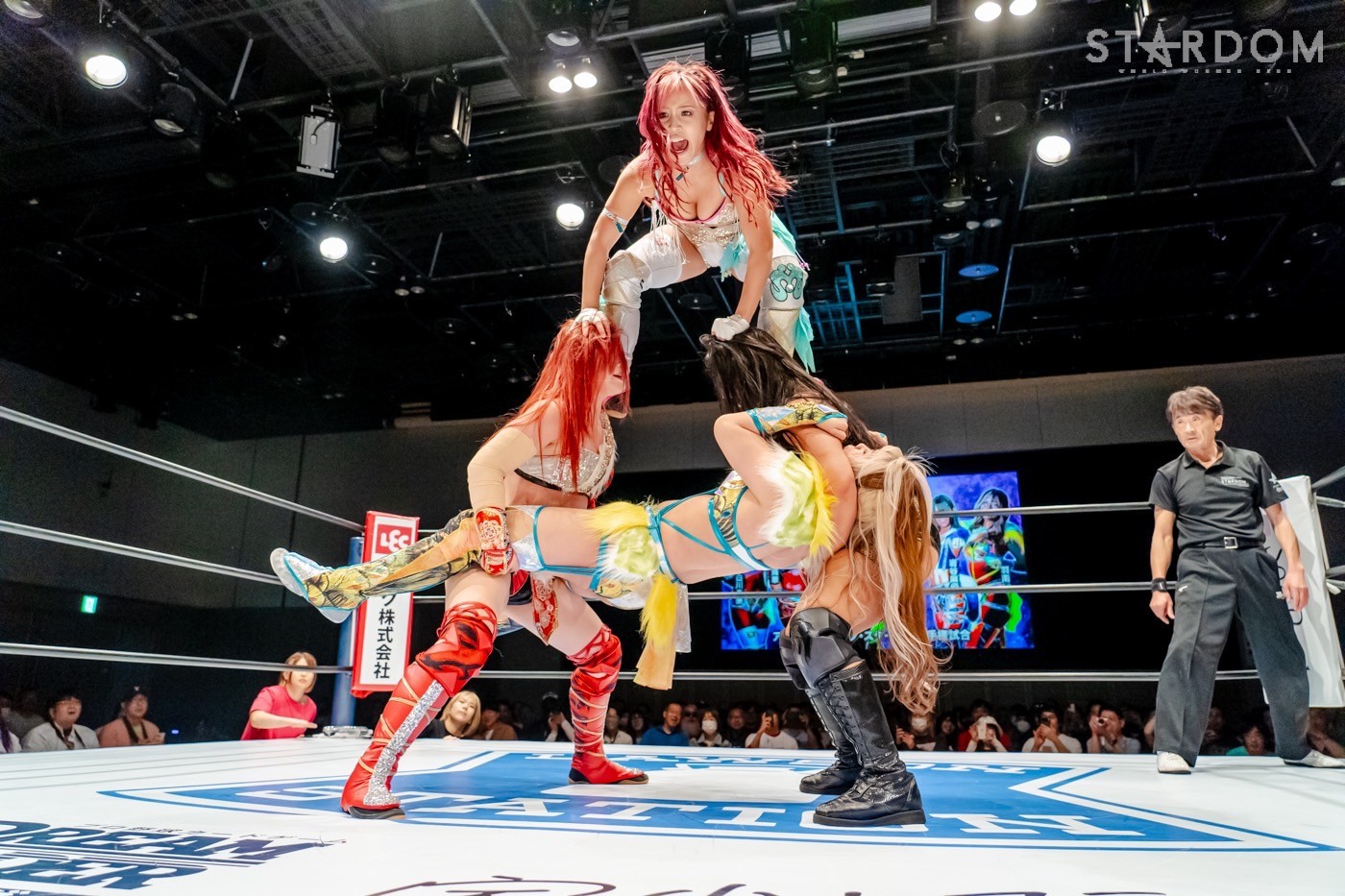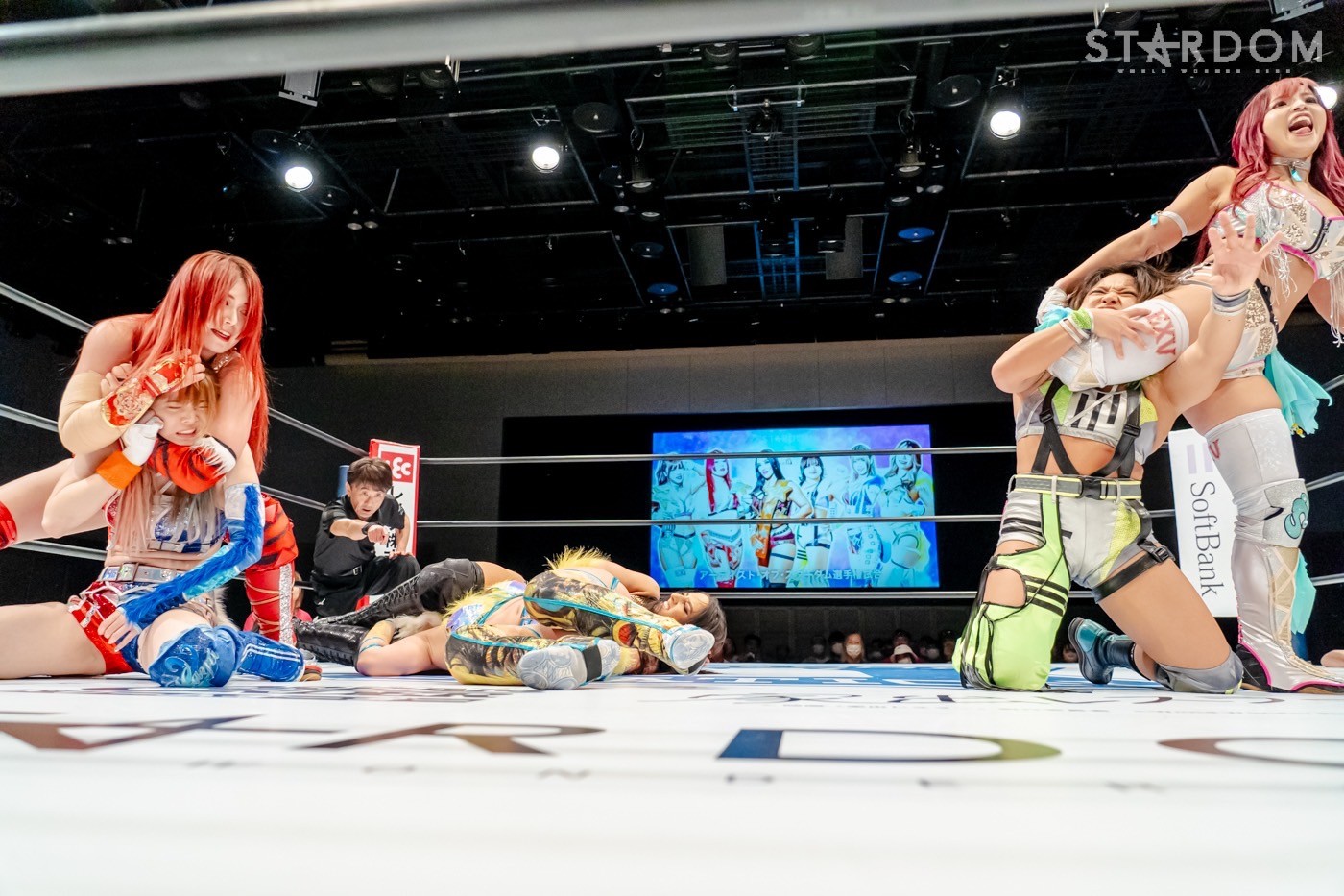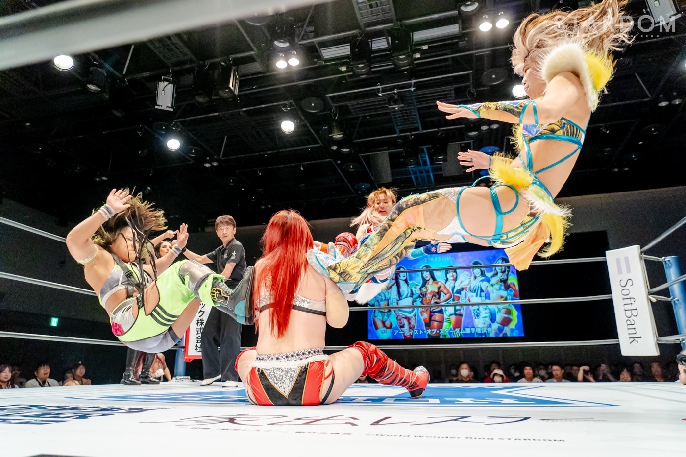 舞華と飯田が先発に名乗り。手四つでの力比べでスタートし、ロックアップでも力比べ。舞華がヘッドロックに取ると、飯田がロープに振りショルダーをぶつけ合う。舞華が「オマエがいけ」と指示。飯田が「オマエなんか倒してやるよ」とショルダータックル。舞華がショルダータックルで飯田を吹っ飛ばすが、STARSが連係で舞華を攻める。羽南が舞華の後方からニーアタック、ドロップキック。舞華が先を読んでショルダータックル。EXVがトリオで羽南に変則ドロップキック。舞華はボディースラムを羽南に連発。白川が羽南のヒザにドロップキック、サッカーボールキック。岩谷がカットし羽南と合体も、まとめてネックブリーカーを食らう。ジーナが羽南に串刺しボディーアタック、串刺しドロップキック。羽南が返すと、ジーナがヘッドシザーズ。舞華と白川もサブミッションでカットを防ぐ。羽南がエスケープすると、ジーナの突進を止めてマットに叩きつける。飯田がジーナへブレーンバスターの構え。舞華がカットするが飯田がジーナを舞華の上に投げ捨てる。さらにまとめてスライディングラリアット。白川が入るも飯田がショルダータックル。STARSがトリオでドロップキック。飯田とジーナがチョップの打ち合い。ジーナが走ろうとする飯田を止めて変型ブレーンバスター。白川が飯田にネックブリーカー、串刺しで突進。飯田がかわすが白川は延髄斬り、DDT。飯田が返すと、白川はインプラントDDT狙い。岩谷がカットし、飯田がジャンピングチョップ。岩谷が白川に串刺しアタック、ドロップキック。蹴りのかわし合いからエルボーが交錯、岩谷がトラースキック、白川がバックブロー、バックドロップ。ハイキックが交錯し、岩谷と白川がダウン。10分経過。羽南が舞華にエルボー連打。白川が串刺しエルボー、飯田も続き、バックエルボーのサンドイッチ攻撃。羽南は舞華にエルボースマッシュ、コーナーに上がるとジーナがカットし雪崩式パワースラム。舞華が滞空時間の長いブレーンバスターも羽南が返す。羽南が払い腰、STARSが合体フェースクラッシャー。羽南が舞華に突進するがジーナが阻止。EXVでビーナスタワーを敢行。舞華がカバーするが岩谷がカット。岩谷と飯田がドロップキックでEXVを場外に送り出す。岩谷がトペスイシーダで飛び、羽南が舞華にランニングエルボースマッシュ、フェイマサ―。15分経過。舞華が返すと、STARSが合体、羽南がブロックバスターホールド。羽南はフィニッシュを宣言し、舞華にバックドロップの構え。白川がカットし舞華と合体、羽南をマットに叩きつけ、舞華が山茶華。乱戦から羽南がブロックバスター、舞華がラリアット。羽南が炎華落としを切り返しセブンティーン。舞華が返すと、羽南の突進をジーナと舞華で止めて前方に叩きつける。そして舞華がみちのくドライバー。羽南が返せず王者組の防衛となった。