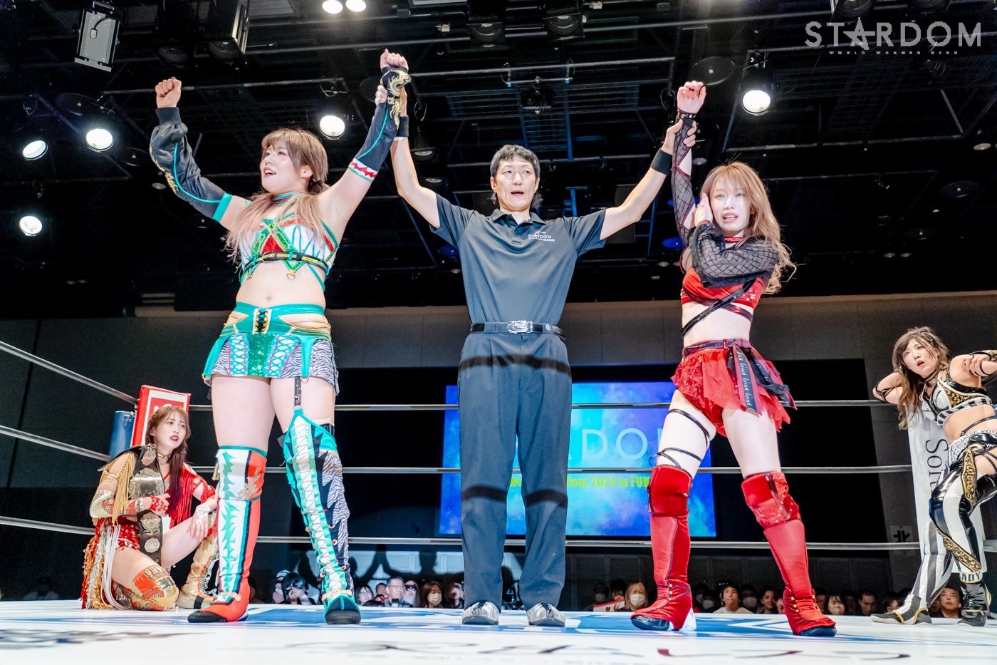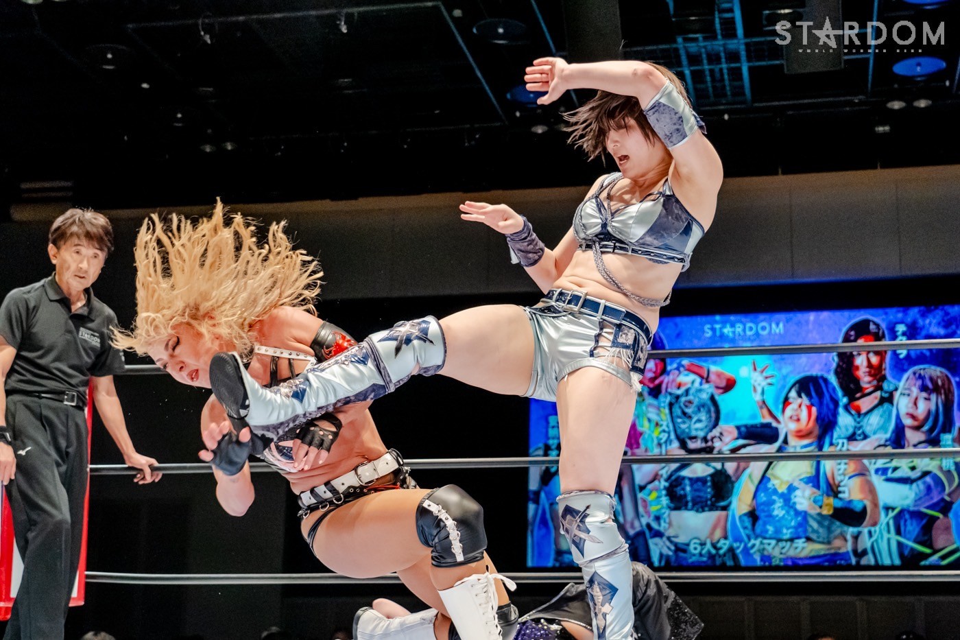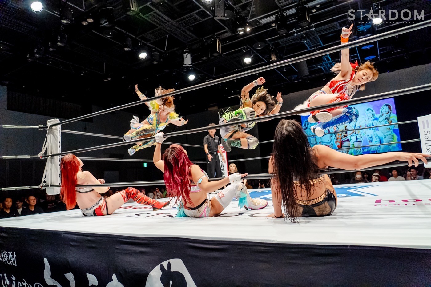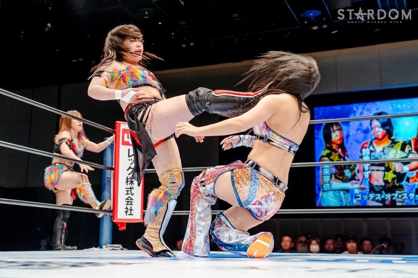 舞華と飯田が先発に名乗り。手四つでの力比べでスタートし、ロックアップでも力比べ。舞華がヘッドロックに取ると、飯田がロープに振りショルダーをぶつけ合う。舞華が「オマエがいけ」と指示。飯田が「オマエなんか倒してやるよ」とショルダータックル。舞華がショルダータックルで飯田を吹っ飛ばすが、STARSが連係で舞華を攻める。羽南が舞華の後方からニーアタック、ドロップキック。舞華が先を読んでショルダータックル。EXVがトリオで羽南に変則ドロップキック。舞華はボディースラムを羽南に連発。白川が羽南のヒザにドロップキック、サッカーボールキック。岩谷がカットし羽南と合体も、まとめてネックブリーカーを食らう。ジーナが羽南に串刺しボディーアタック、串刺しドロップキック。羽南が返すと、ジーナがヘッドシザーズ。舞華と白川もサブミッションでカットを防ぐ。羽南がエスケープすると、ジーナの突進を止めてマットに叩きつける。飯田がジーナへブレーンバスターの構え。舞華がカットするが飯田がジーナを舞華の上に投げ捨てる。さらにまとめてスライディングラリアット。白川が入るも飯田がショルダータックル。STARSがトリオでドロップキック。飯田とジーナがチョップの打ち合い。ジーナが走ろうとする飯田を止めて変型ブレーンバスター。白川が飯田にネックブリーカー、串刺しで突進。飯田がかわすが白川は延髄斬り、DDT。飯田が返すと、白川はインプラントDDT狙い。岩谷がカットし、飯田がジャンピングチョップ。岩谷が白川に串刺しアタック、ドロップキック。蹴りのかわし合いからエルボーが交錯、岩谷がトラースキック、白川がバックブロー、バックドロップ。ハイキックが交錯し、岩谷と白川がダウン。10分経過。羽南が舞華にエルボー連打。白川が串刺しエルボー、飯田も続き、バックエルボーのサンドイッチ攻撃。羽南は舞華にエルボースマッシュ、コーナーに上がるとジーナがカットし雪崩式パワースラム。舞華が滞空時間の長いブレーンバスターも羽南が返す。羽南が払い腰、STARSが合体フェースクラッシャー。羽南が舞華に突進するがジーナが阻止。EXVでビーナスタワーを敢行。舞華がカバーするが岩谷がカット。岩谷と飯田がドロップキックでEXVを場外に送り出す。岩谷がトペスイシーダで飛び、羽南が舞華にランニングエルボースマッシュ、フェイマサ―。15分経過。舞華が返すと、STARSが合体、羽南がブロックバスターホールド。羽南はフィニッシュを宣言し、舞華にバックドロップの構え。白川がカットし舞華と合体、羽南をマットに叩きつけ、舞華が山茶華。乱戦から羽南がブロックバスター、舞華がラリアット。羽南が炎華落としを切り返しセブンティーン。舞華が返すと、羽南の突進をジーナと舞華で止めて前方に叩きつける。そして舞華がみちのくドライバー。羽南が返せず王者組の防衛となった。