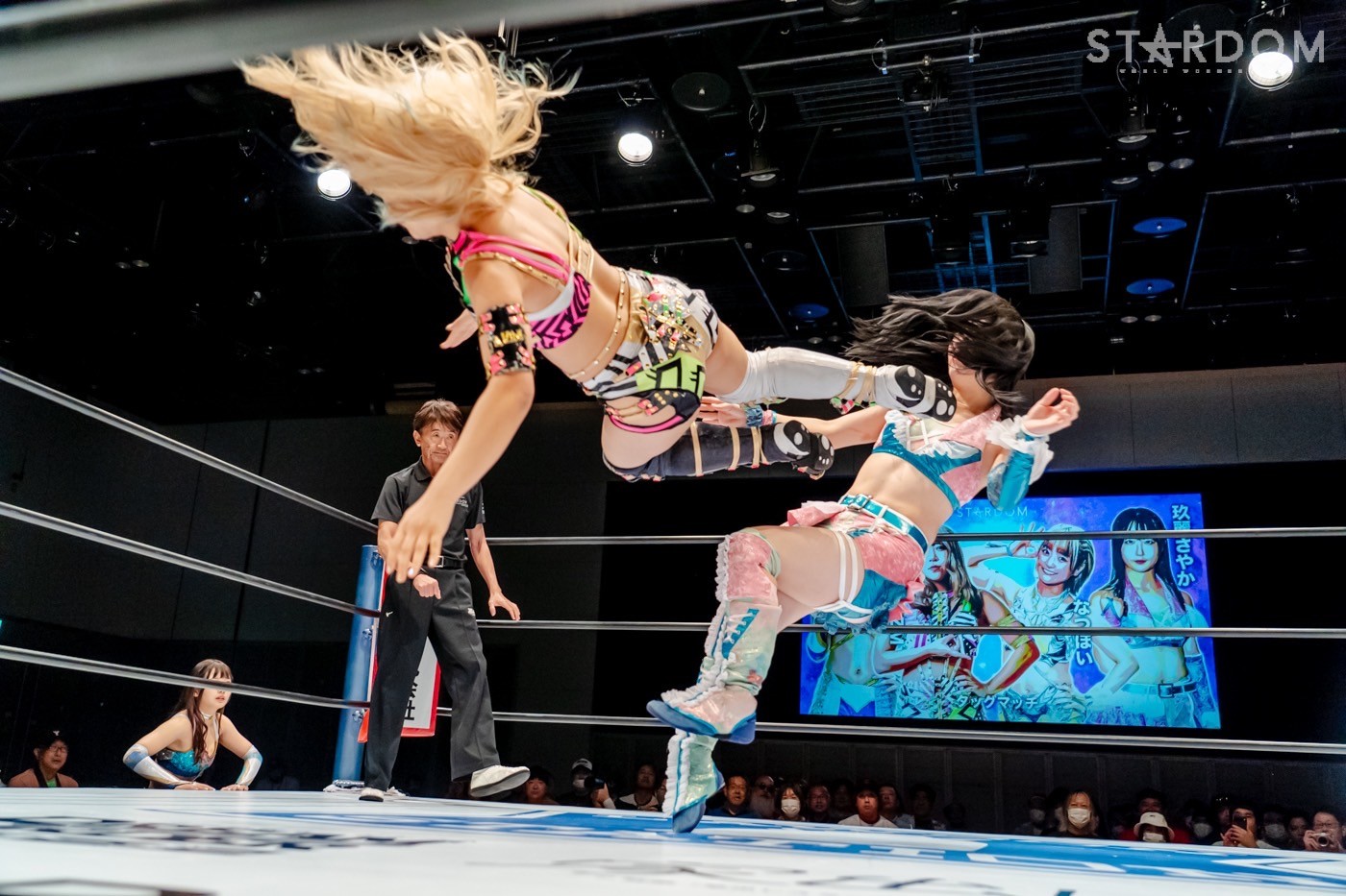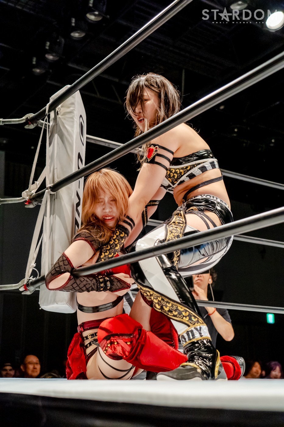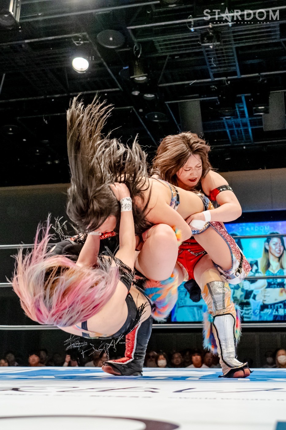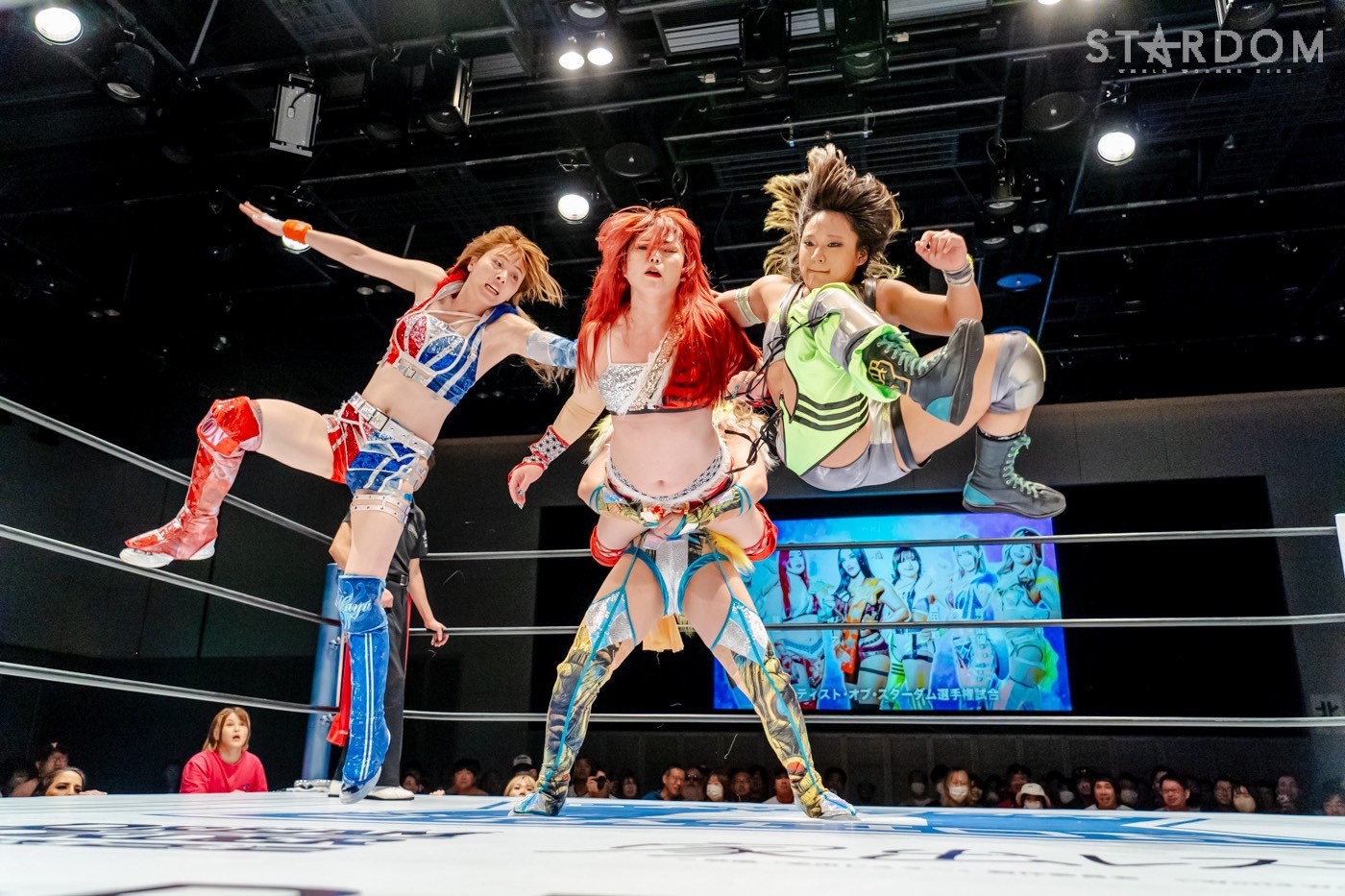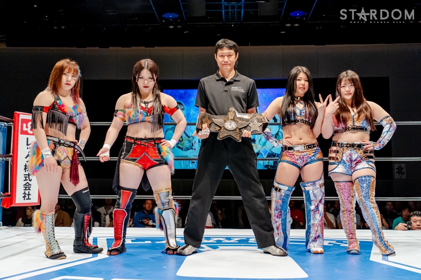 舞華と飯田が先発に名乗り。手四つでの力比べでスタートし、ロックアップでも力比べ。舞華がヘッドロックに取ると、飯田がロープに振りショルダーをぶつけ合う。舞華が「オマエがいけ」と指示。飯田が「オマエなんか倒してやるよ」とショルダータックル。舞華がショルダータックルで飯田を吹っ飛ばすが、STARSが連係で舞華を攻める。羽南が舞華の後方からニーアタック、ドロップキック。舞華が先を読んでショルダータックル。EXVがトリオで羽南に変則ドロップキック。舞華はボディースラムを羽南に連発。白川が羽南のヒザにドロップキック、サッカーボールキック。岩谷がカットし羽南と合体も、まとめてネックブリーカーを食らう。ジーナが羽南に串刺しボディーアタック、串刺しドロップキック。羽南が返すと、ジーナがヘッドシザーズ。舞華と白川もサブミッションでカットを防ぐ。羽南がエスケープすると、ジーナの突進を止めてマットに叩きつける。飯田がジーナへブレーンバスターの構え。舞華がカットするが飯田がジーナを舞華の上に投げ捨てる。さらにまとめてスライディングラリアット。白川が入るも飯田がショルダータックル。STARSがトリオでドロップキック。飯田とジーナがチョップの打ち合い。ジーナが走ろうとする飯田を止めて変型ブレーンバスター。白川が飯田にネックブリーカー、串刺しで突進。飯田がかわすが白川は延髄斬り、DDT。飯田が返すと、白川はインプラントDDT狙い。岩谷がカットし、飯田がジャンピングチョップ。岩谷が白川に串刺しアタック、ドロップキック。蹴りのかわし合いからエルボーが交錯、岩谷がトラースキック、白川がバックブロー、バックドロップ。ハイキックが交錯し、岩谷と白川がダウン。10分経過。羽南が舞華にエルボー連打。白川が串刺しエルボー、飯田も続き、バックエルボーのサンドイッチ攻撃。羽南は舞華にエルボースマッシュ、コーナーに上がるとジーナがカットし雪崩式パワースラム。舞華が滞空時間の長いブレーンバスターも羽南が返す。羽南が払い腰、STARSが合体フェースクラッシャー。羽南が舞華に突進するがジーナが阻止。EXVでビーナスタワーを敢行。舞華がカバーするが岩谷がカット。岩谷と飯田がドロップキックでEXVを場外に送り出す。岩谷がトペスイシーダで飛び、羽南が舞華にランニングエルボースマッシュ、フェイマサ―。15分経過。舞華が返すと、STARSが合体、羽南がブロックバスターホールド。羽南はフィニッシュを宣言し、舞華にバックドロップの構え。白川がカットし舞華と合体、羽南をマットに叩きつけ、舞華が山茶華。乱戦から羽南がブロックバスター、舞華がラリアット。羽南が炎華落としを切り返しセブンティーン。舞華が返すと、羽南の突進をジーナと舞華で止めて前方に叩きつける。そして舞華がみちのくドライバー。羽南が返せず王者組の防衛となった。