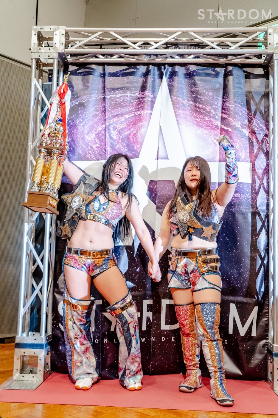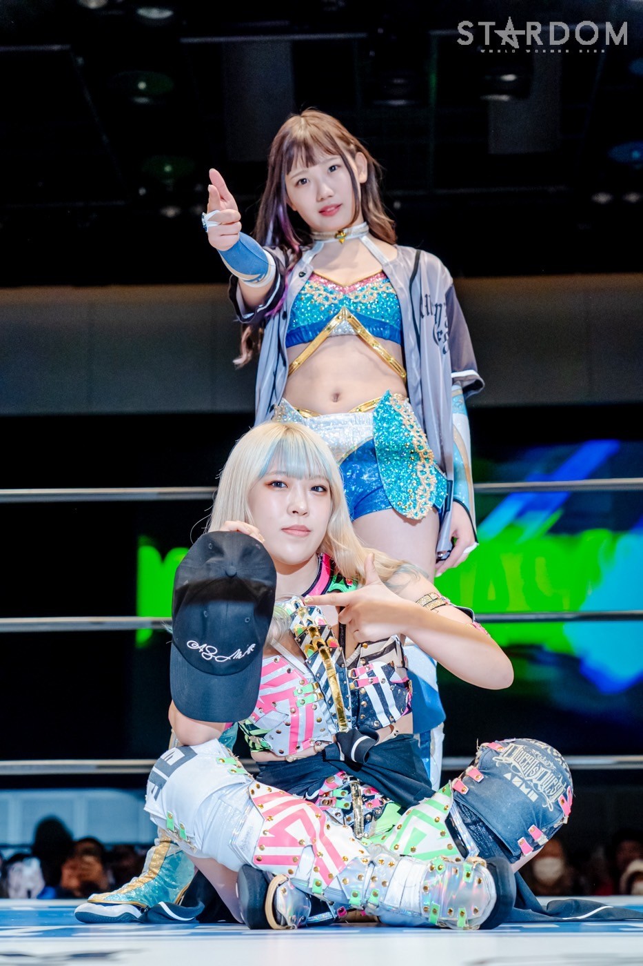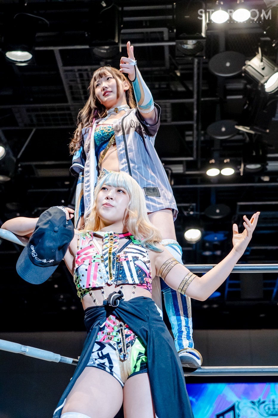 AZM「まずは、ここ地元でゴッデス戴冠おめでとうございまーす! いやあ試合見てたけどテンション上がるねえ、これ。すごくプロレスを見て心踊ったし、私たちもそれくらいのタッグ屋にならなきゃいけないとすごく思った。ぜひ次、挑戦させてください。そうだねえ、まあすぐにでも2人を超えたいから(5・18)横浜武道館とかどうですか?」