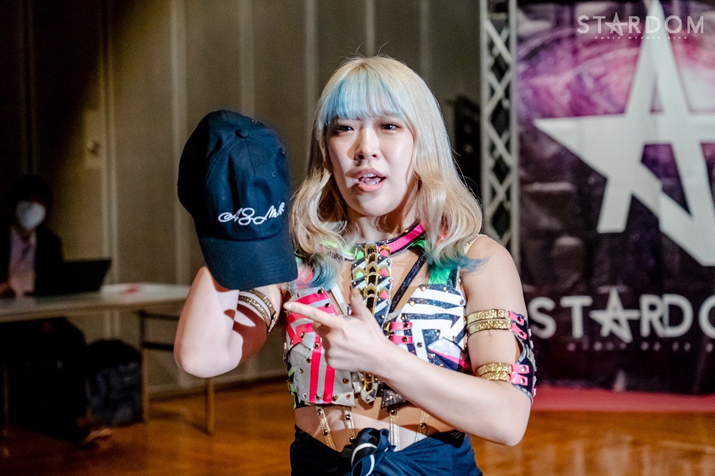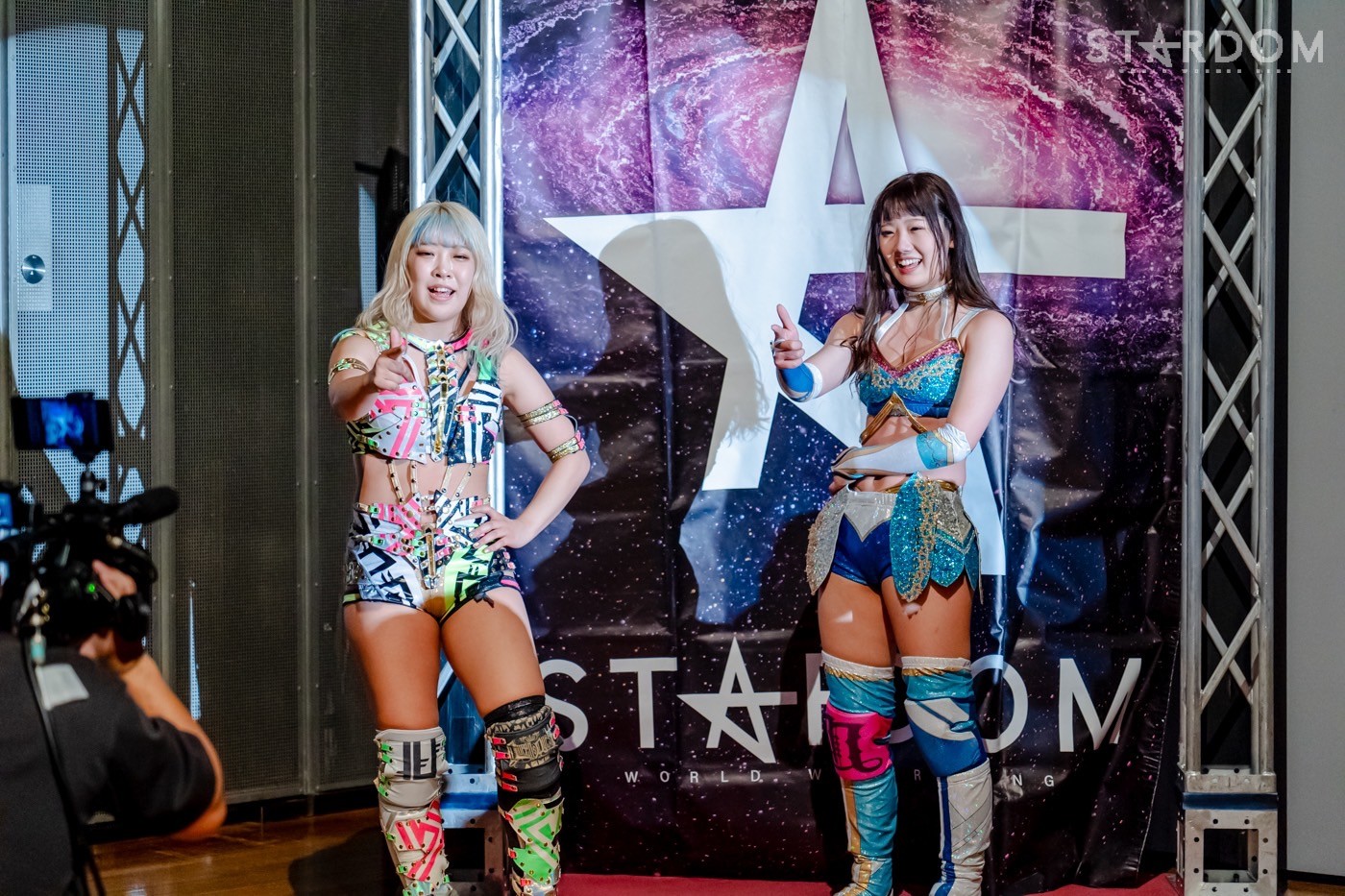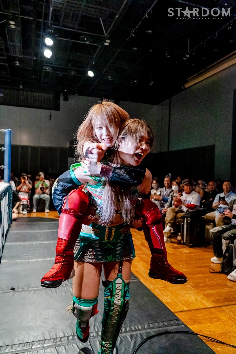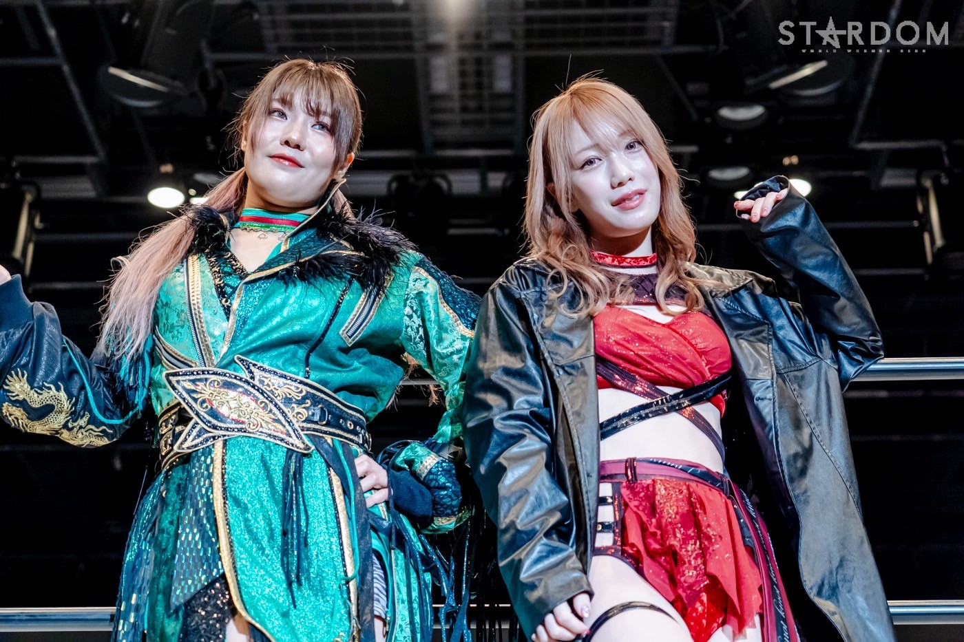 AZM「まずは、ここ地元でゴッデス戴冠おめでとうございまーす! いやあ試合見てたけどテンション上がるねえ、これ。すごくプロレスを見て心踊ったし、私たちもそれくらいのタッグ屋にならなきゃいけないとすごく思った。ぜひ次、挑戦させてください。そうだねえ、まあすぐにでも2人を超えたいから(5・18)横浜武道館とかどうですか?」