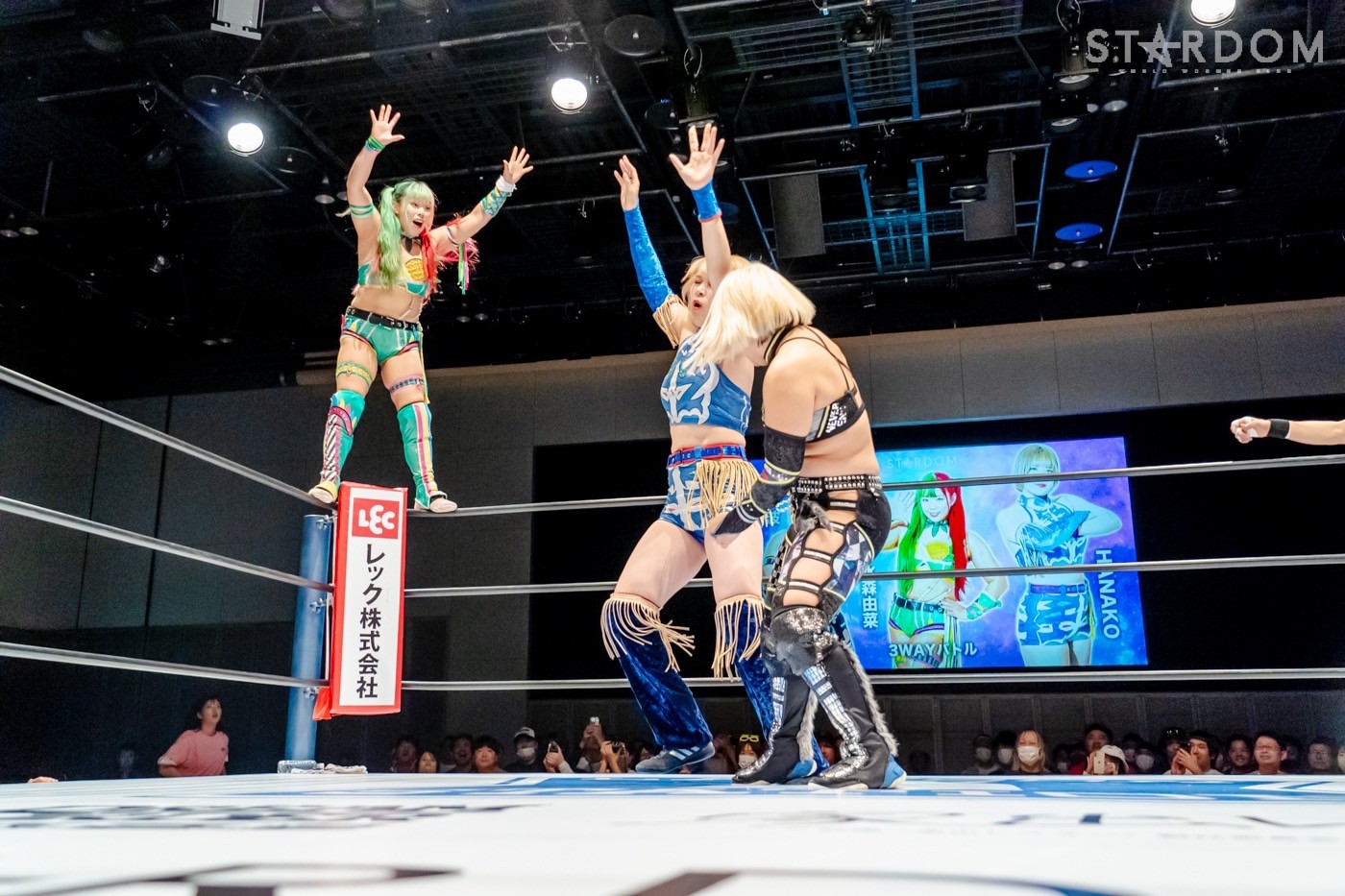 HANAKOが両手を高く上げて誘いをかける。水森はコーナーに上がって誘うが、小波がHANAKOに突っかかりグラウンドへ。水森がコーナーに一人残された状態に。2人がロープワークを展開。水森がコーナーから降りて突進するが2人につかまる。水森はHANAKOをかわし小波と丸め込みの応酬。そこにHANAKOがまとめてショルダータックル、まとめて逆片エビ固め。小波が反転しHANAKOにアキレス腱固め。水森とHANAKOが合体も小波が延髄斬り。小波はHANAKOにインディアンデスロック、水森がカットに入ると小波がコブラツイスト、2人がエスケープすると、小波が水森をリング下に落とす。小波はHANAKOにサッカーボールキック。HANAKOが返すと、突進を止めてボディースラム、アルゼンチン。水森がカットに入るがコーナーに追い込まれ、小波もまとめて串刺しボディーアタック。小波が返すと、HANAKOはブレーンバスター狙い。小波が切り返しバックの取り合い。水森がHANAKOにダイビングボディーアタック。小波の突進を水森がかわしてドロップキック。小波と水森がエルボーを打ち合う。小波がロープを離床したキックからフィッシャーマン。HANAKOが小波にニーをぶち込みブレーンバスター。水森がスーパーガールも2カウント。水森はHANAKOをかいくぐりドロップキック、ショルダースルー。ラリアット。HANAKOが返すと、水森の突進にビッグブーツ、ボディープレス。HANAKOはフィニッシュを予告しバックから持ち上げる。水森が切り返すと小波がニーアタック。HANAKOはビッグブーツから小波をアルゼンチン。小波が切り返しトライアングルランサー。HANAKOがギブアップし小波の勝利となった。