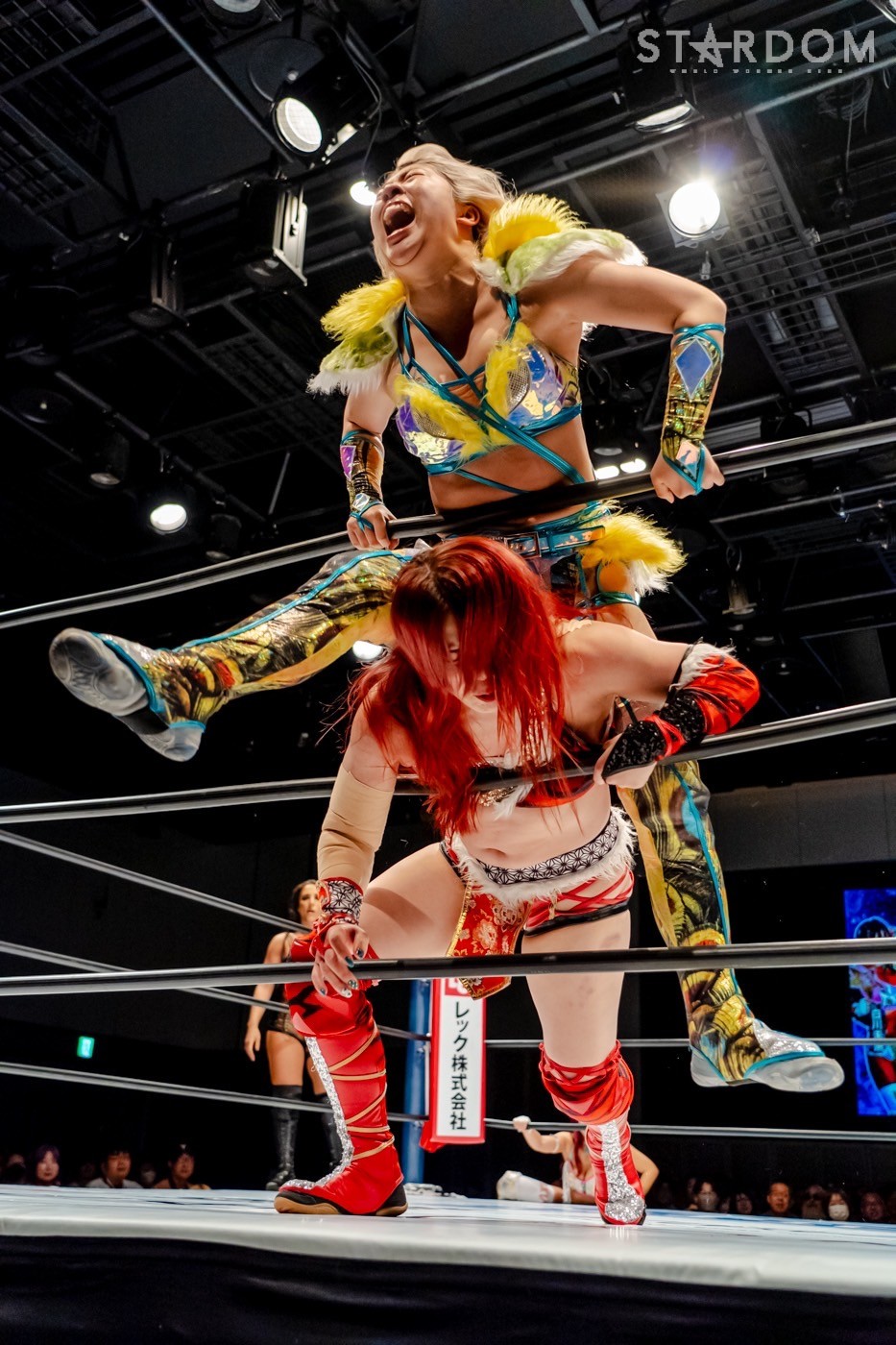 アーティスト・オブ・スターダム王者のE neXus V、舞華&白川未奈&ジーナ組にSTARSの岩谷麻優&羽南&飯田沙耶組が挑むタイトルマッチ。王者組は3・30仙台で朱里&MIRAI&壮麗亜美組からベルトを引っぺがし、これが初防衛戦となる。舞華はワールド・オブ・スターダム王座を防衛したばかりで2冠王キープを狙う。また、福岡凱旋では悔しい思いをしてきた舞華がこんどこそ故郷に錦を飾れるかも注目される。一方のSTARSでは岩谷がIWGP女子王座を保持、ここでアーティスト王座を奪えば2冠王となり、NEW BLOODタッグ王者・羽南と飯田にも2冠のチャンスだ。