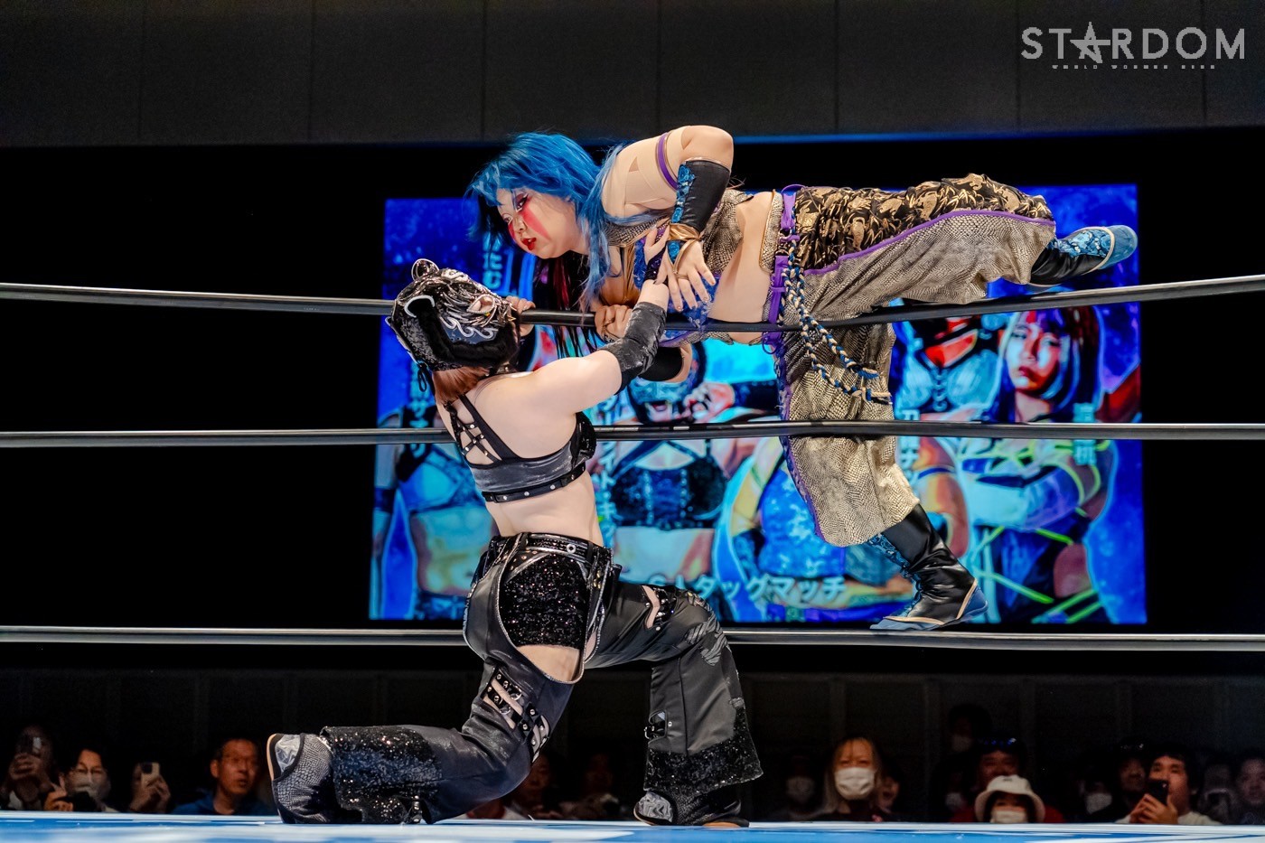 クレイジースター鈴季すず&星来芽依組にFWC(フクオカダブルクレイジー)葉月&コグマ組が挑むゴッデス・オブ・スターダム王座戦。4・27横浜ではゴッデス王座が4WAYマッチで争われ、星来が琉悪夏をフォールし2度目の防衛に成功した。が、試合後には大江戸隊がスターライト・キッドを追放し大荒れ。納得のいかない元王者・葉月&コグマがタッグマッチでの再戦を申し入れ、地元でのタイトル戦が決定した。葉月&コグマが地元福岡でメインを張るのは今回が初めて。“クレイジー対決”となるこの試合でどちらがよりクレイジーとなりベルトを腰に巻くか、注目のタッグ王座戦だ。