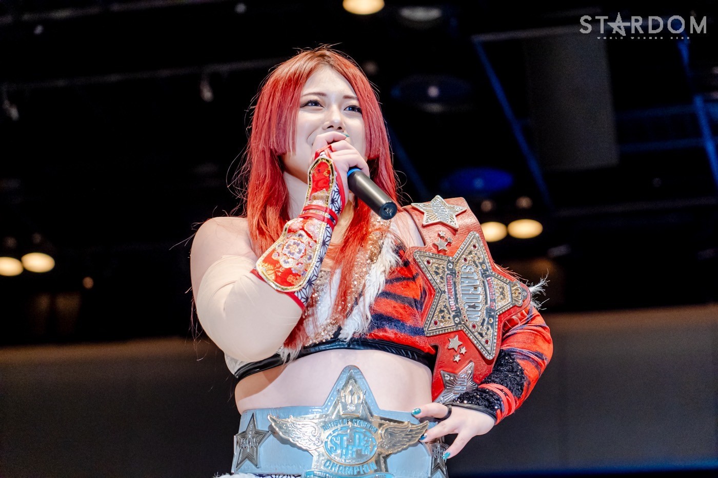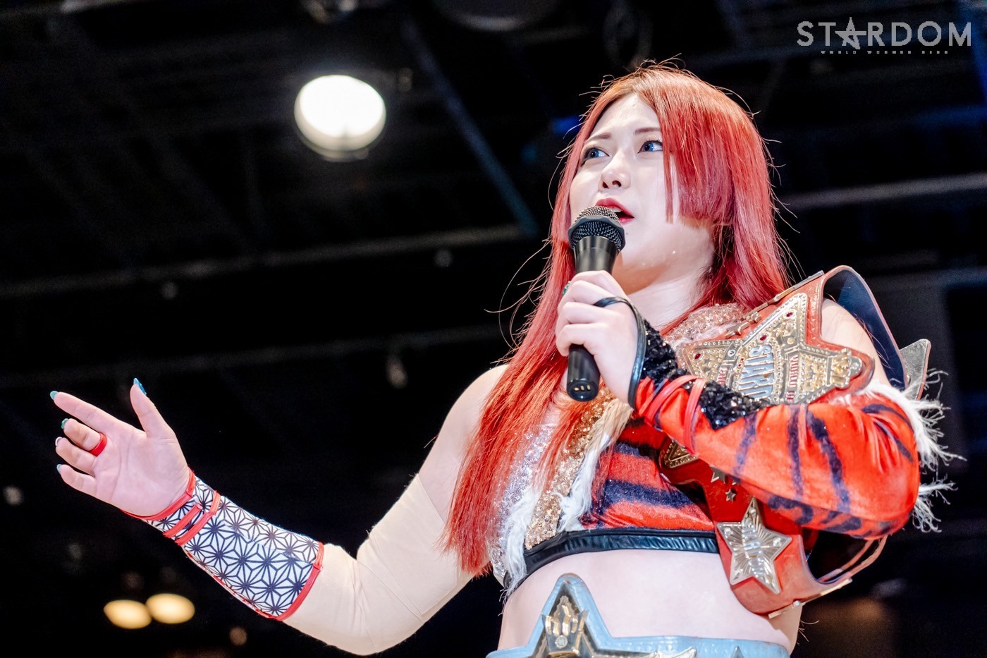 舞華「STARS、岩谷麻優。私、オマエとバチバチやりたいんだけどさ、今日あたってないね。オマエと少しでもやれるだけで楽しいと感じる。またタイミングが合えばシングルマッチやりたいね。そして、黄金世代飯田、オマエも相変わらず楽しいヤツだ。それよりも岩谷麻優よりも今日、メチャメチャ楽しませてもらったのが羽南! オマエ、シンデレラ(トーナメント)優勝してすごいじゃん。ホントにビックリだよ。こんなにけっこうガッツリやったの久々で、オマエの成長がすさまじくて、次はオマエとも一対一、シングルのベルトなんでも、そんぐらいの期待メチャメチャ羽南に感じました。まあでも、羽南またいつかやろう。あらためて、福岡のみんなただいま! なんとかなんとか防衛することができました。(白川に)なんで笑ってんだよ」