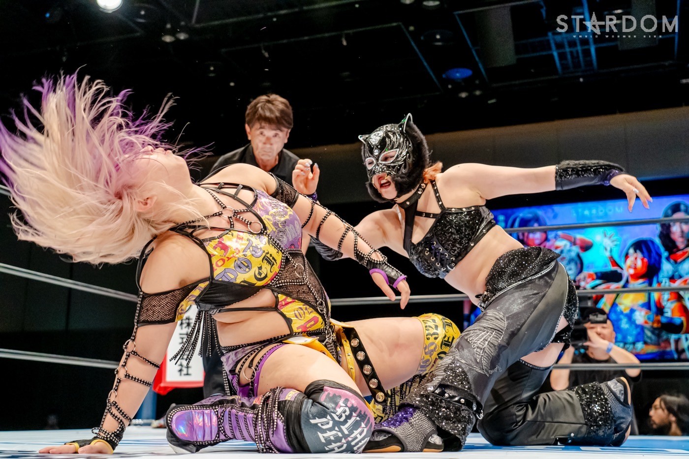 中野たむ&安納サオリ&スターライト・キッド組と刀羅ナツコ&渡辺桃&テクラ組による6人タッグマッチ。4・27横浜でキッドが大江戸隊から追放され、手を差し伸べたのがコズミックエンジェルズの中野だった。以来、中野はキッドをパートナーにリングに上がっており、今大会では安納とのトリオで臨む。安納とキッドと言えば2・4大阪でワンダー・オブ・スターダム王座を懸けて闘った間柄。いまだ去就に関しては明言していないキッドだが、因縁の大江戸隊との直接対決で答えを出すのかも注目される。