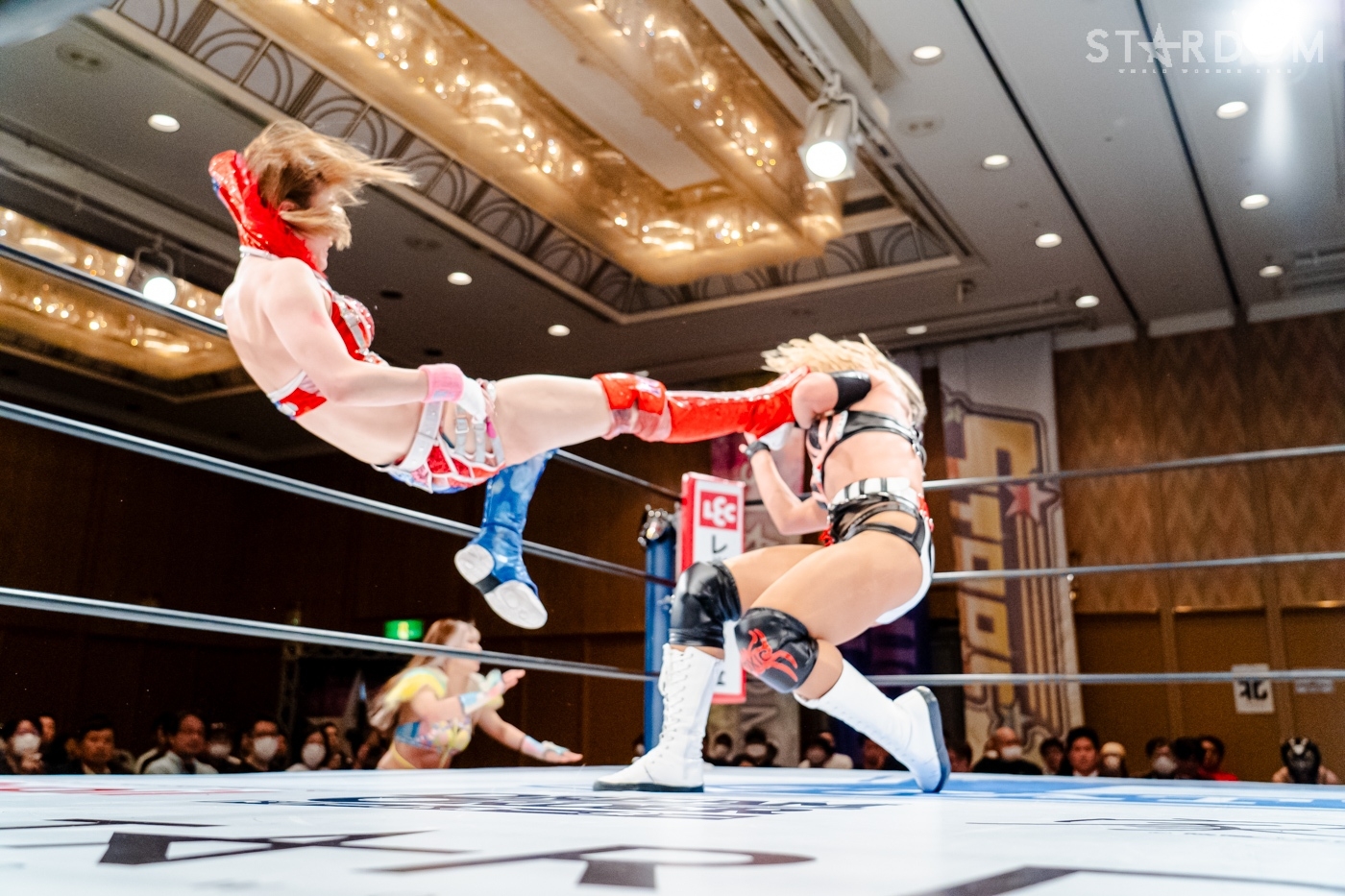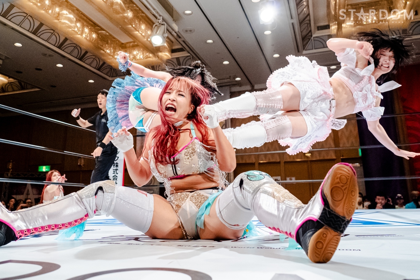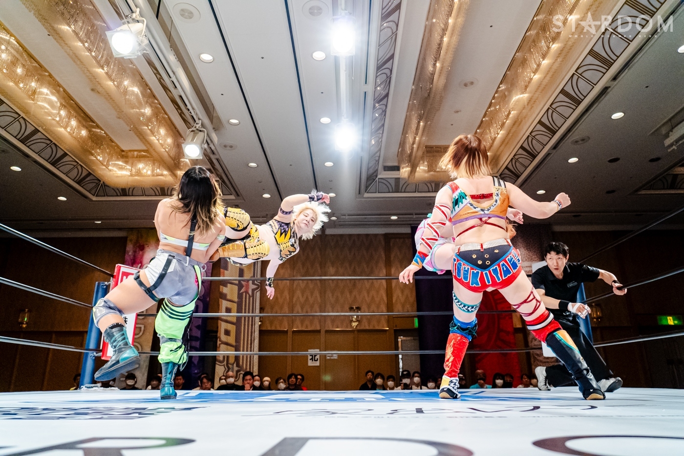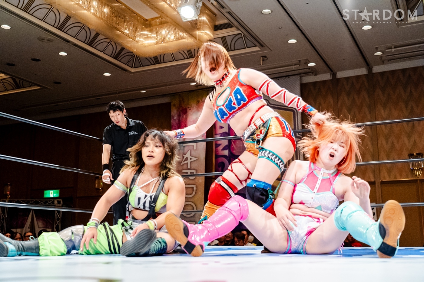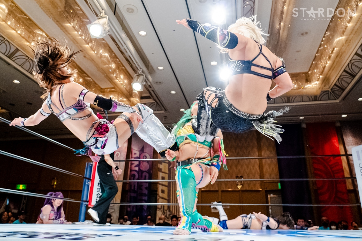 鈴季すず&星来芽依組、ジーナ&HANAKO組、渡辺桃&吏南組が一度に闘う3WAYでのタッグマッチ。5・5福岡で葉月&コグマ組に敗れゴッデス・オブ・スターダム王座から陥落したクレイジースターの鈴季&星来組には仕切り直しの一戦となる。