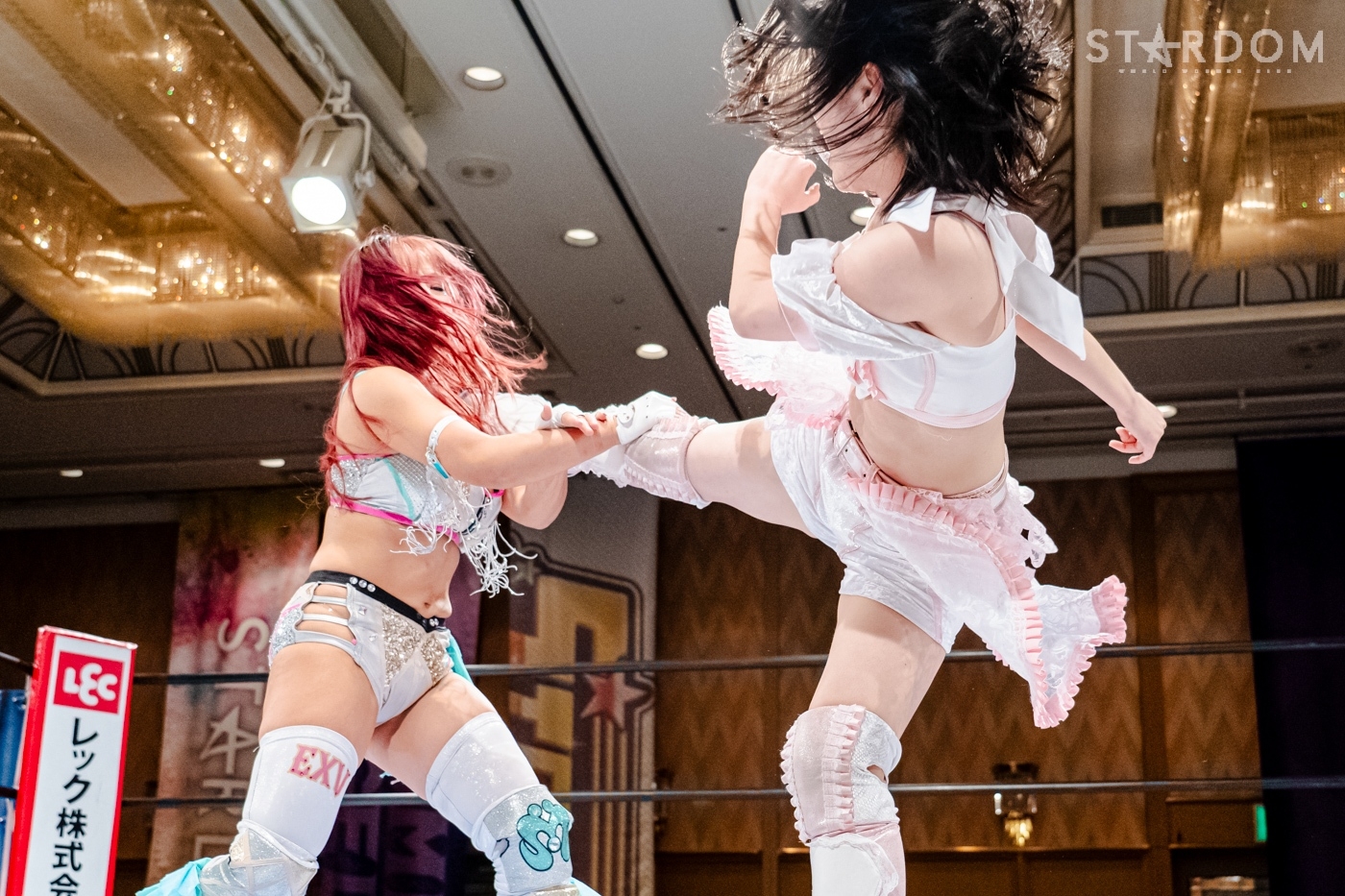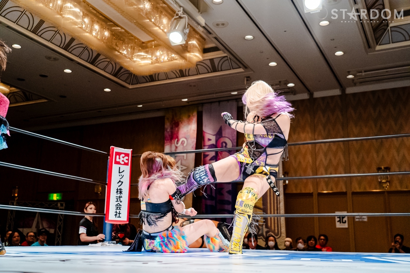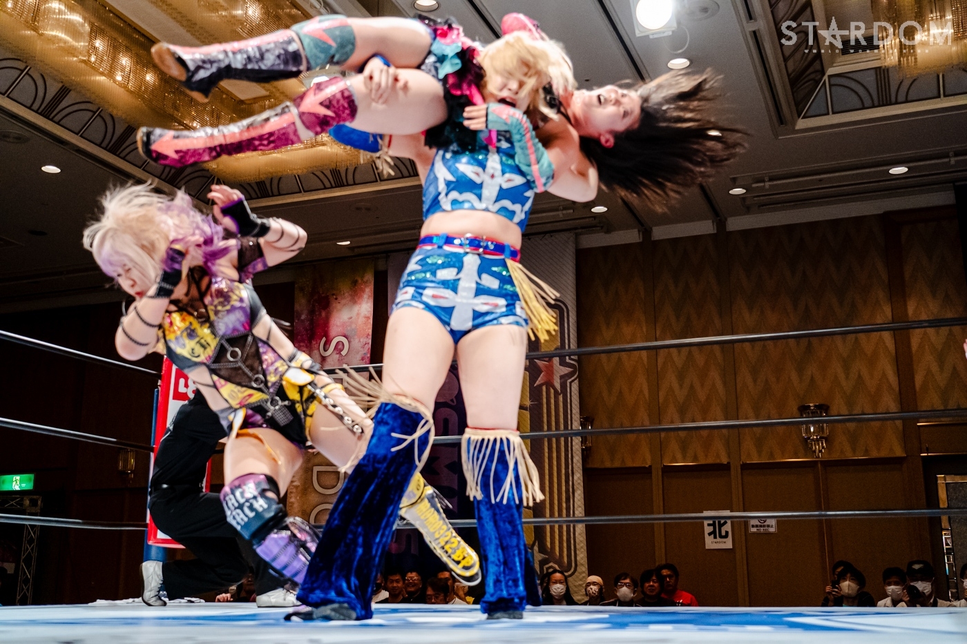 岩谷麻優&羽南のSTARSにスターライト・キッドが合体し、因縁の大江戸隊と対戦する6人タッグマッチ。大江戸隊は刀羅ナツコ&テクラ&フキゲンです★組のトリオで臨む。岩谷は5・3山口での凱旋試合でキッドを迎え入れ、中野たむとトリオを結成した。それ以来となる岩谷とキッドの合体。大江戸隊を追放されてからのキッドは中野のコズエンと組み機会が多いが、今回再び岩谷と組む。去就が注目されるキッド。この試合で答えは出るか、それとも?
