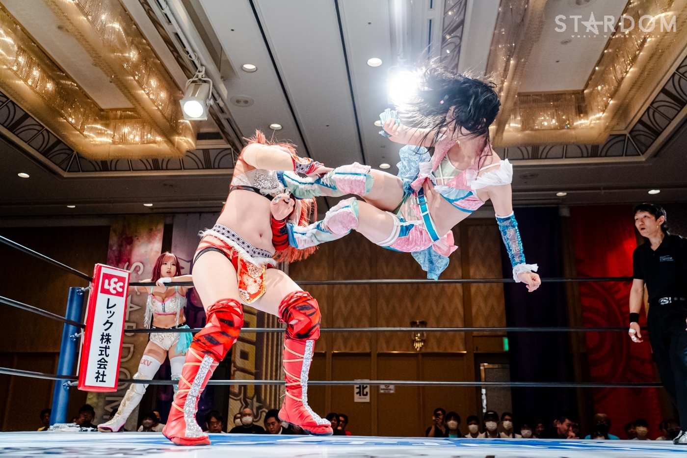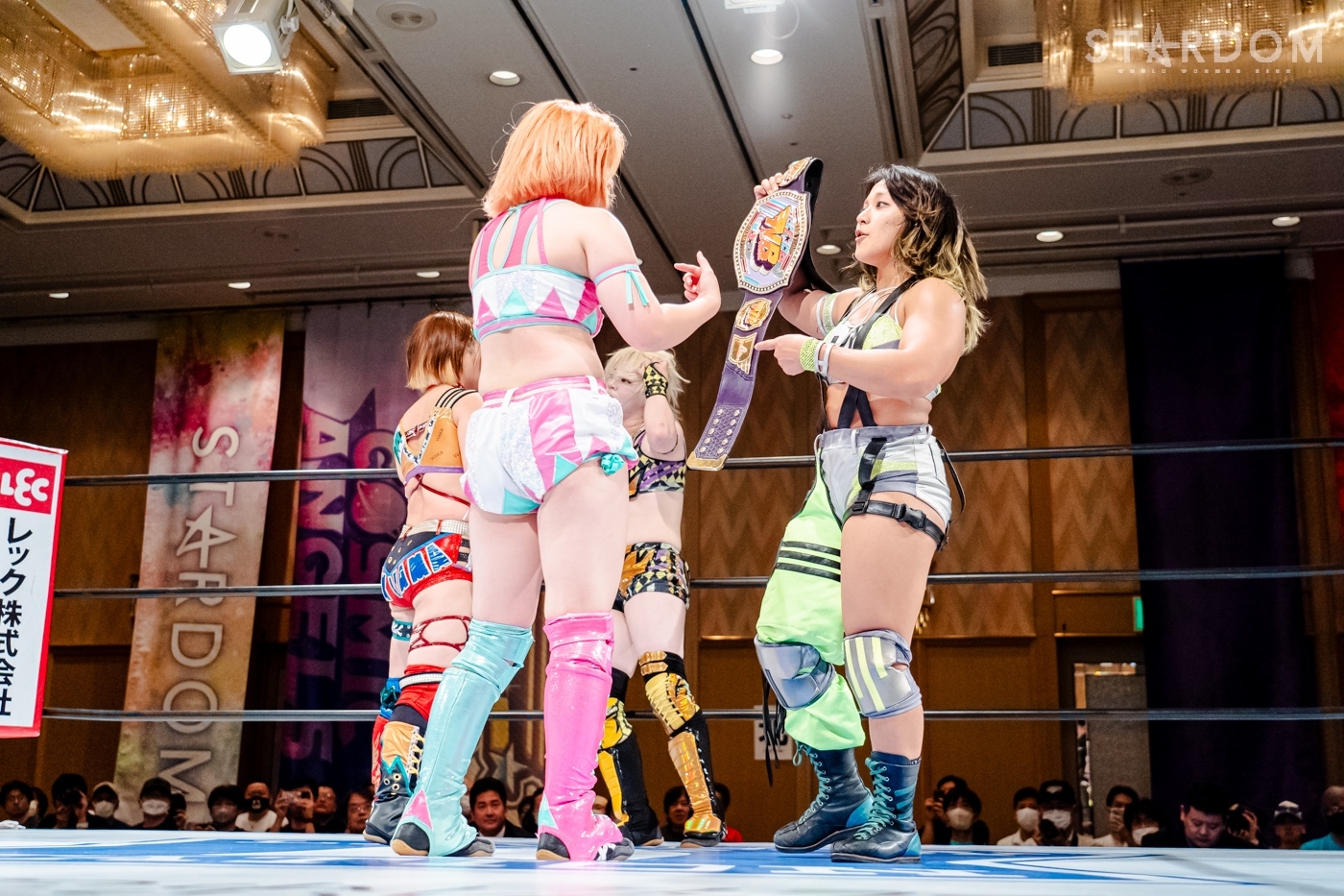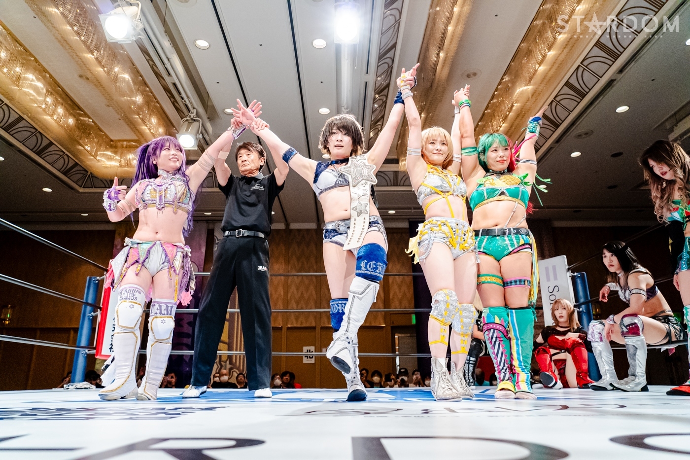 大江戸隊がリングを下り、ジーナがクレームをつける。試合はジーナと星来でスタート。ロックアップと見せかけ鈴季が足を踏みつける。ロープに振ろうとするが、ジーナがこらえてチョップを叩き込む。ロープワークの攻防となりコルバタの応酬、ドロップキックが交錯する。握手と見せかけジーナが星来を蹴飛ばす。ジーナはチョップを叩き込み、トラースキック。HANAKOを呼び込むが、大江戸隊がカットし、桃が星来にミドルキック。桃は星来をロープに固定し、吏南が加勢。桃が星来にキャメルクラッチ、ミドルキック。吏南が星来にヘアーホイップ、「このクソババア!」と顔面を踏みつける。カットに入ったジーナを星来の上にボディースラム。ジーナがHANAKOを呼び込み次々と星来に串刺し攻撃。星来が返すと、ジーナの突進にドロップキックを放つ。鈴季がジーナに串刺しエルボー、串刺しニー。大江戸隊が乱入するが、鈴季がまとめてスピアを打ち込む、鈴季はリング下を疾走し、吏南の顔面を蹴り上げる。吏南と鈴季が「クソババア!」「クソガキ!」と叫びながらエルボー合戦。鈴季は吏南のエルボーに「意外と痛えな」。吏南が鈴季を丸め込むが、ジーナが吏南を持ち上げてダブルアームスープレックス。HANAKOが次つぎとショルダータックル、吏南を担ぎ上げ振り回す。コーナーの鈴季に叩きつけると、まとめてボディーアタック。しかしかわされ桃野ミドルキックを食らう。吏南が押さえ込むがHANAKOが返す。吏南はダイビングダブルニーも鈴季がカット。桃が鈴季にハイキック。鈴季と星来が合体し吏南を追いやると、HANAKOとジーナが合体、ダブルでDDT。ジーナが大江戸隊にまとめてブレーンバスター。鈴季がHANAKOのバックを取るが星来のコードブレイカーが誤爆。HANAKOが鈴季にブレーンバスター。鈴季が返すと、HANAKOはアルゼンチン。しかし鈴季が切り返してテキーラショット。3カウントが入り、鈴季がHANAKOをフォールした。試合後、退場する吏南がセコンドについていた白川を後ろから蹴飛ばす。蹴られた白川はビックリ。退場する吏南を追いかけていった。