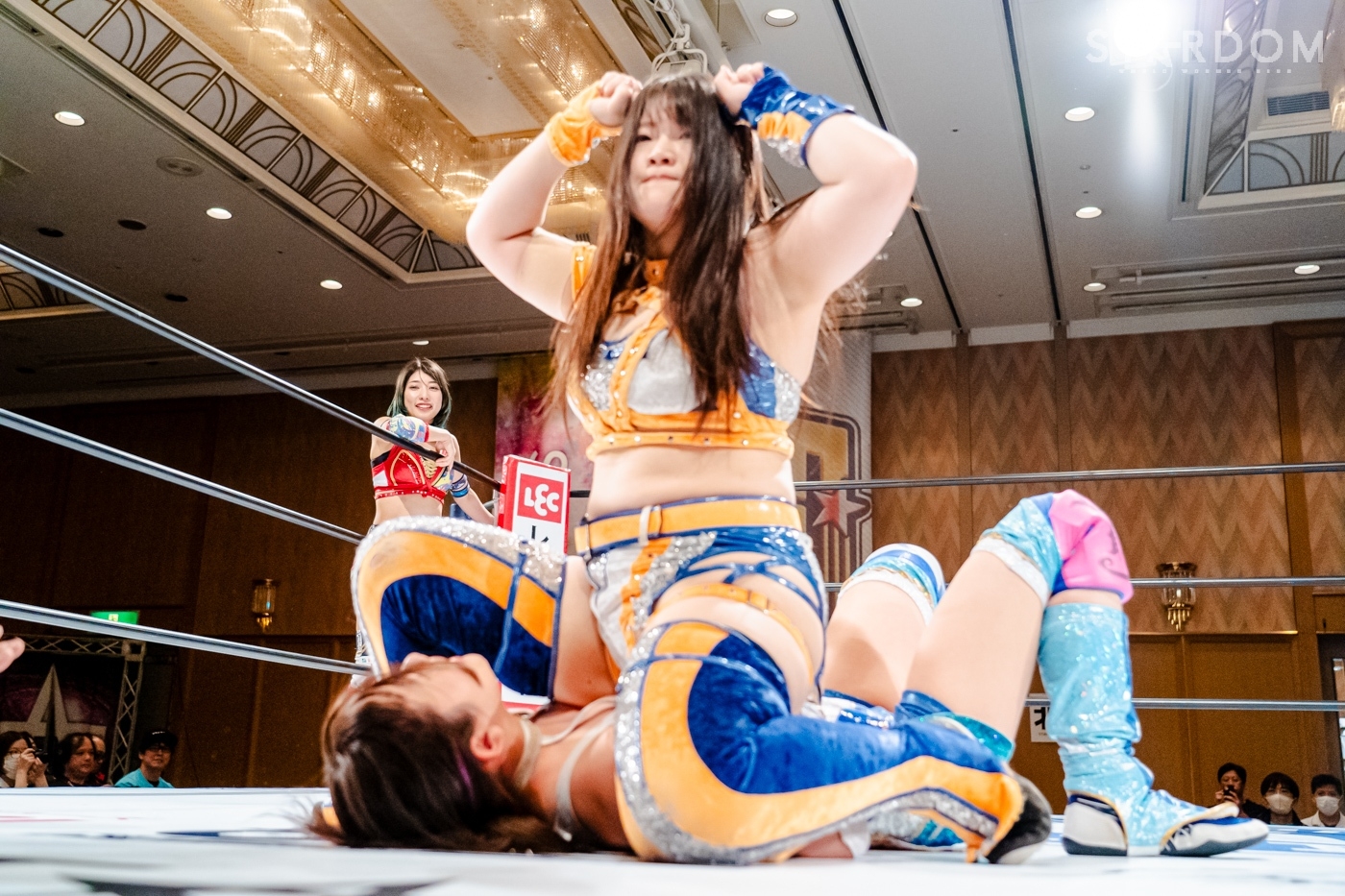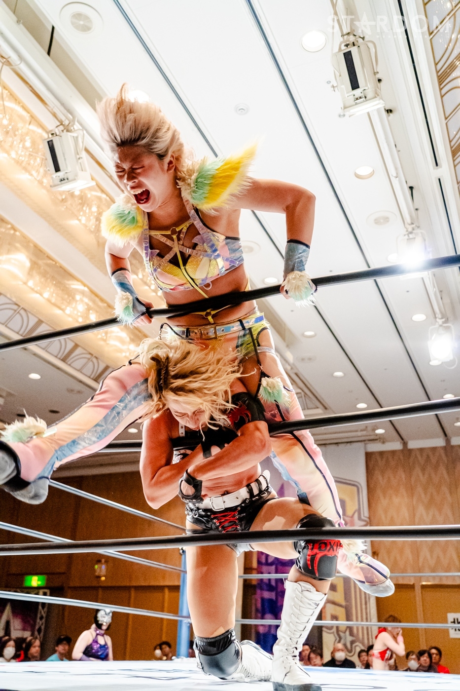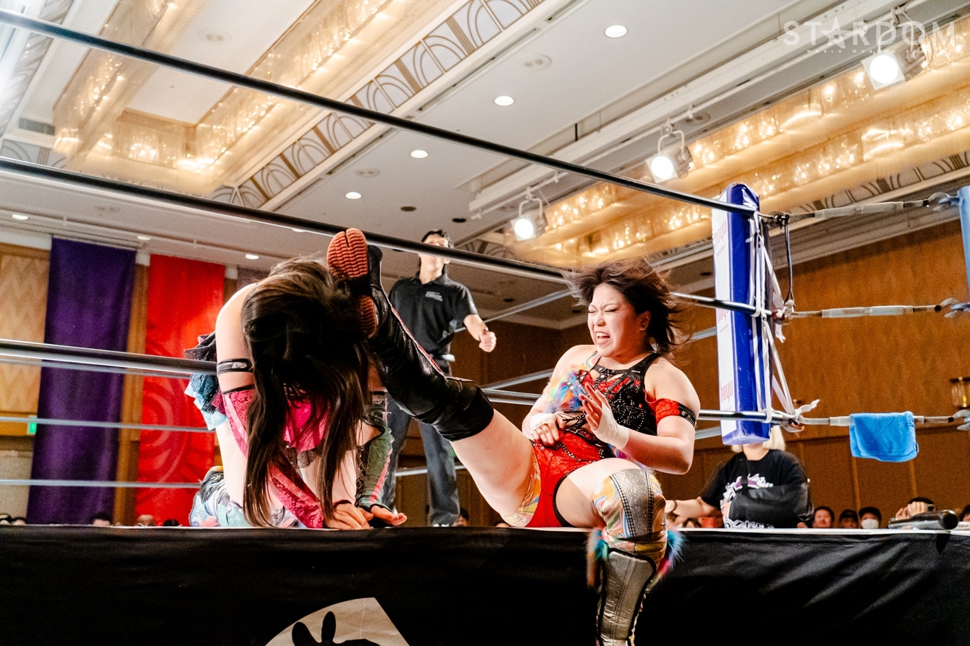 大江戸隊がリングを下り、ジーナがクレームをつける。試合はジーナと星来でスタート。ロックアップと見せかけ鈴季が足を踏みつける。ロープに振ろうとするが、ジーナがこらえてチョップを叩き込む。ロープワークの攻防となりコルバタの応酬、ドロップキックが交錯する。握手と見せかけジーナが星来を蹴飛ばす。ジーナはチョップを叩き込み、トラースキック。HANAKOを呼び込むが、大江戸隊がカットし、桃が星来にミドルキック。桃は星来をロープに固定し、吏南が加勢。桃が星来にキャメルクラッチ、ミドルキック。吏南が星来にヘアーホイップ、「このクソババア!」と顔面を踏みつける。カットに入ったジーナを星来の上にボディースラム。ジーナがHANAKOを呼び込み次々と星来に串刺し攻撃。星来が返すと、ジーナの突進にドロップキックを放つ。鈴季がジーナに串刺しエルボー、串刺しニー。大江戸隊が乱入するが、鈴季がまとめてスピアを打ち込む、鈴季はリング下を疾走し、吏南の顔面を蹴り上げる。吏南と鈴季が「クソババア!」「クソガキ!」と叫びながらエルボー合戦。鈴季は吏南のエルボーに「意外と痛えな」。吏南が鈴季を丸め込むが、ジーナが吏南を持ち上げてダブルアームスープレックス。HANAKOが次つぎとショルダータックル、吏南を担ぎ上げ振り回す。コーナーの鈴季に叩きつけると、まとめてボディーアタック。しかしかわされ桃野ミドルキックを食らう。吏南が押さえ込むがHANAKOが返す。吏南はダイビングダブルニーも鈴季がカット。桃が鈴季にハイキック。鈴季と星来が合体し吏南を追いやると、HANAKOとジーナが合体、ダブルでDDT。ジーナが大江戸隊にまとめてブレーンバスター。鈴季がHANAKOのバックを取るが星来のコードブレイカーが誤爆。HANAKOが鈴季にブレーンバスター。鈴季が返すと、HANAKOはアルゼンチン。しかし鈴季が切り返してテキーラショット。3カウントが入り、鈴季がHANAKOをフォールした。試合後、退場する吏南がセコンドについていた白川を後ろから蹴飛ばす。蹴られた白川はビックリ。退場する吏南を追いかけていった。