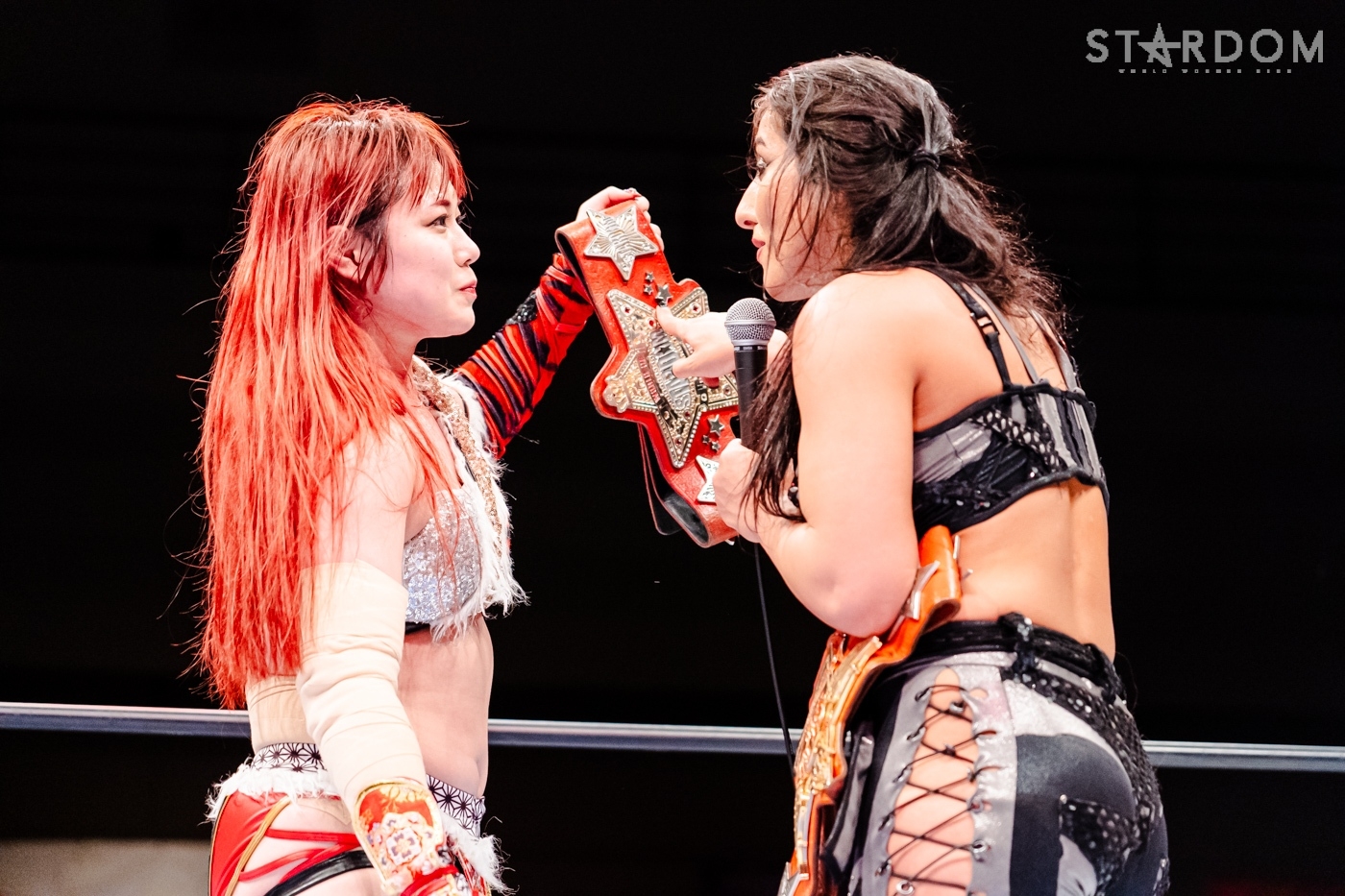 舞華「そう。EXVはいまホントちょっとね、忙しいんだよね。でも私たち、白川はベルト、そして私とジーナはこのベルトを懸けて闘います。後悔のないように、同門対決ですからね。ジーナとはおもいっきり、今日以上にぶつかっていきたいと思います。ジーナ帰った? そう。いやあ、せっかくみんなで締めたかったんだけど、ジーナは気が強いからさ。気の強い女は、私はとってもとってもドタイプなので、これはホントにホントに楽しみということで」