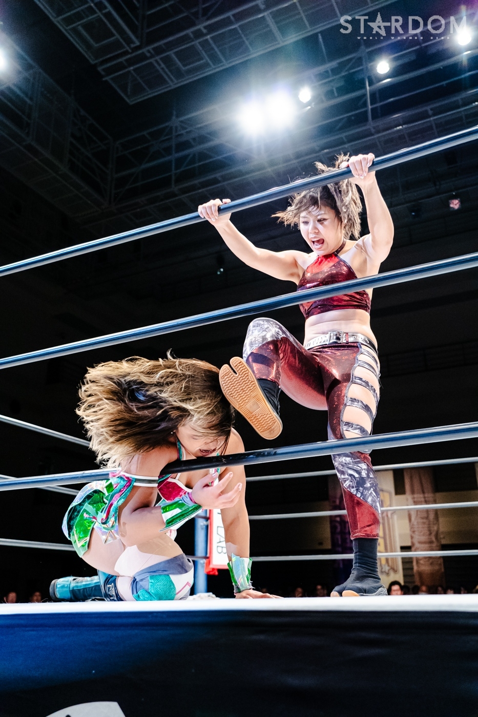 6・22代々木でおこなわれるSTARS同士によるゴッデス・オブ・スターダム王座戦に向けての前哨戦が、2つのシングルマッチに分かれてマッチメークされた。現ゴッデス王者は葉月&コグマ組のFWCで、現NEW BLOODタッグ王者の羽南&飯田沙耶組が挑む図式だ。まずはコグマと羽南の一騎打ち。タイトル戦に向けての駆け引きが展開される。