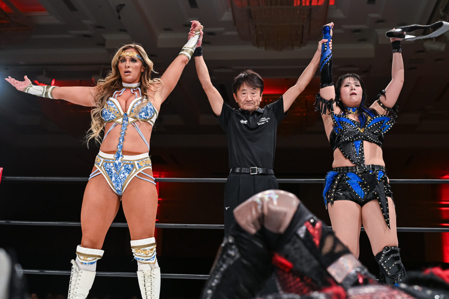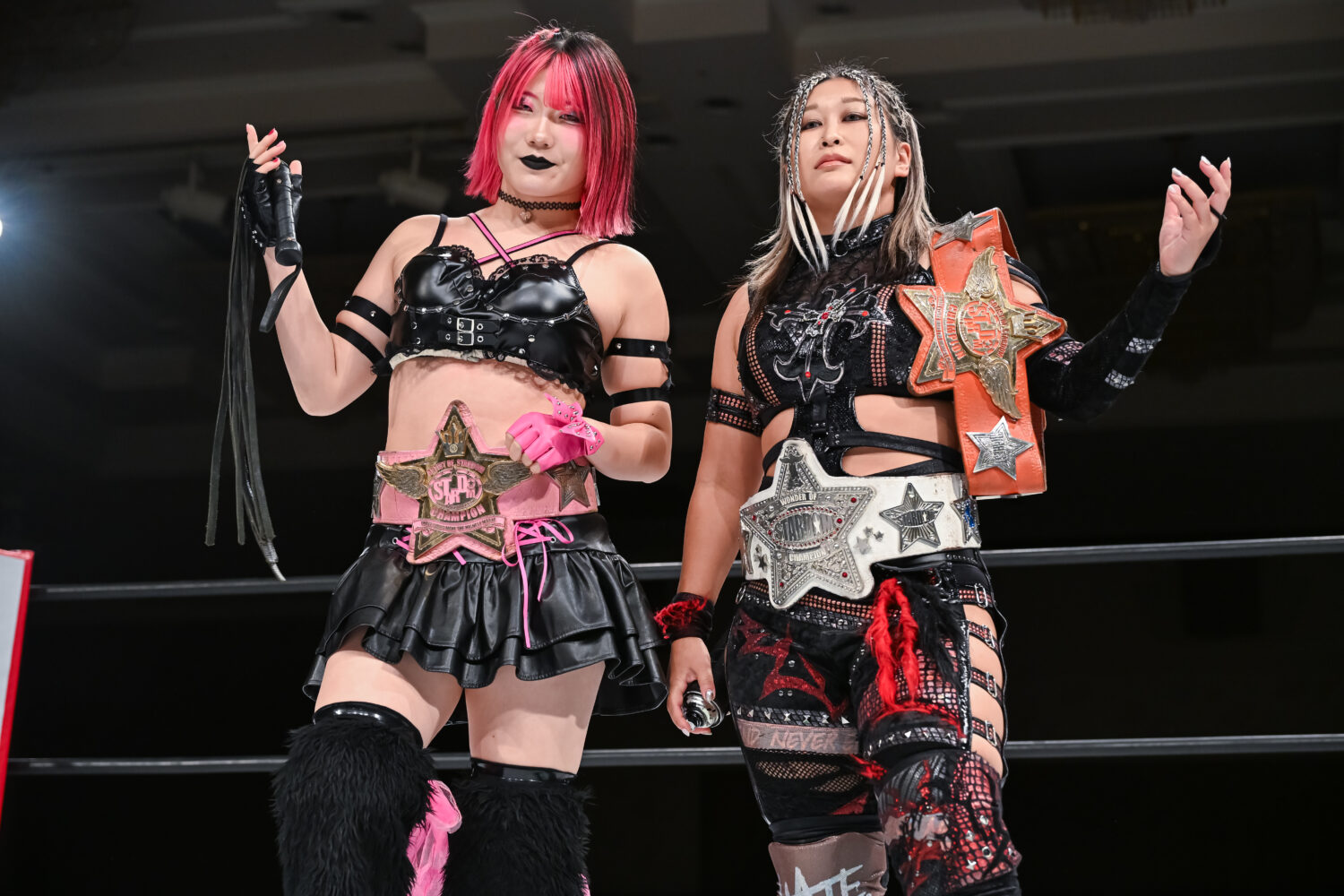 メーガン「サッポロアリガトゴザイマス。私を再び迎え入れてくれてありがとう。スターダムに迎えてくれてありがとう。この試合は現時点でもっとも苦戦したけど、メガスカイスクレイパーズがイチバンツヨイ! 2年前、私は舞華と組んでスターダムのタッグリーグ戦に優勝した。今年また優勝する。こんどのパートナーは、HANAKOだ。メガスカイスクレイパーズが次のタッグ王者だ」