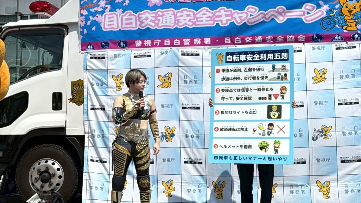 八神選手は「デビューしてからずっと豊島区に貢献したい!と思っていたので、今日は目白警察署のイベントに参加することができてとても嬉しかったです。ピーポくんと参加してくださった皆んなと一緒に、4月から取り締まりが始まる自転車の交通ルールを楽しく学ぶことができました!」とコメント。