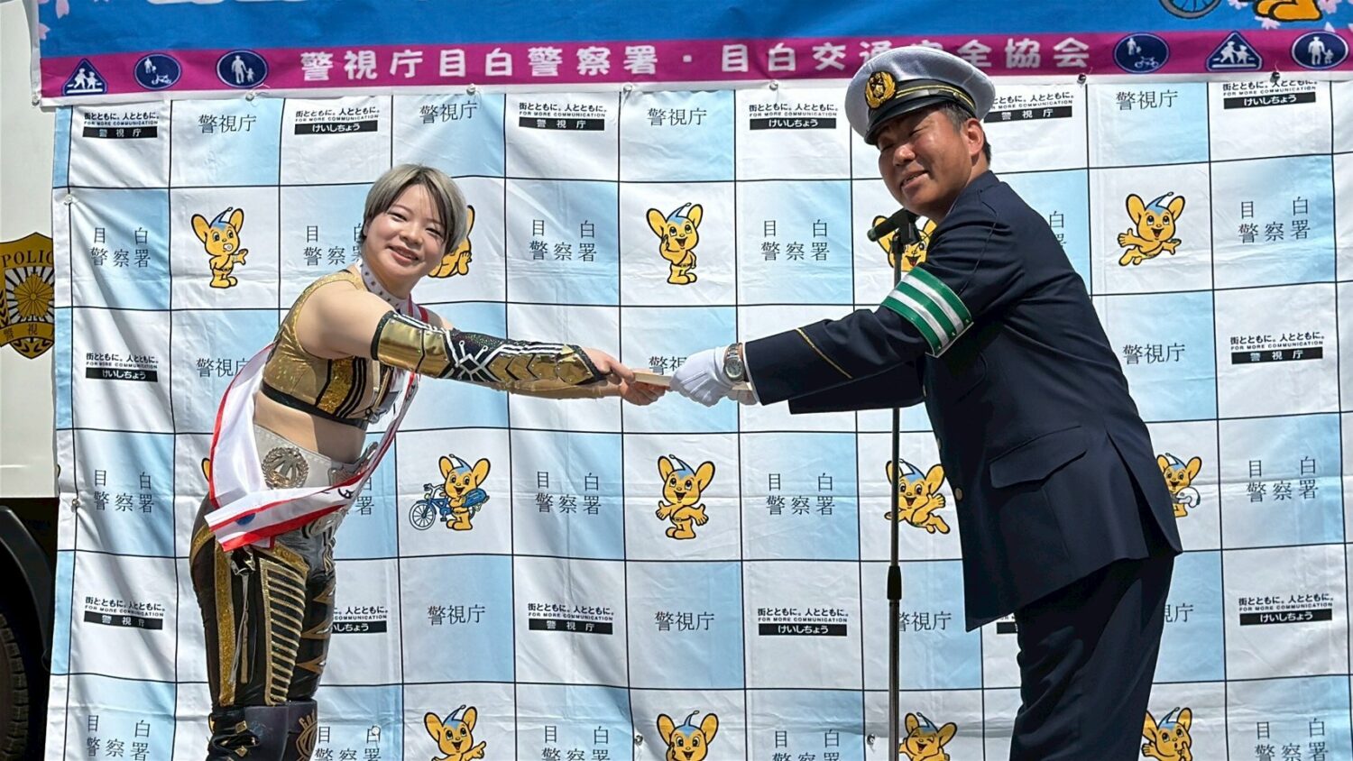豊島区出身の八神選手が、第14代フューチャー・オブ・スターダム王者を戴冠し、先日初防衛を果たしたことに関して、長崎署長より激励の言葉をいただました。