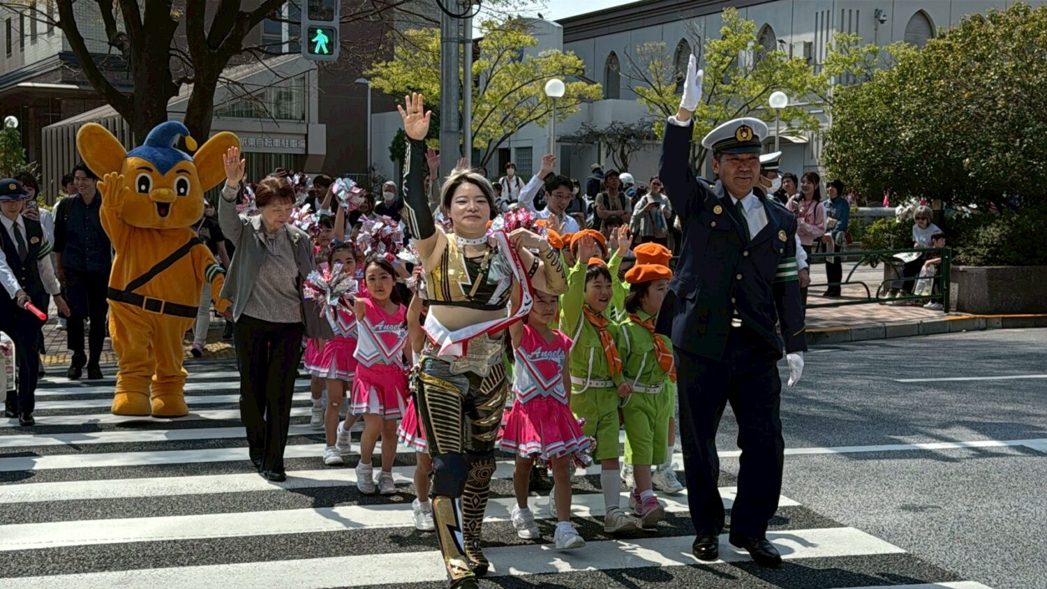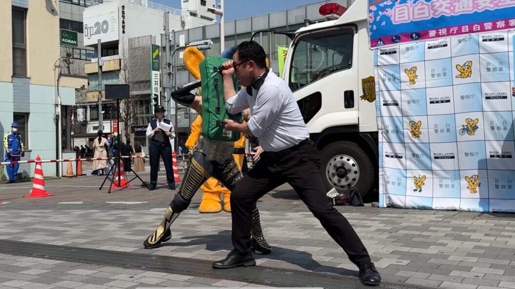 イベントの最後には、ピーポくん、目白警察署長とともに横断歩道を渡る実演にも参加。正しい横断方法を実践しながら、来場者へ安全確認の重要性を伝えました。