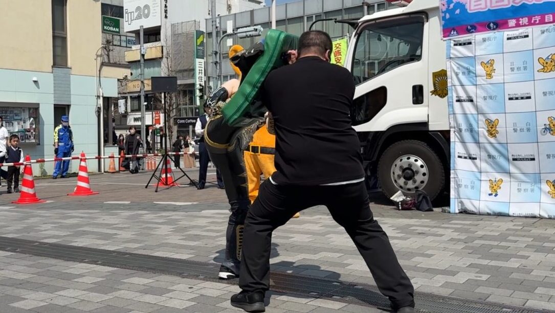 違反者役の男性にエルボーやハイキックをお見舞いし撃退する姿も。
