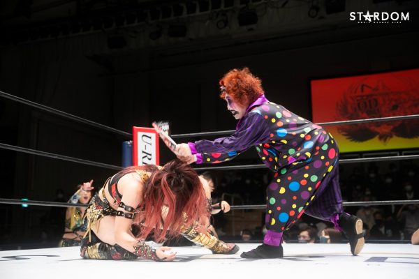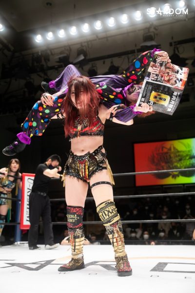 ドンナ・デル・モンドの朱里&舞華組とCOSMIC ANGELSの中野たむ&白川未奈組によるタッグリーグ公式戦。中野&白川はウナギ・サヤカを加えたトリオでアーティスト・オブ・スターダム王者に君臨していたが、10・3名古屋でDDMの舞華&ひめか&なつぽい組に敗れたばかり。中野&白川と舞華の遭遇はアーティスト王座をめぐる遺恨対決とも言えるだろう。舞華と組む朱里はワールド・オブ・スターダム王座挑戦権利証を保持し、SWA世界王座もキープ。さらにはゴッデス・オブ・スターダム王者でもあるが、パートナーのジュリアが欠場中とあって今シリーズでは舞華とのコンビで臨む。リーグ戦優勝チームがゴッデス王座挑戦に名乗りを上げる可能性が高いと思われるも、朱里がⅤを飾ればゴッデスのベルトとタッグリーグ優勝のタッグ2大タイトルを手にすることとなる。タッグの覇者として年末の赤いベルト戦にもコマを進めたい朱里だが…。
