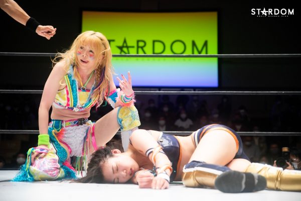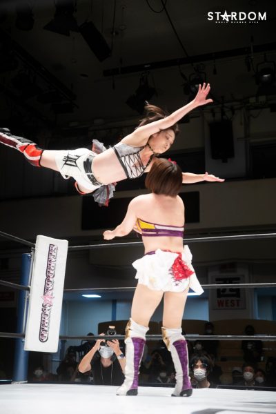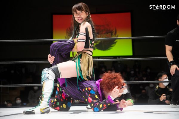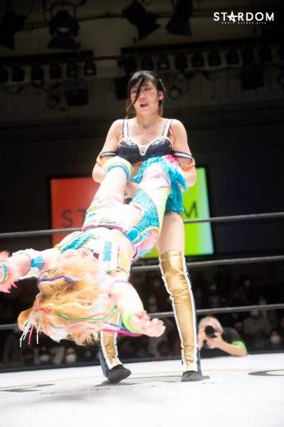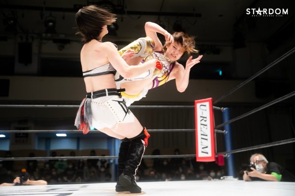 アーティスト・オブ・スターダム王者のひめか&なつぽいが、COSMIC ANGELSのウナギ・サヤカ&月山和香組と対戦。ひめか&なつぽい組はゴッデス・オブ・スターダムタッグリーグ戦にエントリーしているが、この日は公式戦が組まれておらず、この試合で試運転。相手のウナギ&月山組は前日の高崎大会における8人タッグマッチで組んではいるが、ウナギが月山のコズエン入りを認めているわけではないだけにチームワークに不安を残す。ウナギはこちらもコズエン入りを認めていない桜井まいとのチームでタッグリーグにエントリーしているとあって、この試合から桜井とのコンビがどうなるかを予測することができるかもしれない。タッグリーグではひめか&なつぽい組がウナギ&桜井組と当たるため、公式戦に向けての前哨戦にもなるだろう。
