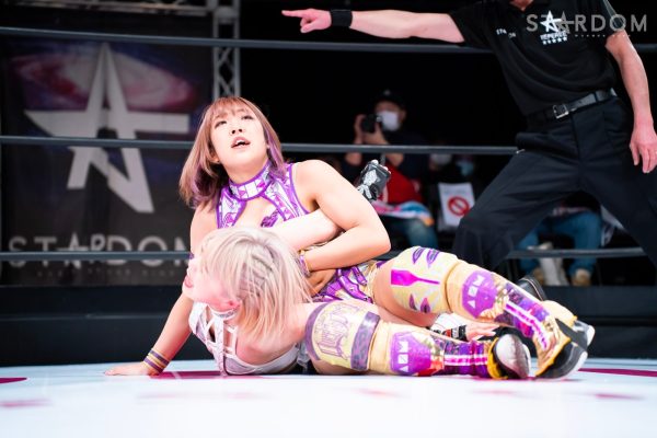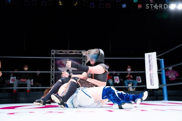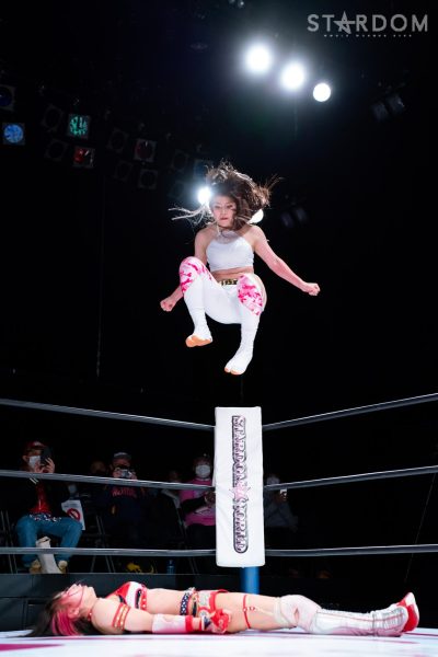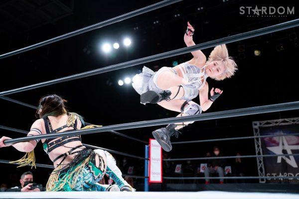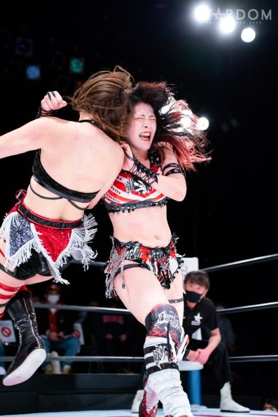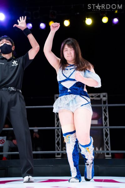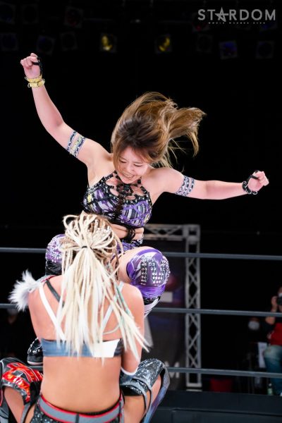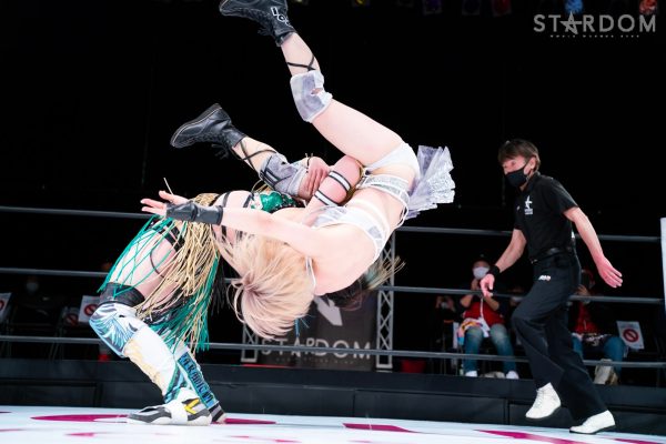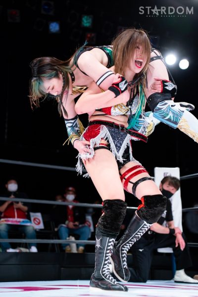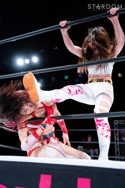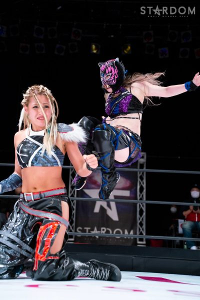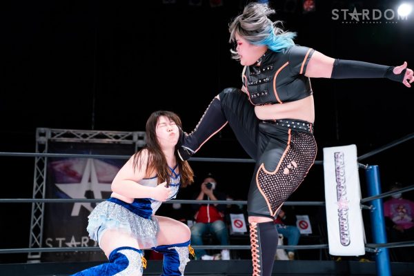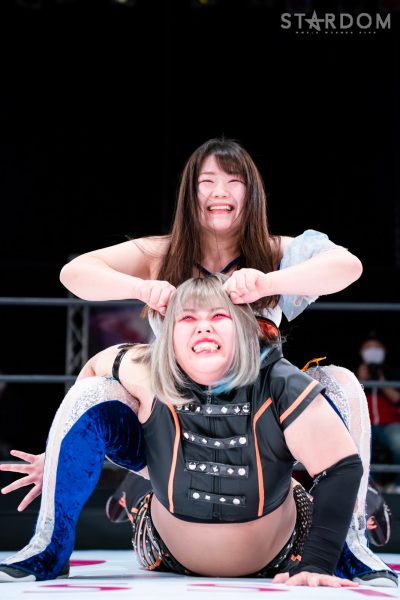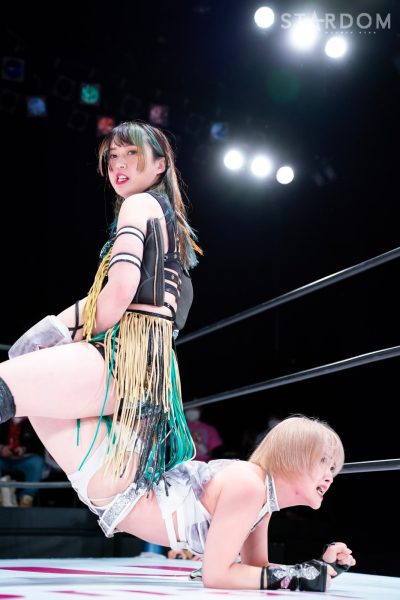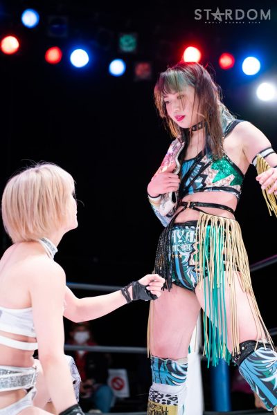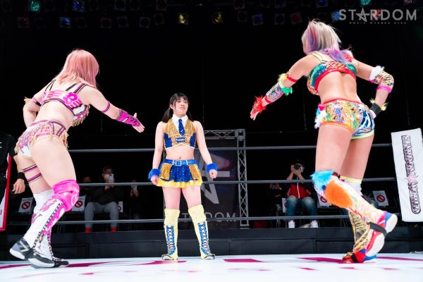 羽南vs白川未奈vsウナギ・サヤカの3WAYマッチは、全員がフューチャー・オブ・スターダム王者経験者。羽南がウナギとの約束を守りベルトを巻いた。その現王者・羽南がCOSMIC ANGELSの2人を相手にする図式である。コズエンの2人は葉月&コグマのゴッデス・オブ・スターダム王座挑戦が決定済みだけに、STARSとコズエンの代理戦争でもある。