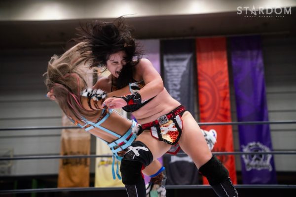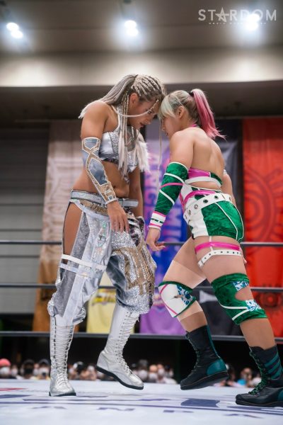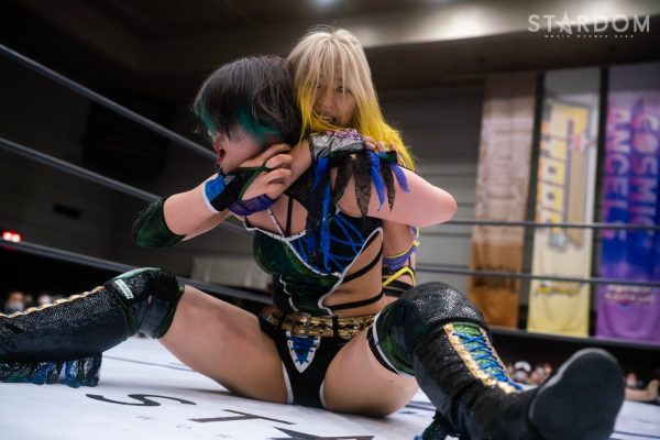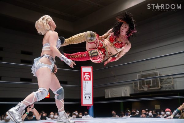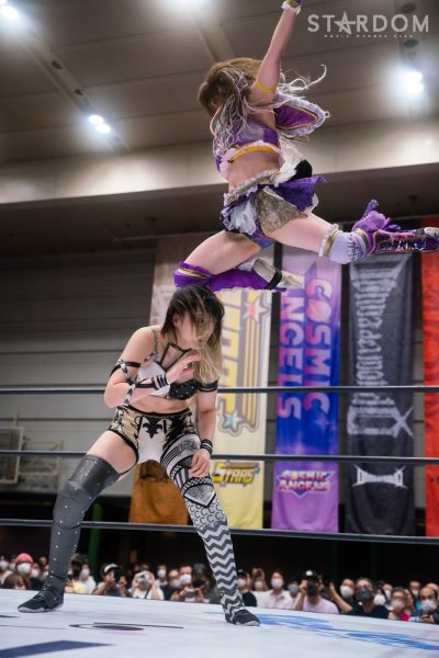舞華がヘッドロック、SAKIは足を踏んで取り返す。舞華がショルダータックルで吹っ飛ばす。舞華が串刺しラリアット、SAKIがショルダータックルのお返し。