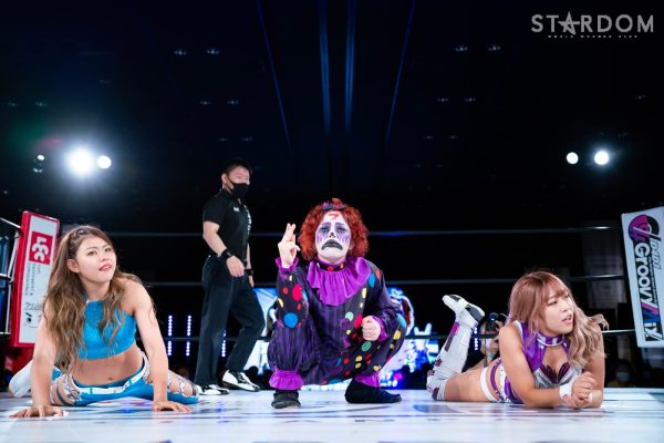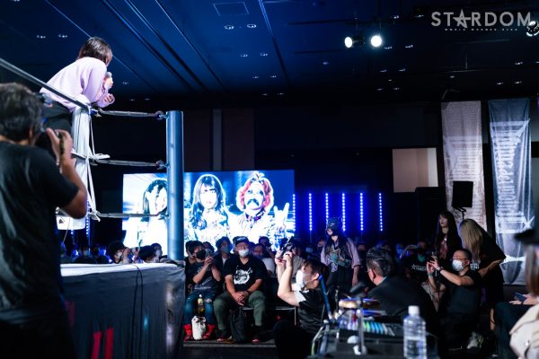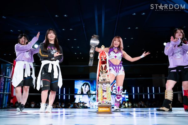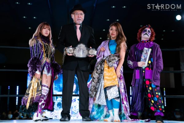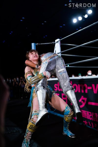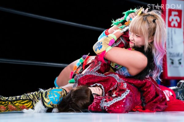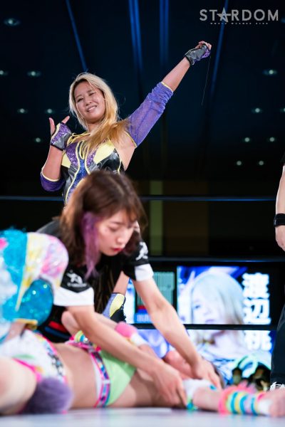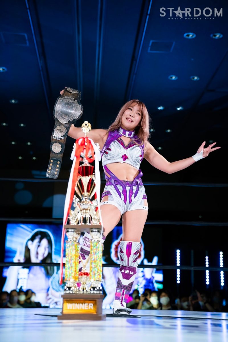 「たむちゃんから、たむちゃんから2点ゲットしました。なんかたむちゃん、いいもの持ってたね。ゴッデスのベルト。今日、私、勝ったから、5★STARが終わったら始まるゴッデス・オブ・スターダムのベルトに関係するあれあるよね、タッグリーグ。今日、大事な1勝だったよ。たむちゃん、楽しかった。中野ぅたみも喜んでたよ、ありがとうね」
