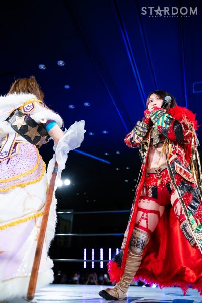 「ハイスピード防衛戦、V7、防衛しました。よかった。正直言っちゃうとすごく不安だったけど、無事、葉月ちゃんにもお帰り言えたし、私が葉月ちゃんとまた新たな約束を果たすために最多防衛記録をしたいと思います。言っちゃえば、いまスターダムの所属選手で私からこのハイスピードのベルトを取れる人、いないんじゃないの?正直。悔しかったらそのへん頑張ってもらって、次は花園桃花さん。約束通り会社にも大阪のビッグマッチでやろうと伝えておいたので、素晴らしい舞台で素晴らしい試合やりましょう。期待しています」