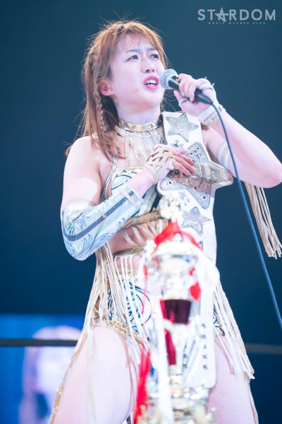 「潰し合いじゃなくて、まるで殺し合いかのような熱くなるような刺激のある葉月との試合でした。葉月とは、試合で通じ合った部分があったんじゃないかなと思います。葉月のスターダムに戻ってきた理由、白いベルトがあるから、勝ちと負け、ホントに残酷な世界ではありますが、プロレスは負けてこそ光るものがある。ホントにそういった部分がプロレスの魅力なんじゃないかなと思っています。だから葉月には何度でも何度でもまた挑戦してきてほしいと思います。そして横浜アリーナでの防衛戦、白川未奈を指名させていただきました。みなさんも待ち望んでいたカードなんじゃないかなと思っています。ゴールデンフェニックス、完全復活します」