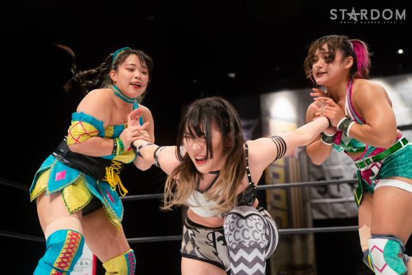 レディが両手を高く上げて2人を誘う。ともに届かず足を踏みつけて手四つの構えに。水森が捻り上げると飯田も腕を捻ってロープに振る。レディがショルダータックルにいくと2人がこらえる。レディが2人に走るように指示。2人が走ろうとするとレディは河津落としへ。飯田を捕まえるとジャイアントスイング10回転。しかしカバーを水森が横取り。水森がジャンピングショルダータックルをレディに決め、飯田をボディースラム。水森は2人まとめてボディープレス、逆片エビ固め。コーナーに追い込むが飯田がかわす。レディが逆水平を打つと3人がチョップの応酬。飯田が乱打するがレディと水森が共闘の構え。しかし飯田が阻止してレディへバックエルボー、エルボードロップ。飯田はレディを引き起こしブレーンバスター狙い。レディが切り返しコブラツイスト。水森がまとめてクロスボディーも2カウント。レディが2人に脳天唐竹割り、まとめてのチョークスラムはかわされ、水森と飯田がレディにラリアット。水森と飯田がラリアットの打ち合い。水森がカウンターのドロップキック、飯田がスパインバスター。水森が返すと、飯田は飯田ロケットを発射。しかしレディがカットする。レディは飯田にチョークスラム。飯田が返すと、レディはジャイアントバックブリーカーを狙う。しかし飯田が切り返して飯田橋。水森がカットしようとするが間に合わず、飯田がレディをフォールした。