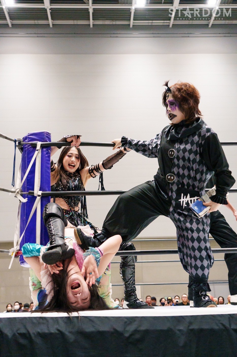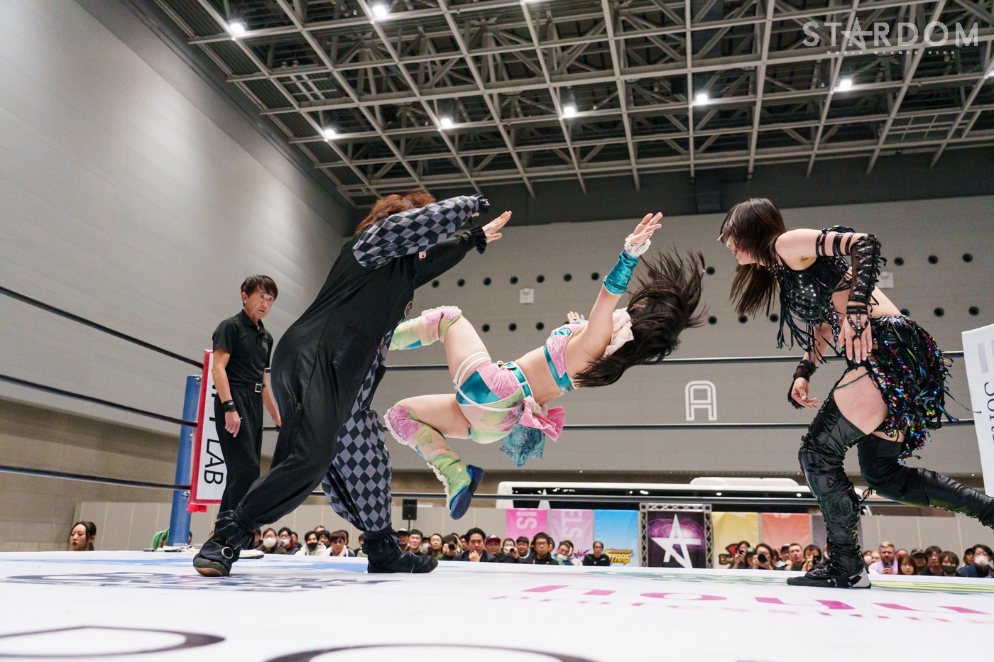 STARSの岩谷麻優&コグマに新人の浜辺が合流し、ゴッズアイの朱里&鹿島沙希&妃南組と対戦。岩谷とコグマが浜辺をリードしながら勝利をつかめるか?