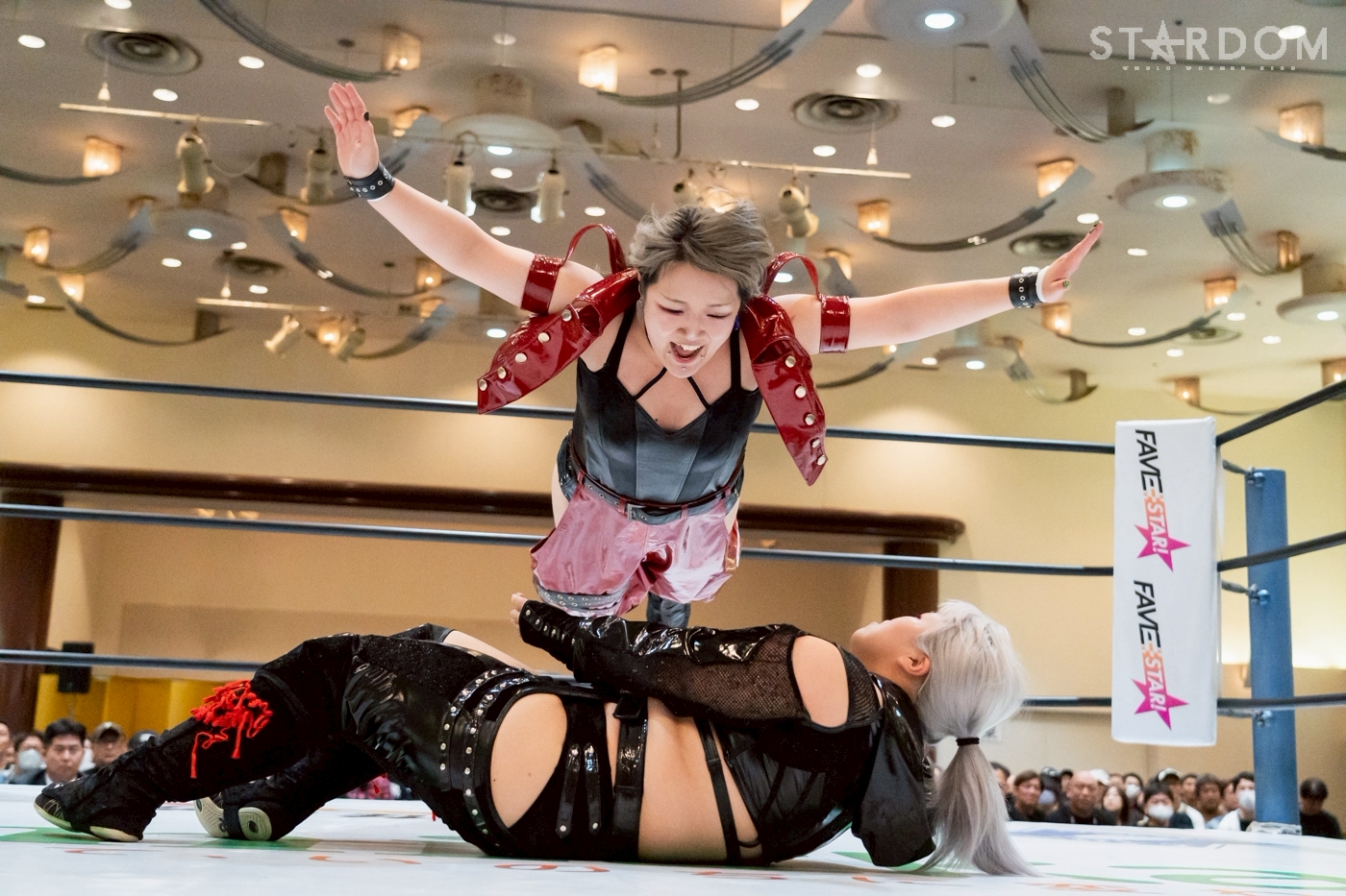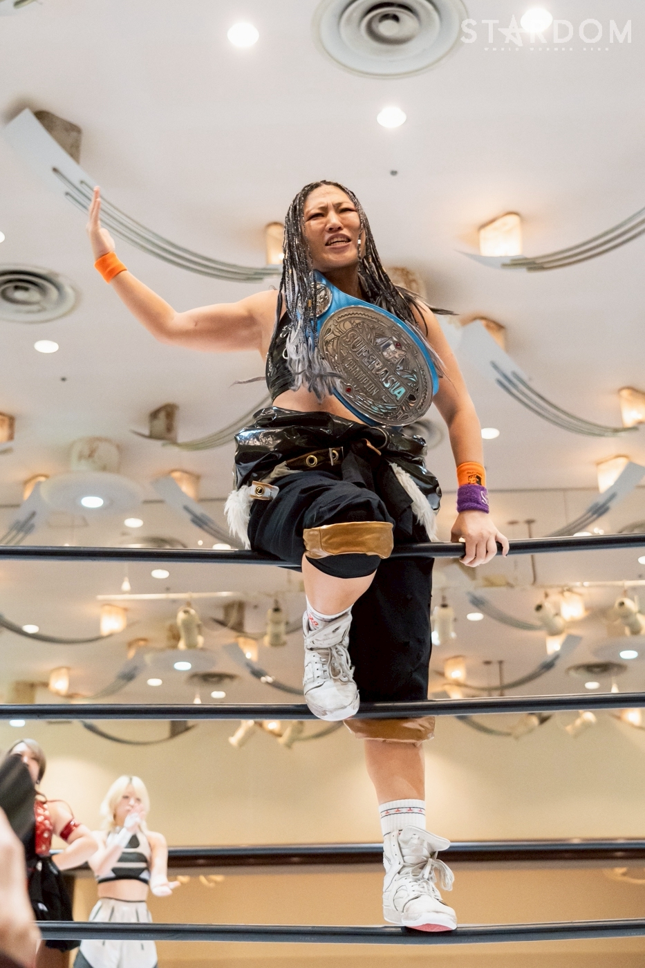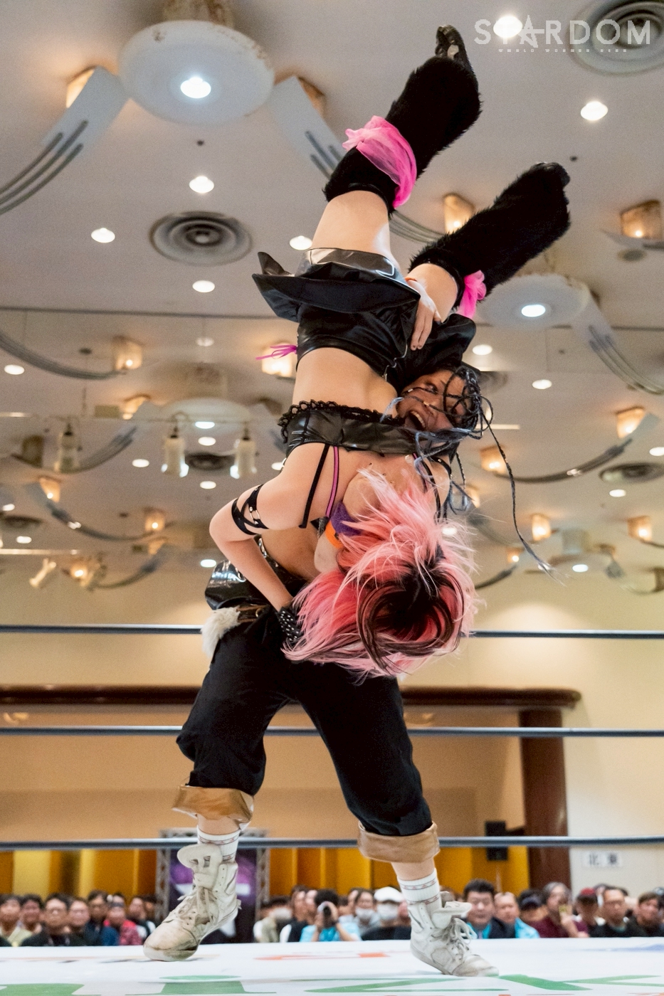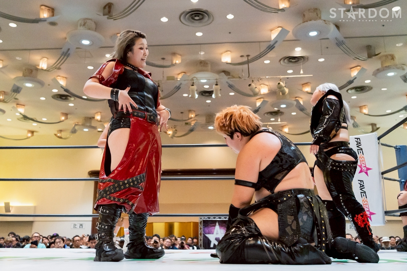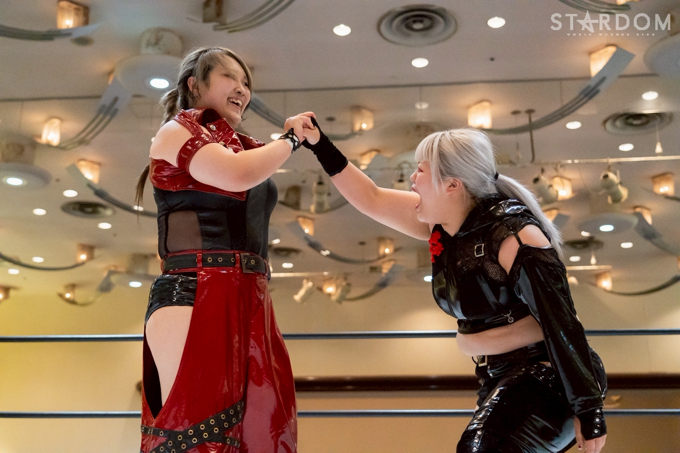 ナツコと青木、琉悪夏と山下が睨み合う。両軍が突進してエルボーの打ち合い、そのまま場外戦に突入する、リング上は吏南がアキラにボディースラム、ヘアーホイップ、コーナーに追い込み顔面を踏みつける。アキラのドロップキック連打にナツコは動じずショルダータックル、その場跳びボディープレス。吏南がアキラにダブルニードロップ。アキラをロープに固定してH.A.T.E.で攻撃を加える。アキラが吏南にエルボー連打で向かっていく。吏南がビッグブーツ、アキラがドロップキック、ビッグブーツをかわしてもう一発。山下が吏南にショルダータックル、相手コーナーに向かっていくが、ナツコがエルボー。山下はナツコと吏南をコーナーに追い込み串刺しボディーアタック、吏南にボディースラム。相手コーナーに上がり、リング下の王者組を威嚇する。吏南が山下の髪を引くが、山下がこらえて反対にヘアーホイップ。山下の突進に吏南が払い腰。琉悪夏が山下に串刺しボディーアタック。ショルダーをぶつけ合い、山下がエルボー。琉悪夏がフェイントをかけてパンチをぶち込む。山下が立ち上がって延髄斬り、琉悪夏がショルダータックル、セントーン。山下がトラースキック、ボディースラム。青木が琉悪夏にダブルニードロップ、串刺しエルボーアタック、ランニングボディープレス。青木が担ごうとするが琉悪夏がフェイント、それを青木がブロック。青木の突進を吏南が妨害し、ナツコと琉悪夏が合体プレス。返した青木に琉悪夏が予告してフィッシャーマンの構え。青木がこらえてエルボーも、琉悪夏がクロスボディー。ナツコが青木に串刺しボディーアタック。青木がラリアットをかわして突進、ナツコがクロスボディー。セントーンを青木がかわしてラリアットを打ち合う。青木が打ち勝ち、串刺しで突進。ナツコがかわして青木にキャノンボール。青木が返すと、ナツコがコーナーへ。山下がカットして青木がデッドリードライブ、両者突進してナツコがラリアット、セントーン。10分経過。青木がナツコにジャーマン、ラリアット。琉悪夏のカットがかわされナツコにセントーン。混戦から青木がナツコのバックを取る。琉悪夏のボックスがかわされナツコに誤爆。吏南が青木と山下にムチ攻撃、アキラがドロップキックで分断、MVLがトリオでキック、青木がフロッグスプラッシュでナツコから3カウントを奪った。