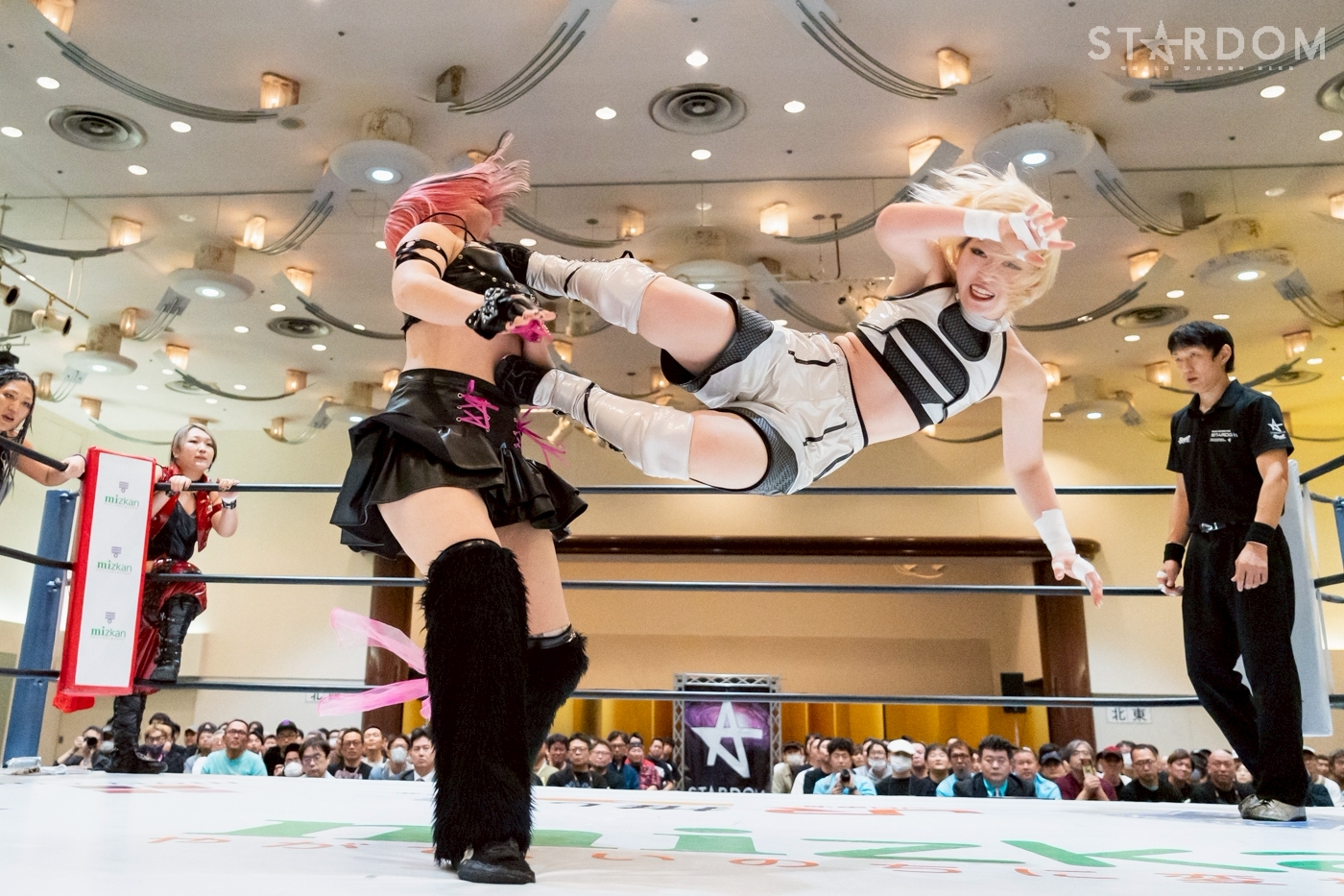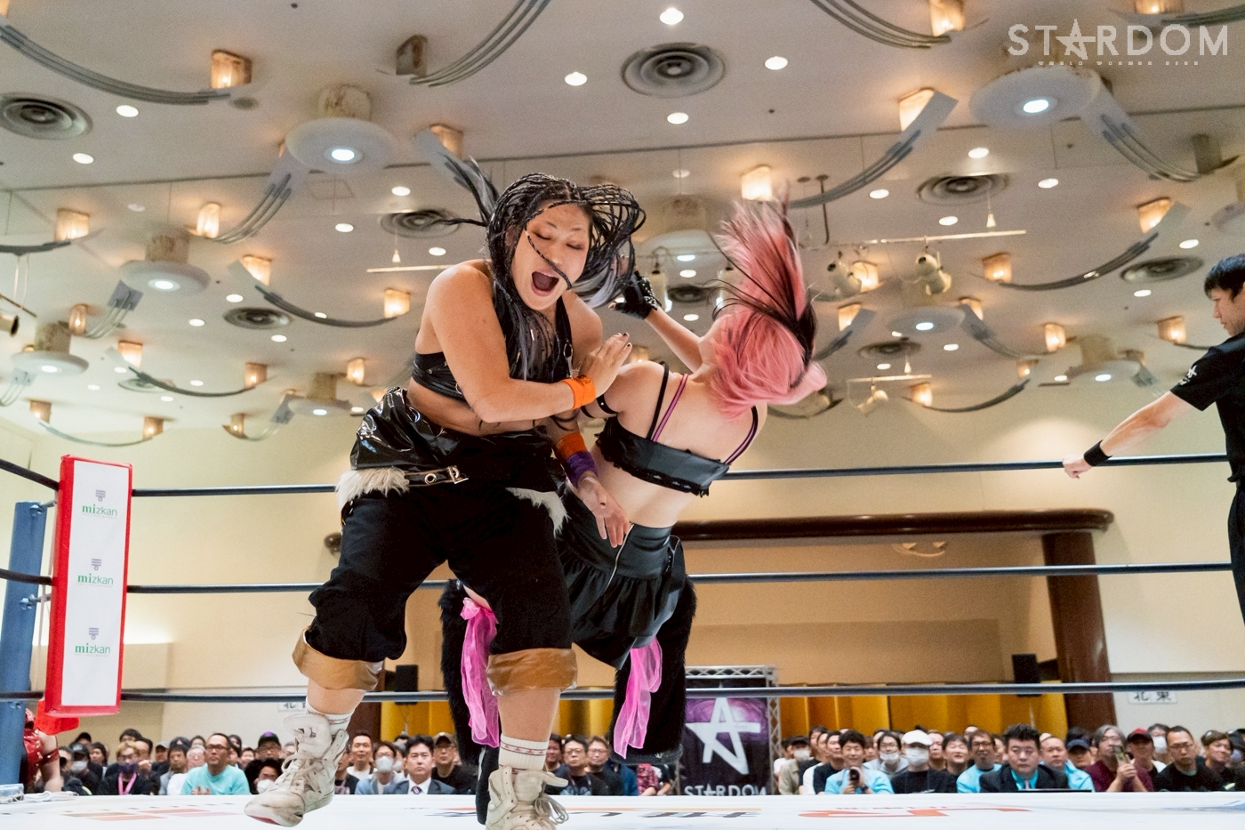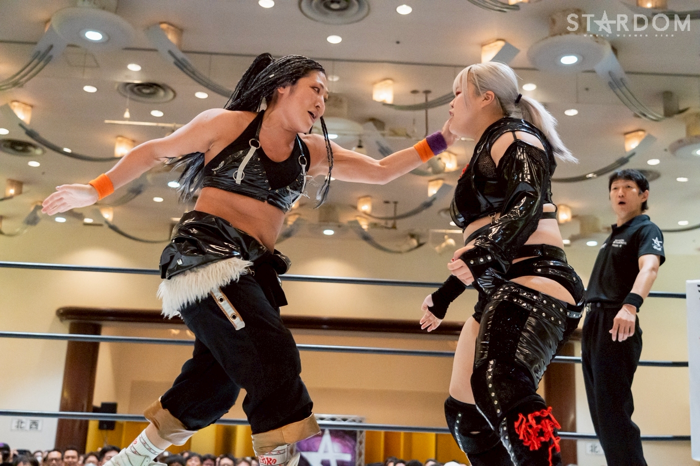 ミ・ヴィダ・ロカの山下りな&青木いつ希&鉄アキラ組とH.A.T.E.の刀羅ナツコ&琉悪夏&吏南組が6人タッグマッチで激突。10・27後楽園ではMVLの山下&青木組がナツコ&琉悪夏組のゴッデス・オブ・スターダム王座に挑戦するため、この試合はタイトルマッチに向けての前哨戦となる。いよいよ開戦なったH.A.T.E.とMVL。大一番に向けて、大荒れ必至の全面対決だ。