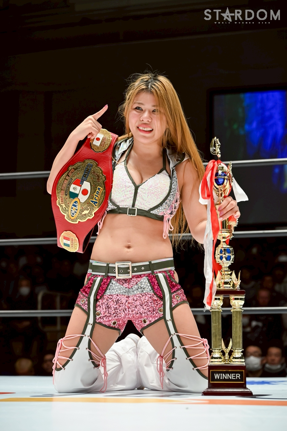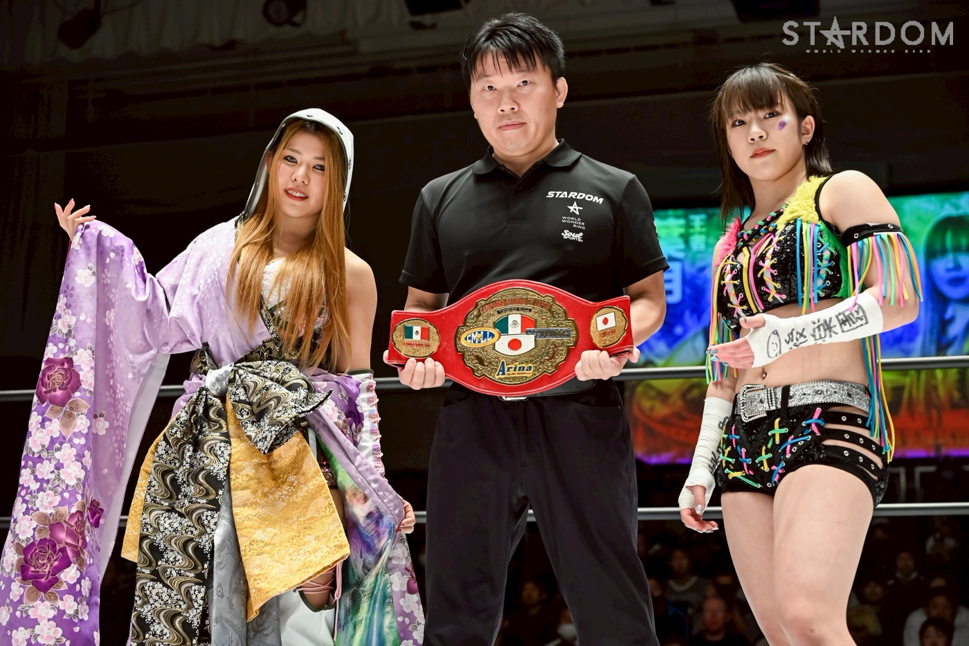 Hazuki: "Mei, thank you for fighting for the CMLL (Japanese Women's Title). With the belt on the line or not, we can have a great match. I look forward to continuing to have you as my rival. And next, there's someone I want to face. I'm nominating you. Olympia, who is currently in Japan from CMLL. I'll be fighting her and defending her title."