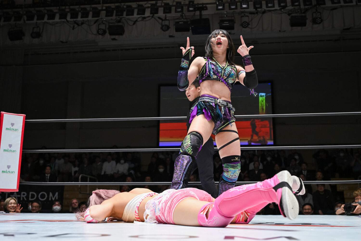 ファイナルロードを歩む鹿島沙希に、〝化け物援軍〟が登場だ。8日(水)「STARDOM NIGHTER in KORAKUEN」(後楽園ホール)ではハンディキャップマッチに出場。朱里との凹アネコン凸で、妃南&レディ・C&稲葉ともか&八神蘭奈&虎龍清花と対戦した。