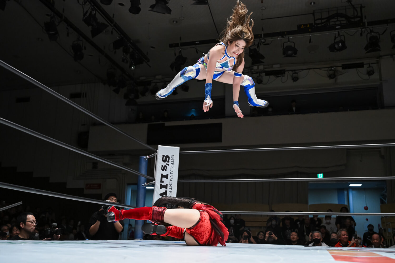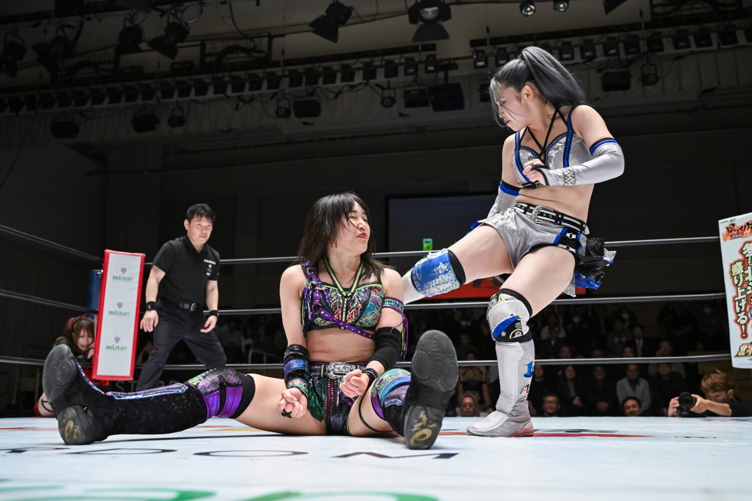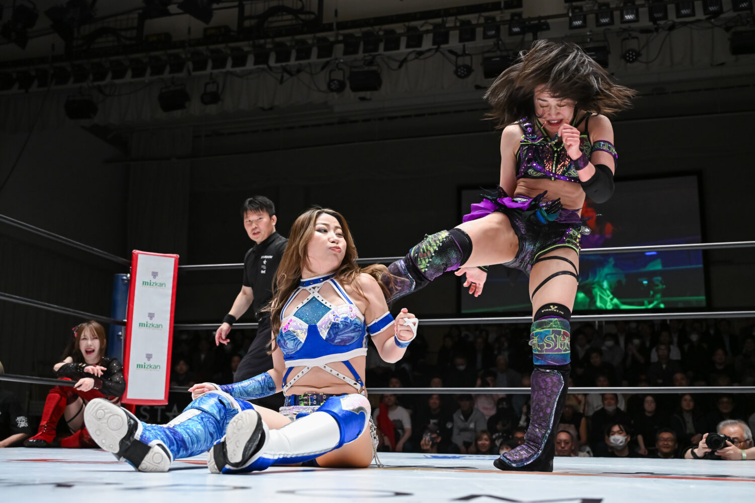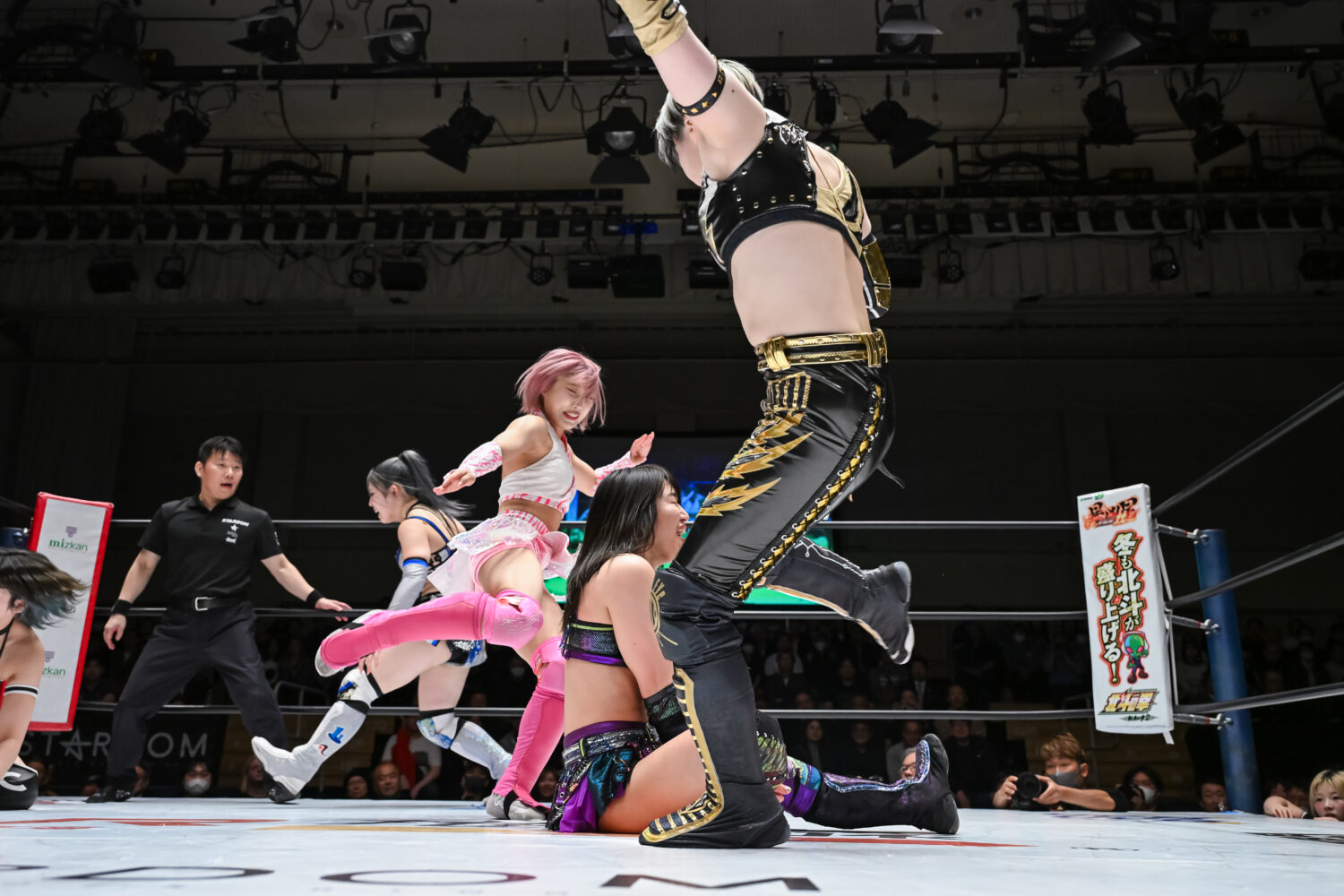 何とか妃南がダウンした隙にリングインしたものの、またたく間に敵軍に捕まってしまう。大「沙希」コールに包まれる中、トレイン攻撃をくらう鹿島。すると見かねた高橋がリングインし、「パッション!」とビンタでなぎ倒す。これで息を吹き返した鹿島もプランチャを成功させた。