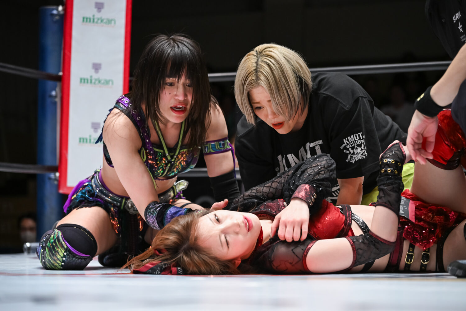 試合は鹿島が電光石火の起死回生をレディに狙うが、敵軍全員からカットに入られてしまう。その後は朱里が孤軍奮闘。朱里の上にボディースラムで叩きつけられた鹿島は悶絶するばかりだ。