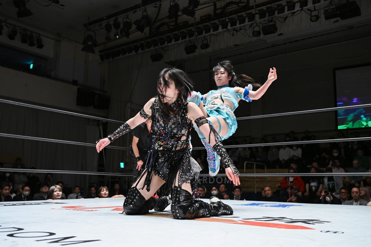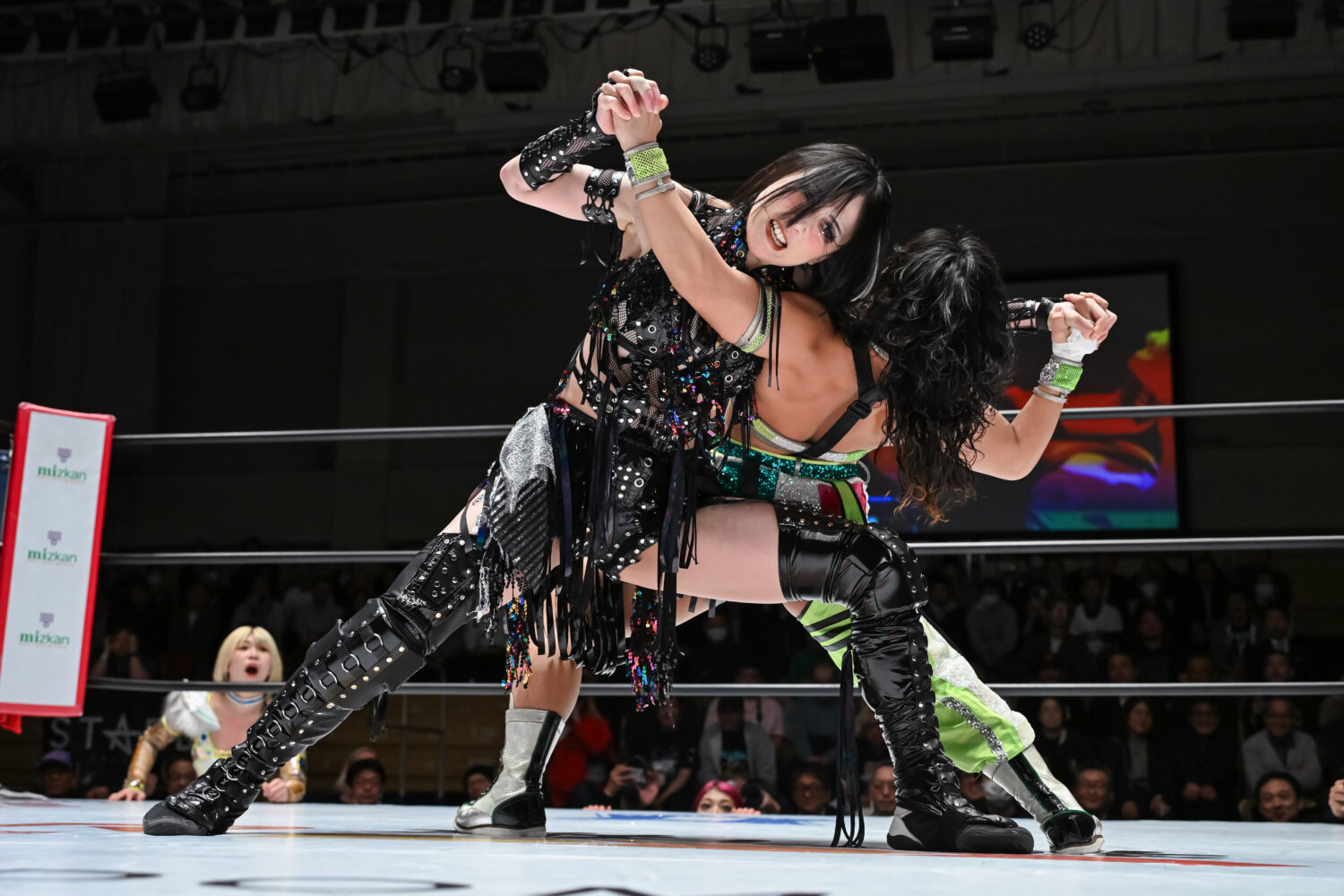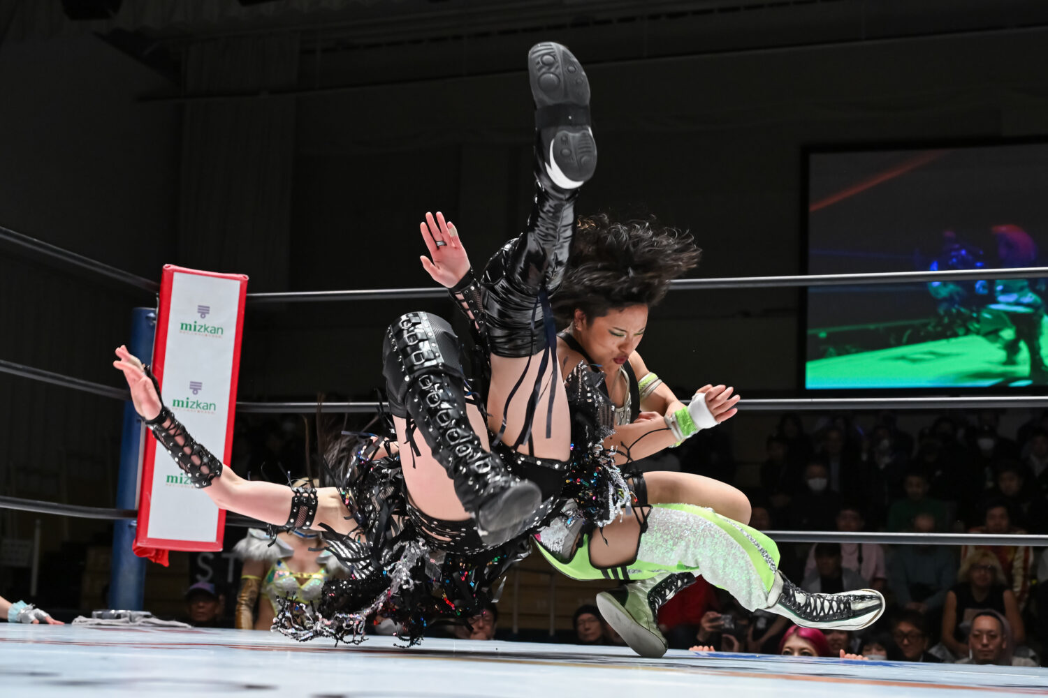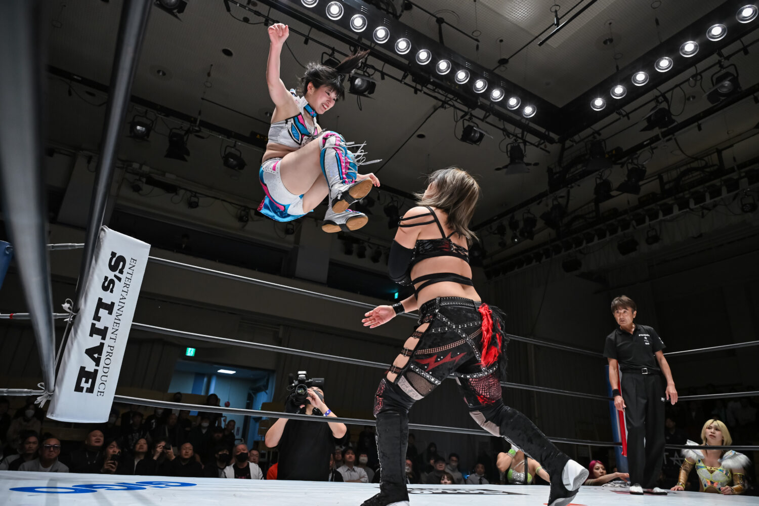 一歩も譲らぬ攻防を展開すると、4・26横浜アリーナのV10戦で迎え撃つ玖麗との前哨戦へ。激しいエルボー合戦から、ドロップキック合戦を繰り広げた。