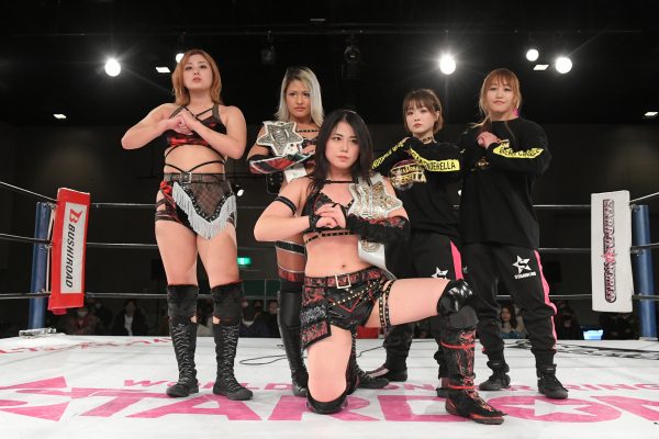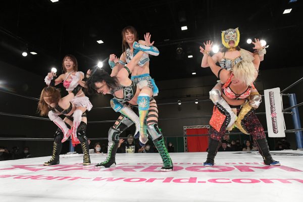 先発に詩美とジュリアが名乗りを挙げ、王者対決で試合開始。探り合いからジュリアがバックを取ってグラウンドへ。詩美が反転するがジュリアがネックロックから腕を取って捻りあげる。詩美が取り返すとジュリアが切り返してヘッドロック。力比べで詩美が押し倒し腕を取るとヘッドロック。ジュリアがヘッドロックからグラウンドに持っていくが詩美が脱出。上谷と舞華が入るとエルボーの打ち合いに。上谷がコーナーに追い込みストンピング乱打。舞華が突進すると上谷はバック宙で攪乱しドロップキック。上谷はボディースラムから舞華の背中へドロップキック。詩美が舞華に豪快なボディースラム。桃を呼び込みダブルで舞華を叩きつける。上谷も加わりトリオで攻撃。舞華が返すと、詩美がフロントネックロック。桃が舞華をコーナーに振り串刺しドロップキックの連打。舞華が返すと桃はネックロックからヘッドロックへ。ジュリアがカットすると詩美が追い出す。桃は舞華へのエルボーを連打。桃が仁王立ちで舞華のエルボーを受けて立つ。桃が連打し舞華を倒す。舞華は桃にロックボトム。ジュリアが桃にビッグブーツ。QQがジュリアに襲いかかるとジュリアは詩美と上谷にまとめてDDT、桃にもDDTを放つ。ジュリアはビッグブーツから桃にネックブリーカー。桃はブレーンバスターをカットしドロップキック、裏投げ、PK。ジュリアが返すと、桃は詩美に託す。詩美がジュリアにショルダータックル連発、ショルダースルー、背中へのドロップキック、スリーパー。しかし、DDMがカット。ジュリアは詩美にニーの連打、舞華とひめかが投げてジュリアがドロップキック。DDMが3人で詩美にヒップドロップ。ジュリアは詩美にSTFを極める。10分経過。詩美がエスケープすると、ジュリアは「まだまだ!」と叫んでミサイルキックを投下。ひめかが詩美に串刺しボディーアタック。もう一発ボディーアタックを放ち逆片エビ固めにもっていく。しかし詩美がロープに到達。ひめかが突進し背後からニー。詩美が返すと、ひめかはアルゼンチン狙い。詩美がこらえて反対にアルゼンチンの構え。ひめかが回避しラリアットの打ち合い。両者ダウンも、ひめかが先に立ち上がってラリアット。ラリアットの打ち合いで両者ダウン。上谷が舞華に二段蹴り、ミサイルキック。舞華が柔道の投げ技を連発。上谷が返すと、舞華がダッシュ。詩美が投げて桃が蒼魔刀、上谷がその場跳びムーンサルト。15分経過。上谷が舞華にニールキック。舞華を引き起こすとスタークラッシャー狙い。こらえられるがフィッシャーマンを決める。上谷はコーナーに上がるが舞華が追いつき雪崩式ブレーンバスター。ひめかが上谷にバックドロップ、ジュリアがドロップキック。舞華がジュリアのアシストを得てラリアット。しかしQQがカットに成功。DDMがQQを分断。舞華が上谷をSTOで押し倒すが2カウント。舞華は上谷を引き起こし炎華落とし。3カウントが入り、舞華が上谷からフォールを奪った。