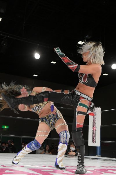 舞台で競演した“姉妹タッグ”ドンナ・デル・モンドの朱里&なつぽいと、コズミックエンジェルズでアーティスト・オブ・スターダム王座を奪取したばかりの中野たむ&ウナギ・サヤカがタッグで対戦。中野&ウナギは白川とのトリオで翌日の12・20大阪でSTARSの岩谷麻優&スターライト・キッド&ゴキゲンです☆組を相手に初防衛戦。この試合はタイトルマッチであることはもちろん、STARSの内紛を清算し答えを出す闘いでもある。大事な試合を前に、中野とウナギが“モノが違う女”朱里となつぽいを相手にどんな闘いを展開するか?