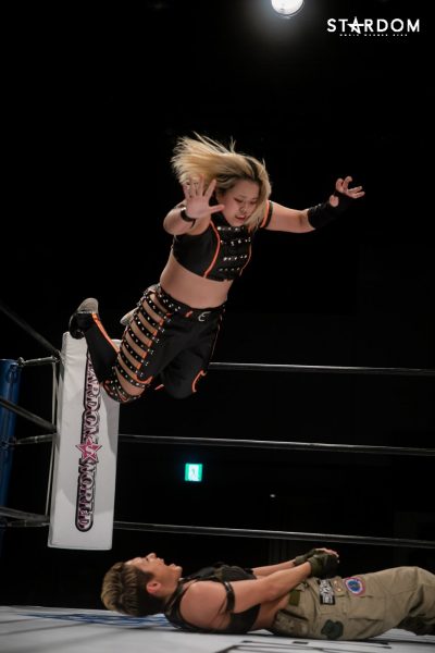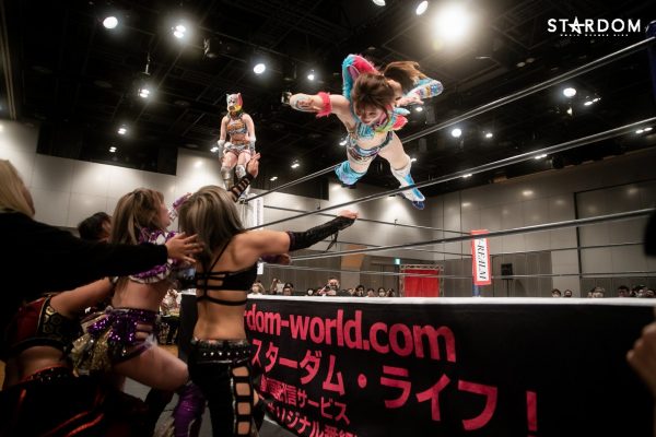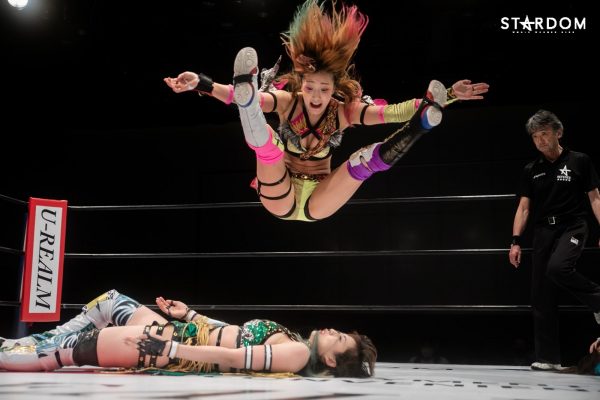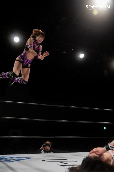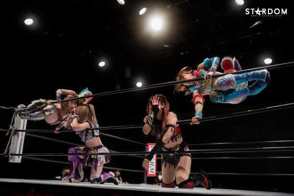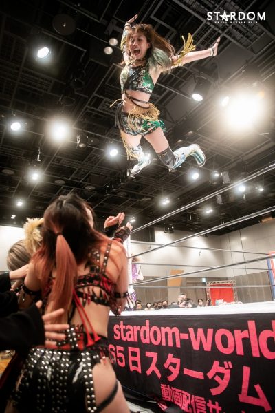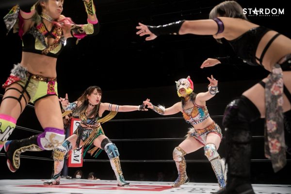 詩美の選手コール後にはなぜかリングサイドにいた朱里が「詩美ぃ~!詩美ぃ~!」と熱い声援を贈り、ナツコに「うるせぇ!」と怒鳴られて退散。キッド、上谷、ウナギ、小波の4人でゴングが鳴ると、4人での手4つからキッドと上谷、ウナギと小波が激しいロープワークを展開し、混戦となる中で上谷が側転ドロップキックでウナギ&キッドを吹き飛ばす。そしてAphroditeがウナギにコンビネーションアタックを仕掛けていき、ダブルのドロップキックで締めてから上谷がフットスタンプ。これはキッドがカットし、上谷のバイシクルキックをかわしてドロップキック。さらに岩谷を呼び込み、2人でトレイン攻撃からダブルのバカタレスライディングキックを狙うが、大江戸隊が場外から2人の足を弾いて妨害。STARSと大江戸隊が場外戦へ。その隙にコズエンがリングに飛び込み、上谷にロープワークを駆使したコンビネーションアタック。たむはソバットからロープに飛ぶが、上谷はドロップキックでカウンターして詩美にタッチ。詩美はたむにドロップキックからアルゼンチン・バックブリーカーを狙うが、たむが着地してスピンキック。これをかわした詩美は改めて担いでバックフリップ。これは残る3組が総出でカット。ナツコ&小波が岩谷&キッドをロープに振っていくが、MK☆Sistersが同時のドロップキックで蹴散らしていく。しかし小波が2人をコーナーに重ね、ナツコが2人まとめてのキャノンボールを狙うが、詩美がドロップキックでカットし、2人がかりの攻撃を狙うナツコ&小波をドロップキックで排除。詩美を相手に岩谷とたむが共闘して2人でコンビネーションを仕掛けるが、たむがフォールに入ると岩谷がたむごとフットスタンプで踏み潰してカット。岩谷とたむのエルボーの打ち合いとなり、たむが怒涛の連打を見せるが岩谷はソバットで反撃。ここに詩美が飛び込んできてカットし、たむと2人で岩谷をロープに振ろうとするが、岩谷はロープを踏み台にしたアームドラッグで2人まとめて投げ飛ばし、MK☆Sistersが619&その場飛びムーンサルト・プレスの競演。岩谷はキッドにタッチ。キッドは詩美をコルバタで放り捨て、串刺しドロップキック。さらにキッドは詩美へランニングエルボーを発射も、これをかわした詩美がスリーパー。その背後から小波が詩美にスリーパーで捕らえ数珠つなぎとなるも上谷がカット。Aphroditeは小波に連携を狙うが、小波は上手くかわして詩美をカニバサミで倒し、詩美にリバース・インディアン・デスロック。さらにカットに来た上谷を捕らえてブレーンバスターで叩きつけて2人同時にダメージを与える。ナツコが加勢に入ると2人をヘアホイップでロープ際に放り捨て、小波とともに顔面ウォッシュの競演。さらに小波が詩美にフィッシャーマンズ・スープレックス・ホールドも、たむがカット。小波がロープに飛ぶとキッドが追走ドロップキック。キッドがロープに飛ぶとたむが追走ドロップキックからジャーマン・スープレックス・ホールド。さらにたむは小波にスピンキックも、キッドがたむにスリングブレイド。4人がリング上で大の字になり、全員タッチ。岩谷、ナツコ、上谷、ウナギの対面となると、ナツコが1vs3の大立ち回りを演じていき、岩谷とナツコのエルボー合戦一騎打ちに。互いに雄叫びを上げながらのヘッドバッドを正面衝突させてふらついたところで上谷がニールキックで2人まとめてなぎ倒すが、ここにウナギが飛び込んできて上谷にXファクターから拙者、蒲焼き者で候。さらにウナギは上谷を大ふへん固めに捕らえるが、岩谷がハイキックでカットし、「上谷!バカタレ!」と叫んで上谷にバカタレスライディングキックからノーザンライト・スープレックス・ホールドで叩きつけてからコーナーに上がり、ダイビングダブルフットスタンプ。さらに岩谷はキッドとともにコーナーに上って龍星を狙うが、ナツコが「させるか!」とカットに入りキッドを場外に突き落としてから岩谷へデッドリードライブ。小波が岩谷と上谷を重ねてセットし、ナツコが2人にまとめてキャノンボール。さらにナツコ&小波が上谷に合体フェイスバスターを見舞い、ナツコが昇天を決めるもたむがカット。ここへさらに岩谷が飛び込んできてたむとエルボー合戦を繰り広げるも、ウナギが岩谷へビッグブートを見舞い、たむが岩谷へバイオレット・シューティング、ウナギが拙者、蒲焼き者で候と岩谷へ集中攻撃。ここへキッドが割って入り、コズエンにダブルのヘッドシザースホイップを見舞って場外に排除するも、ナツコが突っ込んできてキッドにスピアー。Aphroditeがナツコに飛びかかるが、ナツコは2人の髪を掴んで引き回し、ロープへ飛んでいくが、Aphroditeがダブルのドロップキックで迎え撃ってからマジックキラー。さらに上谷がナツコにスター・クラッシャーを決めるも小波がカット。詩美が小波を場外に排除し、「上谷!登れ!」と指示。上谷がロープを踏み台に場外ダイビングクロ