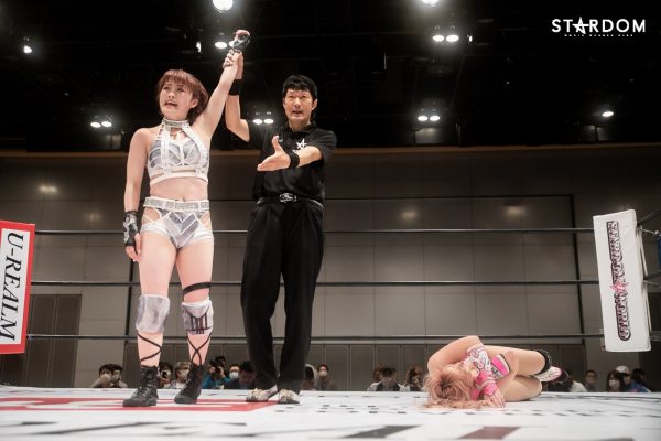 試合前に朱里が握手を求めていくが、緊張した面持ちの妃南はこれを拒否。ゴングが鳴ると手4つから朱里がグラウンドに引き込んでいき腕を狙うが、妃南もこれにしっかり食らいつきながら足を取りに行く。一旦離れてから再び手4つで組み合い、首相撲から朱里がヘッドロックに捕らえ、ショルダータックル。さらに朱里は首投げからサッカーボールキックを叩き込み、妃南をロープにくくりつけながらスタンド式のキャメルクラッチ。さらに腰へのミドルキックから連続エビ固めで妃南のスタミナを奪ってから逆エビ固め。妃南がロープに逃れようとすると腰を落としながらの逆片エビ固めに捕らえるが、妃南はなんとかロープを掴む。朱里はコーナーで妃南の顔面を踏みつけていくが、妃南も意地のエルボー連打からレインメーカー式払腰。さらに巴投げから腕十字。朱里は腕が伸び切ってしまい悲鳴を上げるがなんとかロープに足を伸ばしてブレイク。妃南はエルボー連打で攻め込むが、朱里はショットガンドロップキックから串刺しニー、DDTと連撃。さらにエルボーを発射も、妃南がこれをキャッチして大外刈り。さらに再び腕十字も、朱里が上体を起こしながら足を取りヒザ十字へと捕らえる。妃南がブレイクすると、朱里は首相撲からニーリフトを連打し、串刺しエルボーを発射も、妃南が回避して串刺しドロップキックから大外刈り。さらに「上げるぞ!」と担ごうとするが、朱里が耐えてハーフハッチ・スープレックス。さらにサッカーボールキック、PKを決めてから山折りを狙うが、妃南は着地して外道クラッチ。これをキックアウトした朱里は変形STOからサソリ固めに捕らえ、リング中央でどっしり腰を落として妃南からタップを奪った。